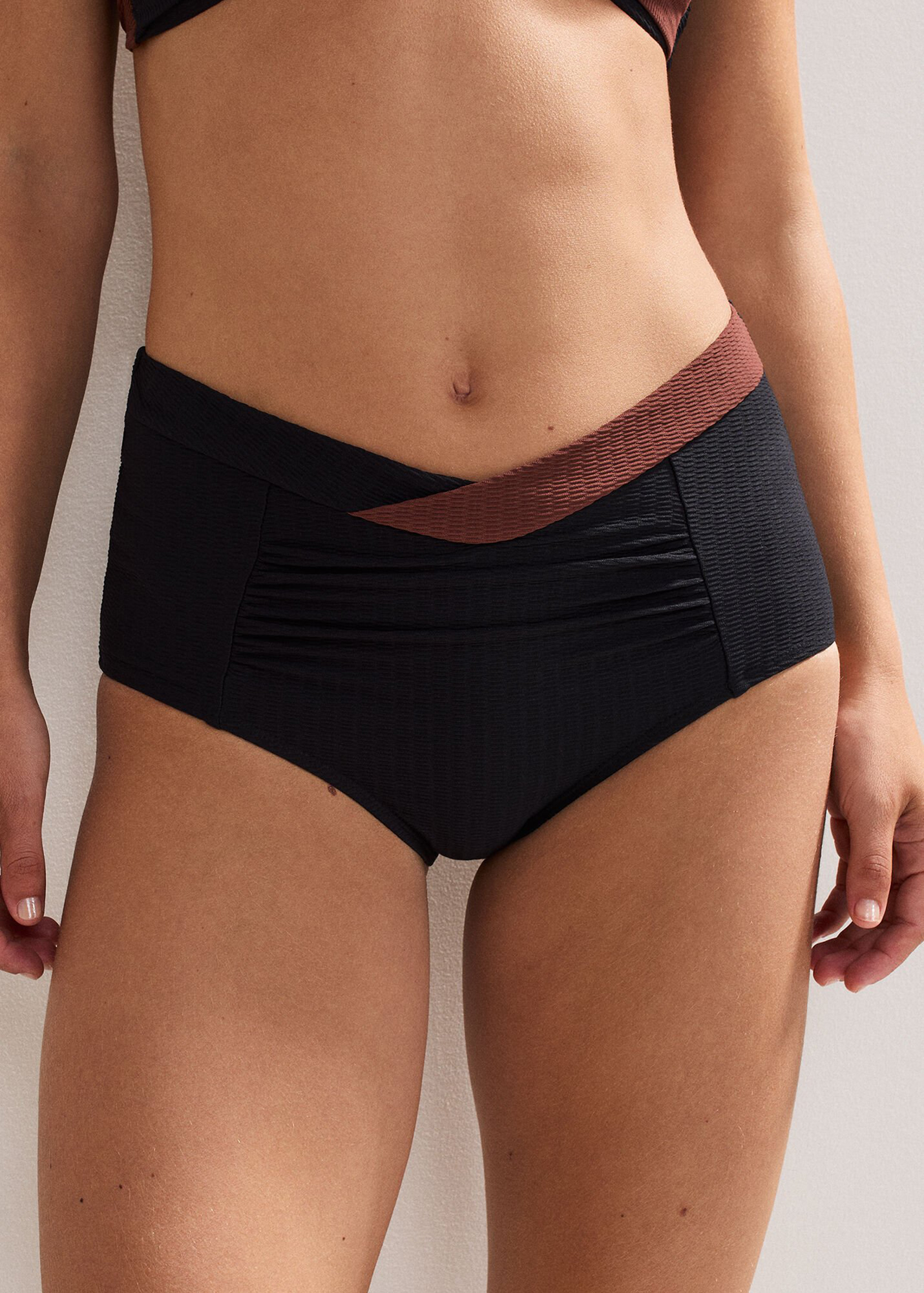 Get ready with our colourblock bikini. The subtle V-shape and ruching at the front creates a flattering fit to create a staple swim piece for your holiday wardrobe. Pair with our matching bikini top for a coordinated poolside look.