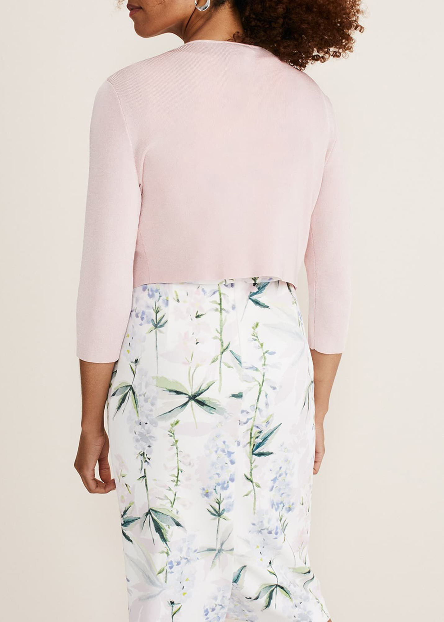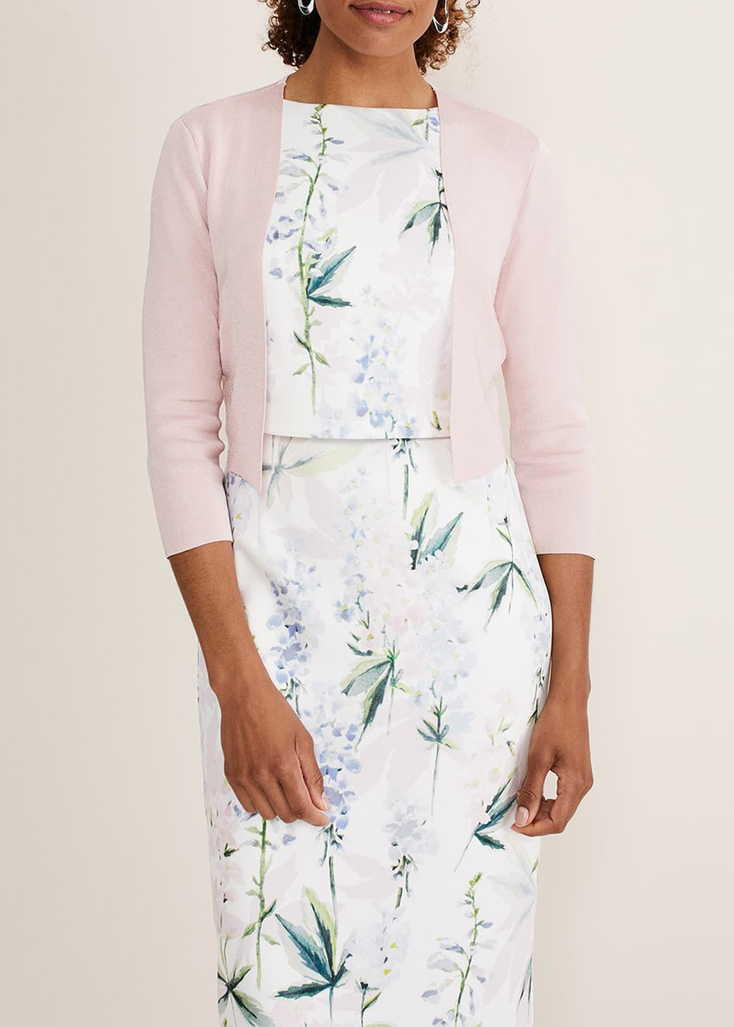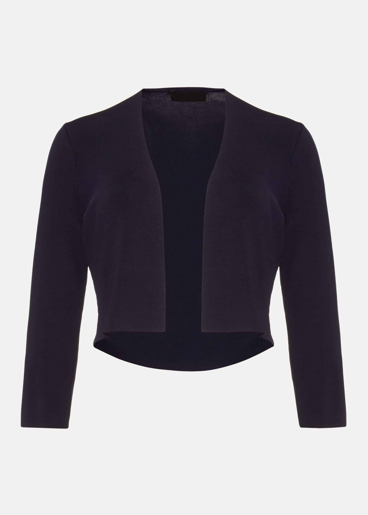A smart structured knit jacket with an open front, pleats at the shoulder and 3/4 length sleeves. This cropped design is collarless and has a clean, boxy fit.