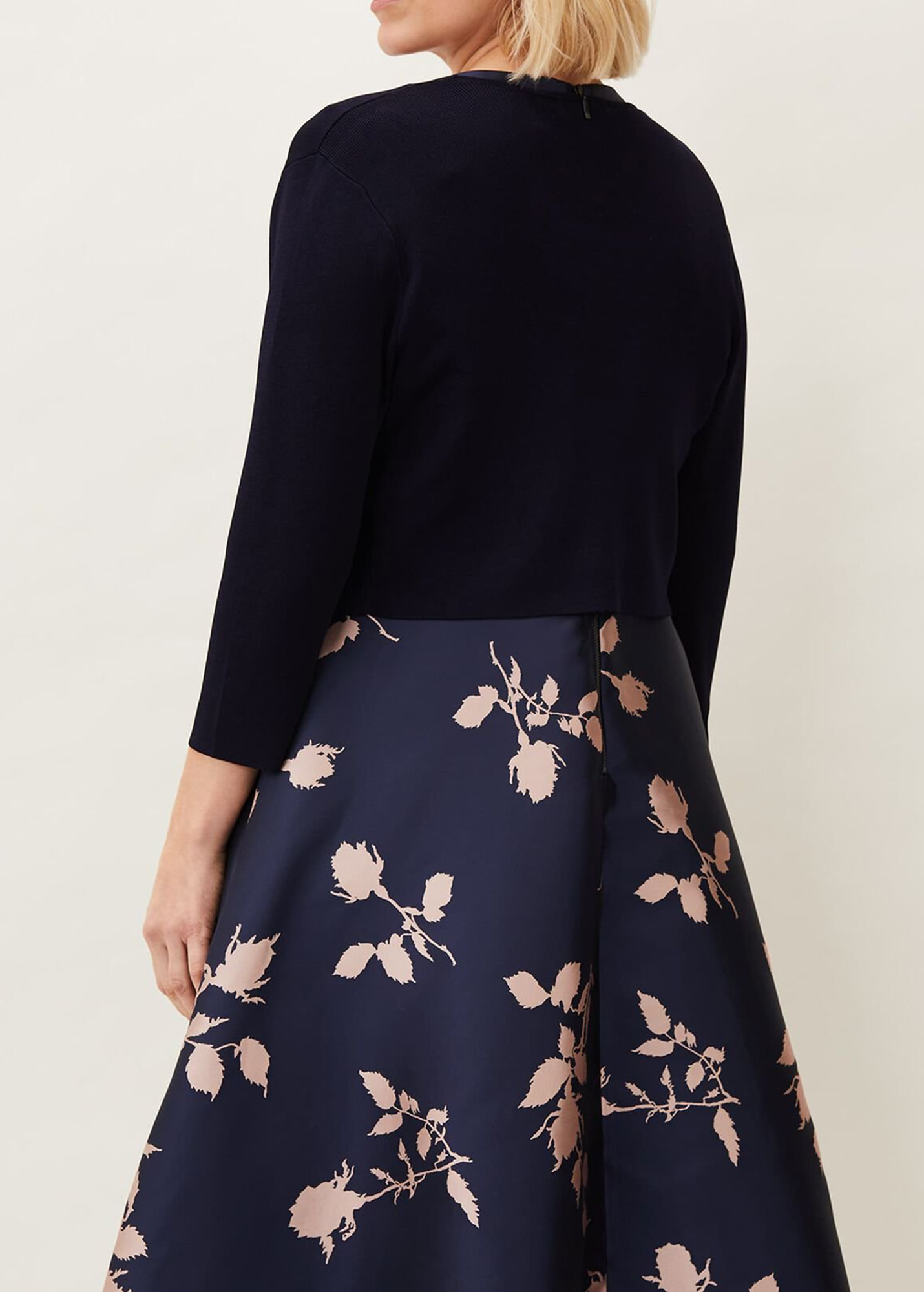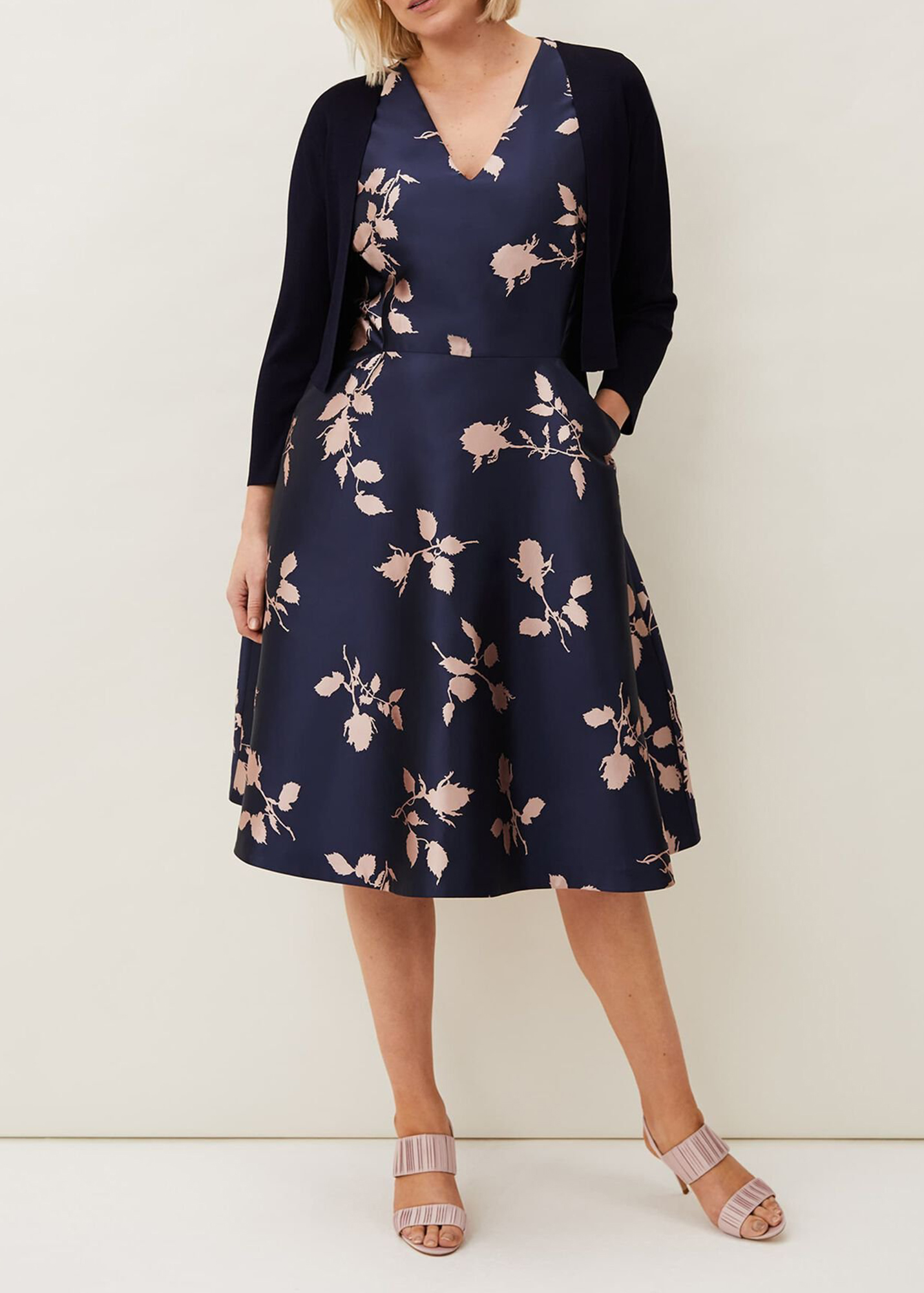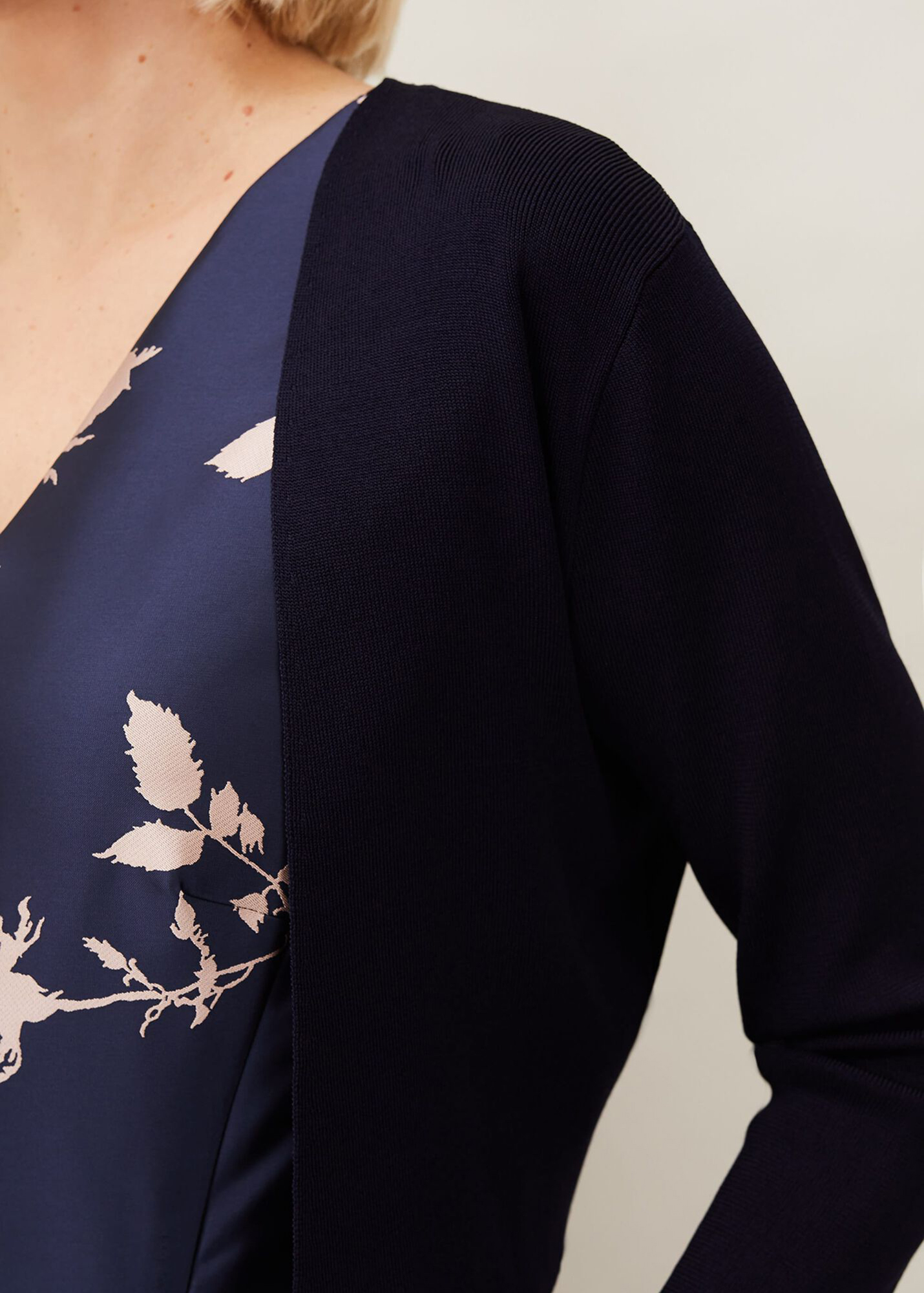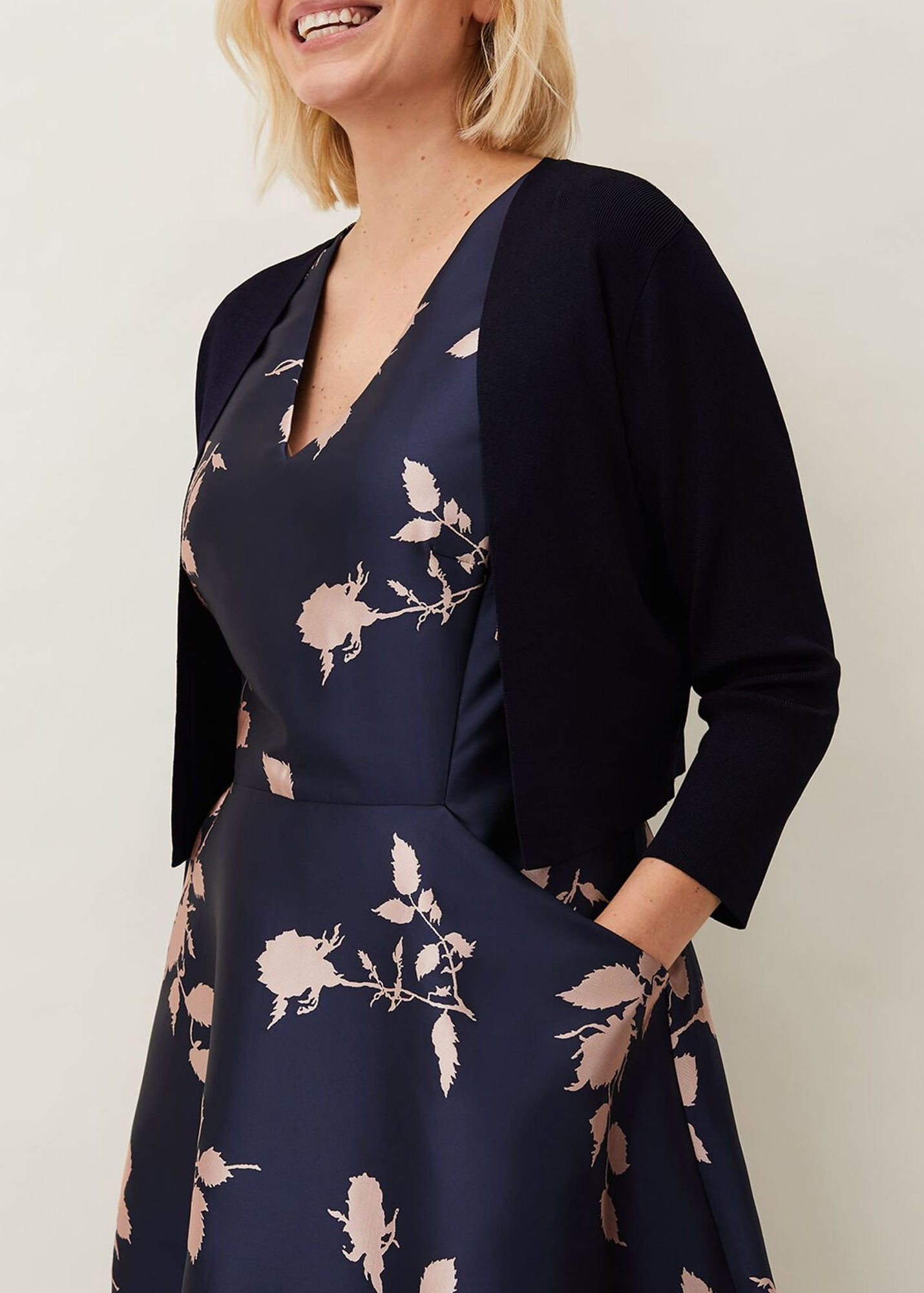 A smart structured knit jacket with an open front, pleats at the shoulder and 3/4 length sleeves. This cropped design is collarless and has a clean, boxy fit.