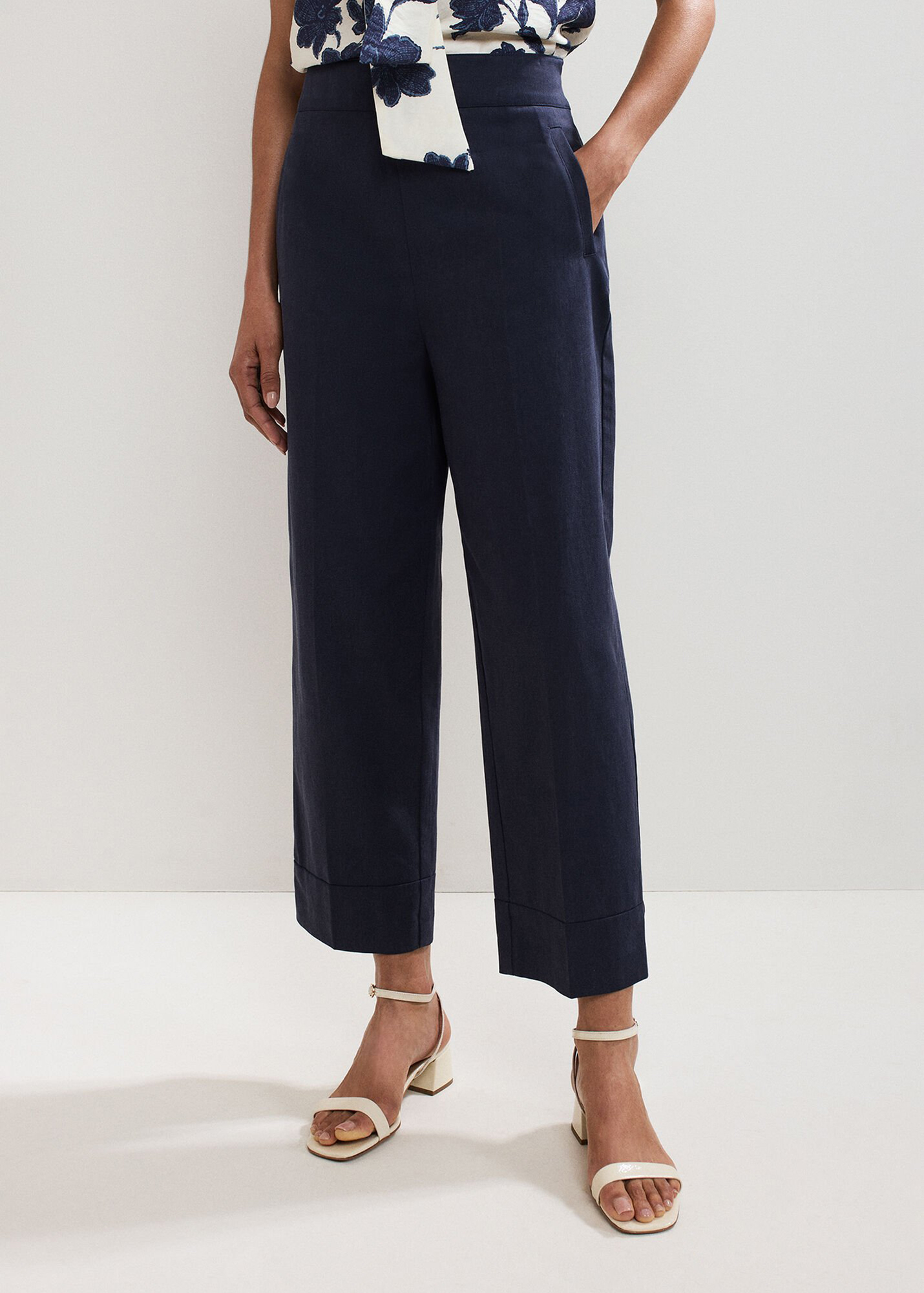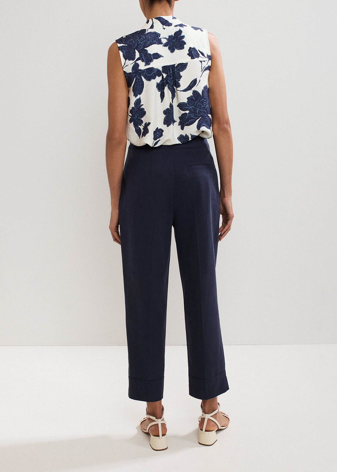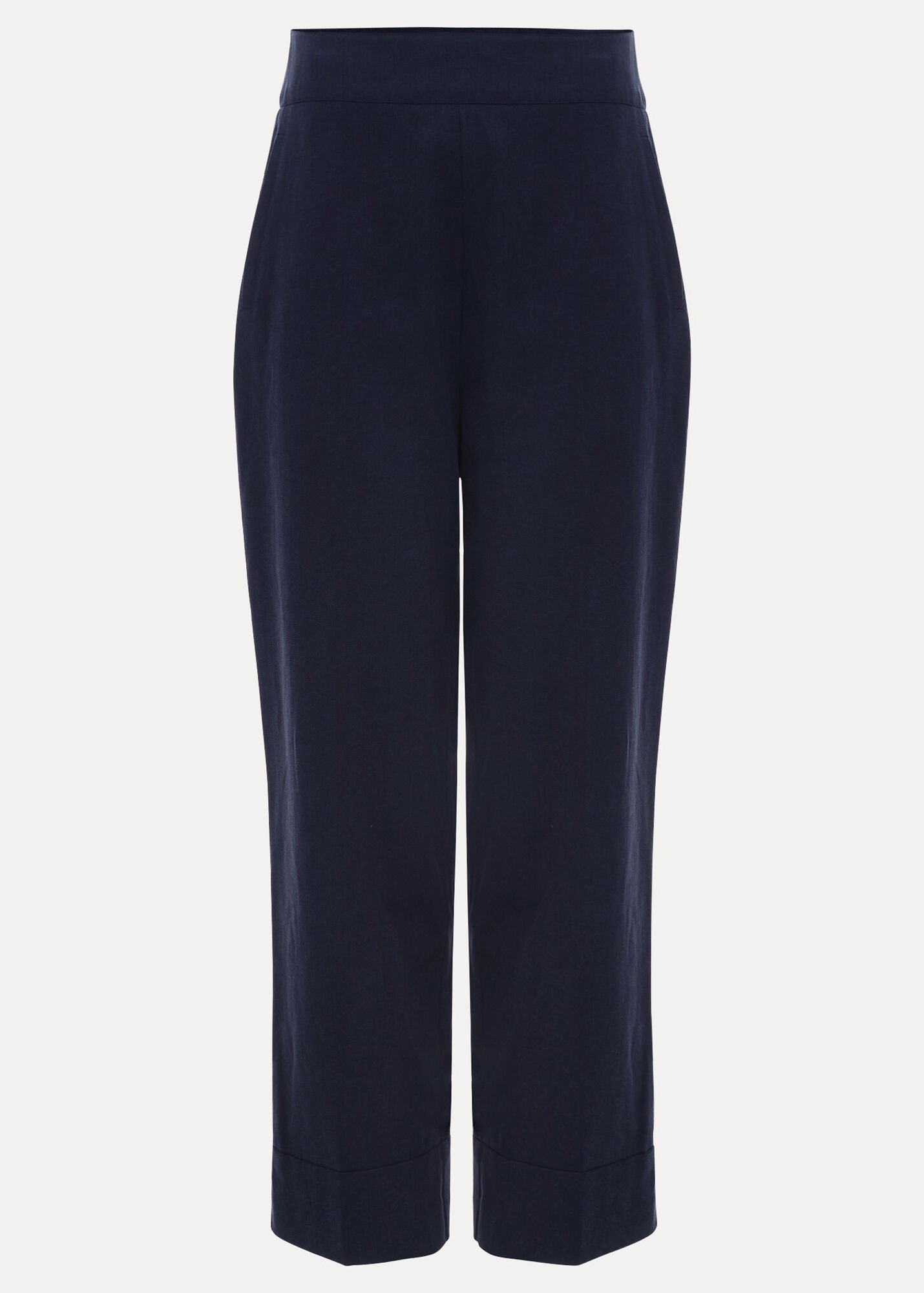 Every woman needs a classic pair of smart, 100% cotton trousers in her wardrobe. Designed for versatility and comfort, these navy trousers are a timeless cigarette shape. With expertly placed darts and a modern crop at the ankle, great for styling for both work and the weekend.