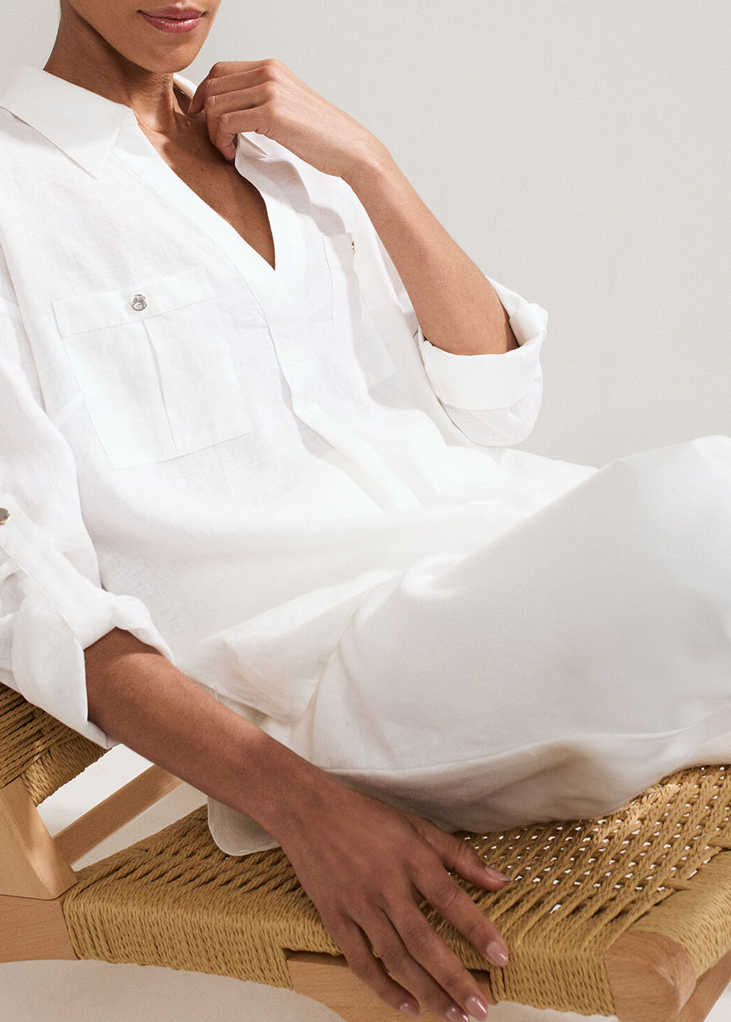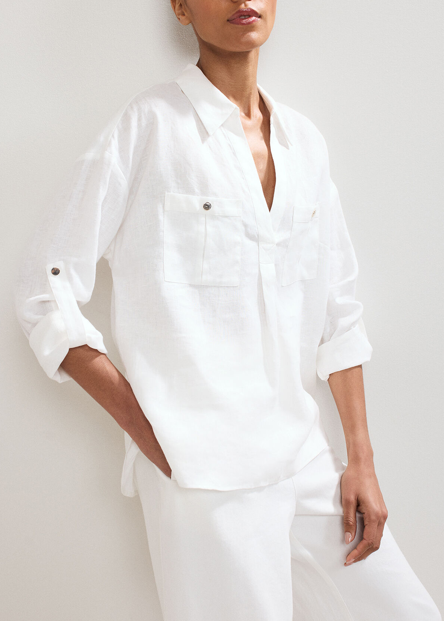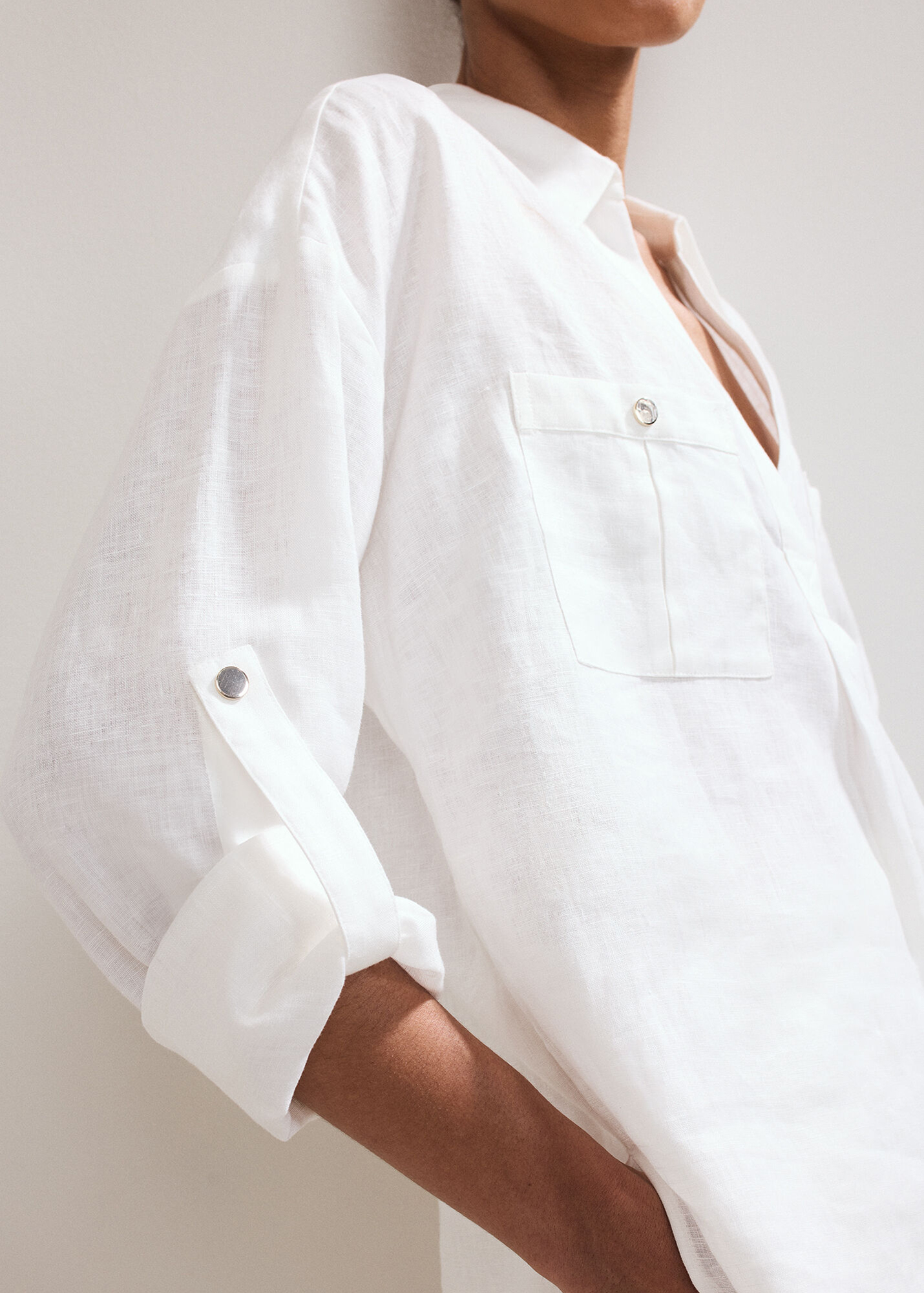 This effortless linen shirt will become a staple in your wardrobe. The classic shirt silhouette is updated with patch pockets and button detailing on the arms for versatile styling options. Crafted from 100% linen, designed to minimise creasing, this style is perfect for warm days.
