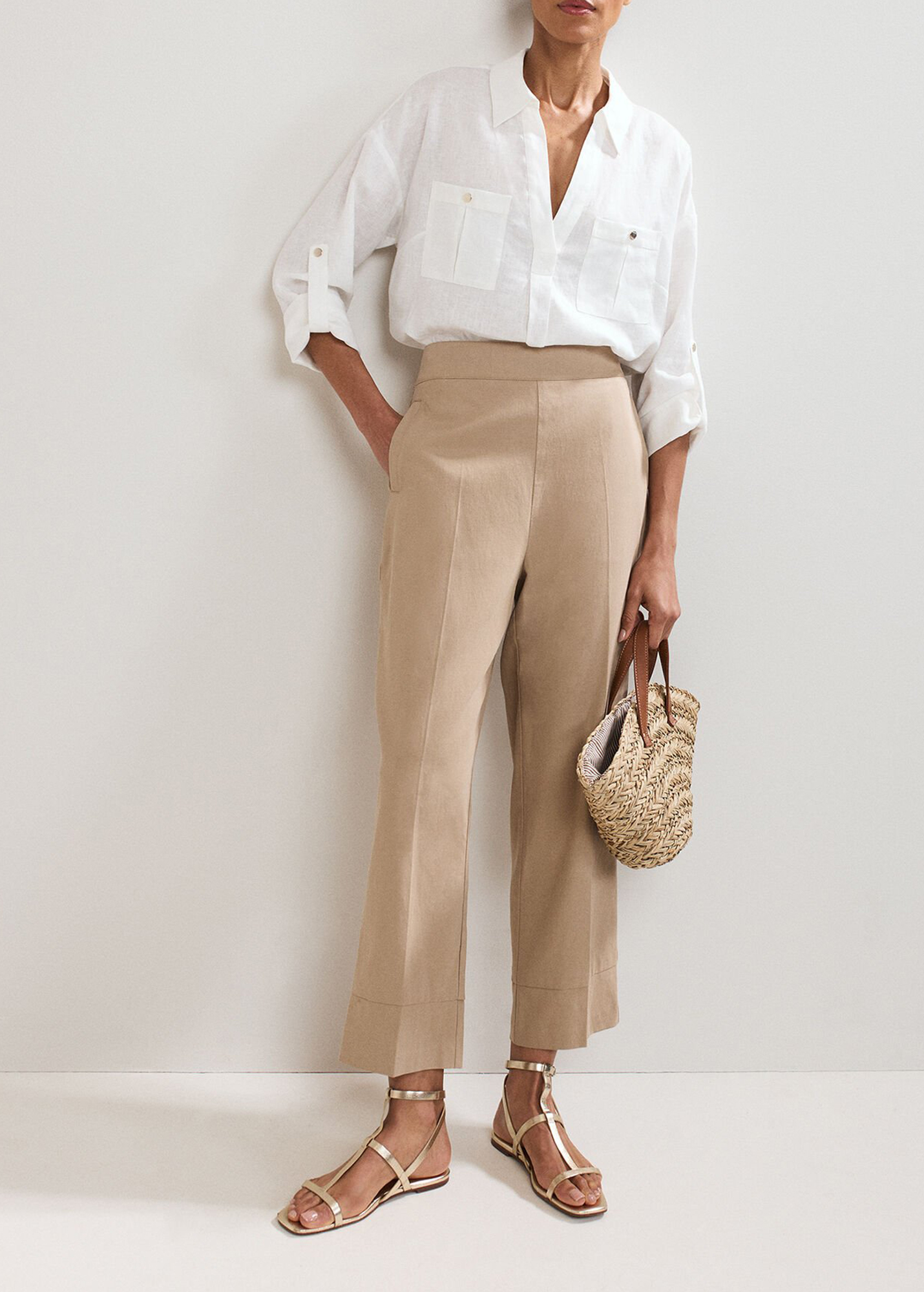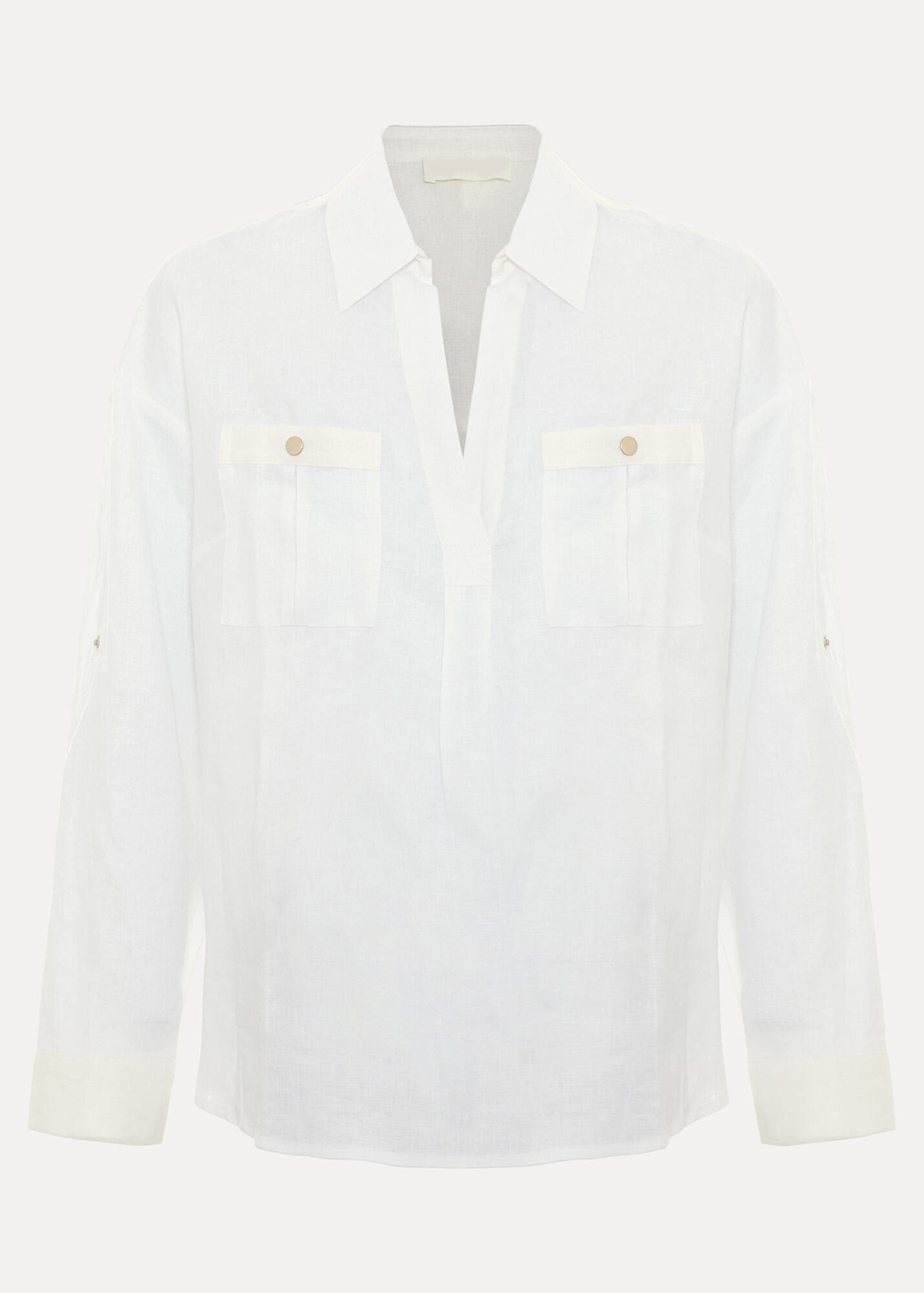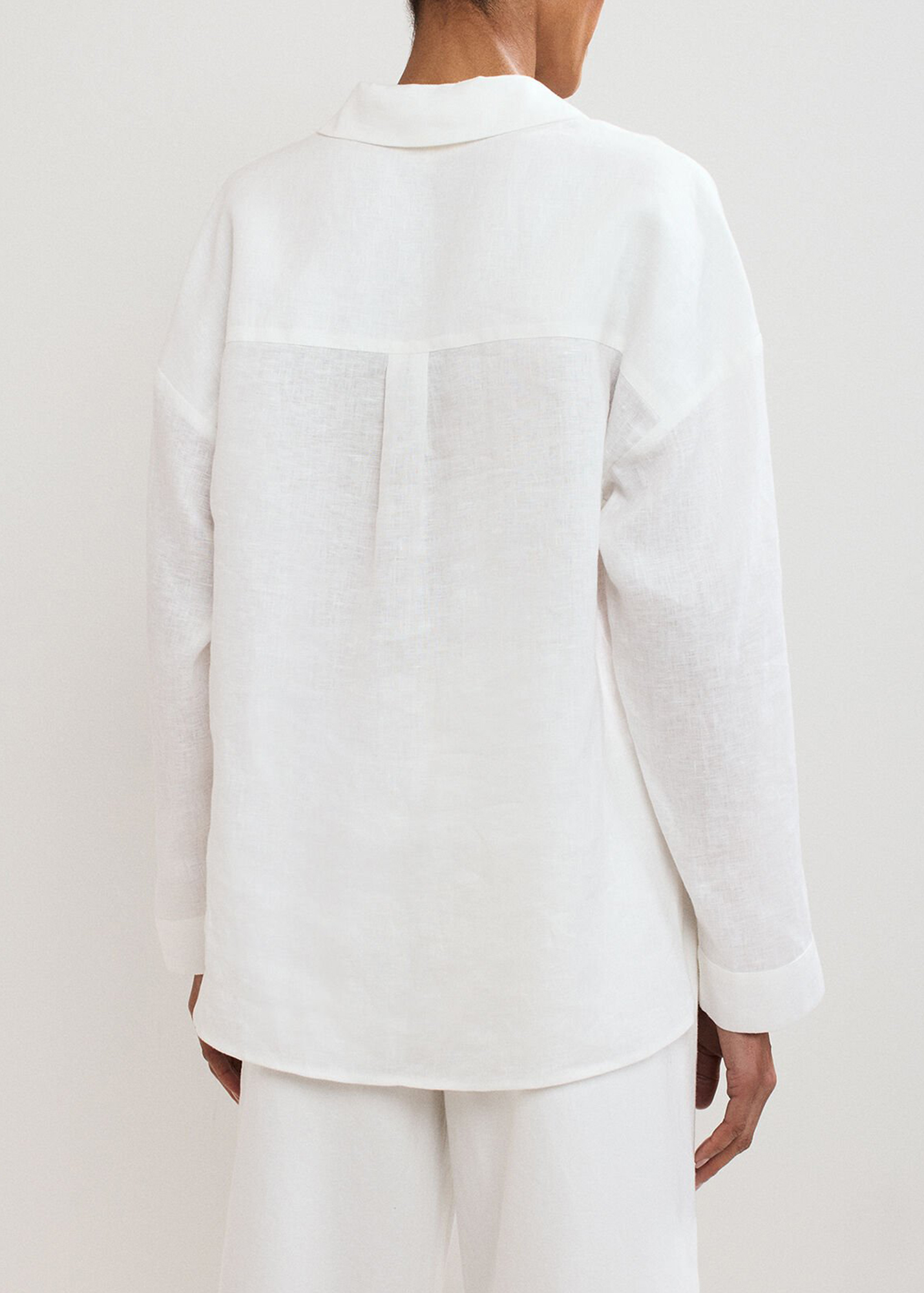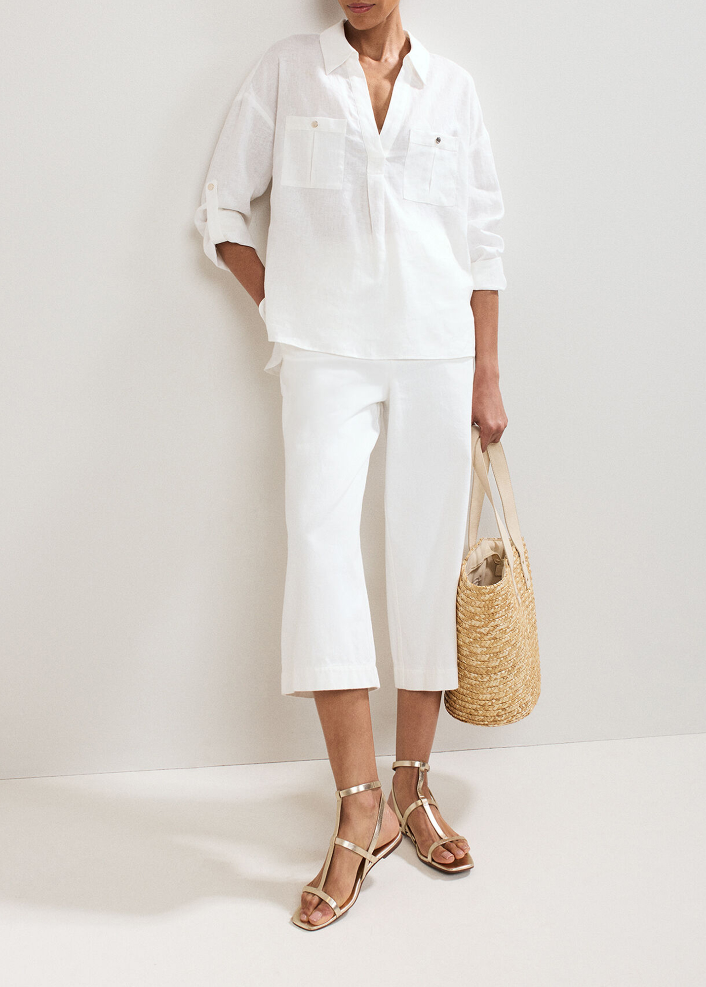 This effortless linen shirt will become a staple in your wardrobe. The classic shirt silhouette is updated with patch pockets and button detailing on the arms for versatile styling options. Crafted from 100% linen, designed to minimise creasing, this style is perfect for warm days.