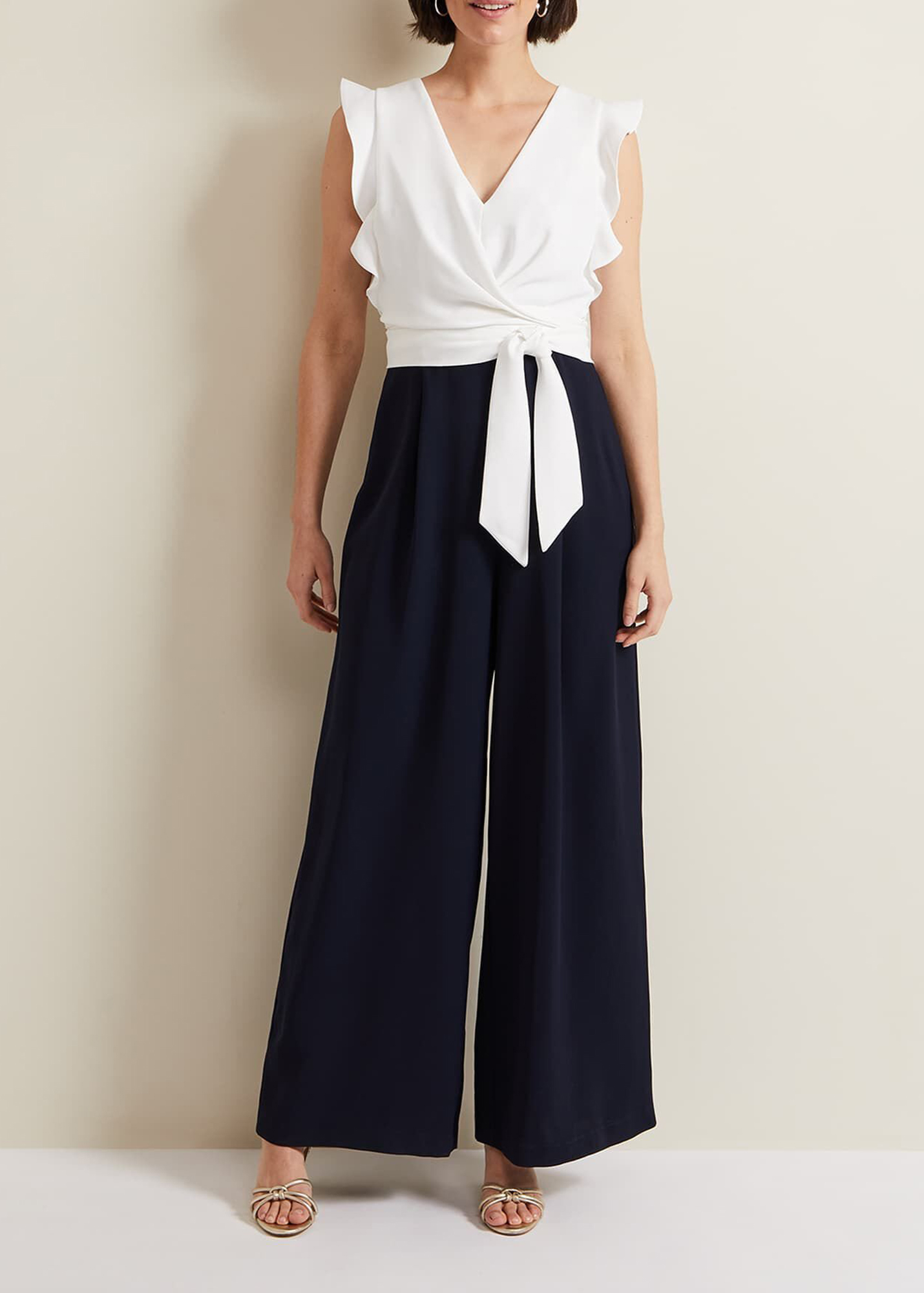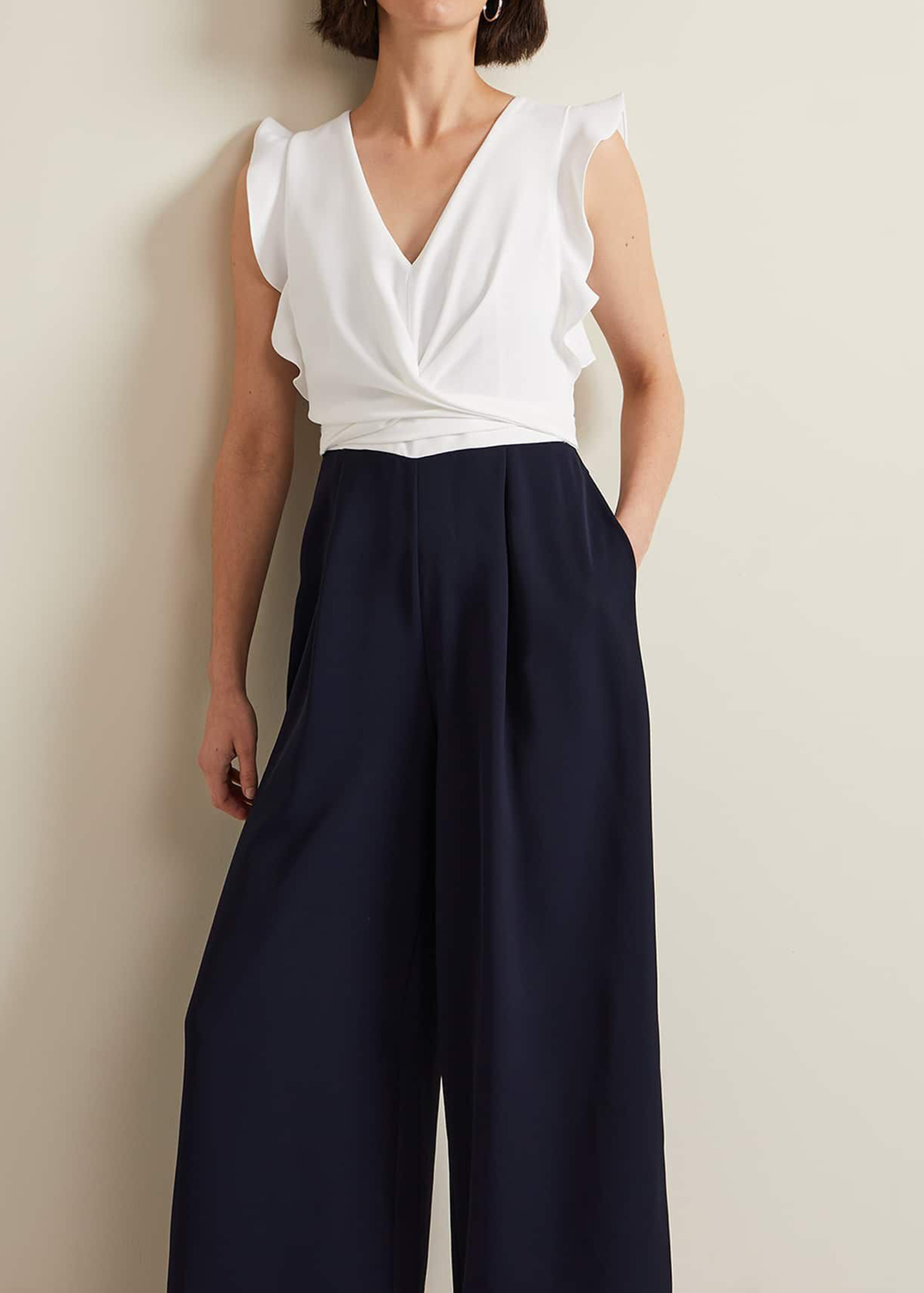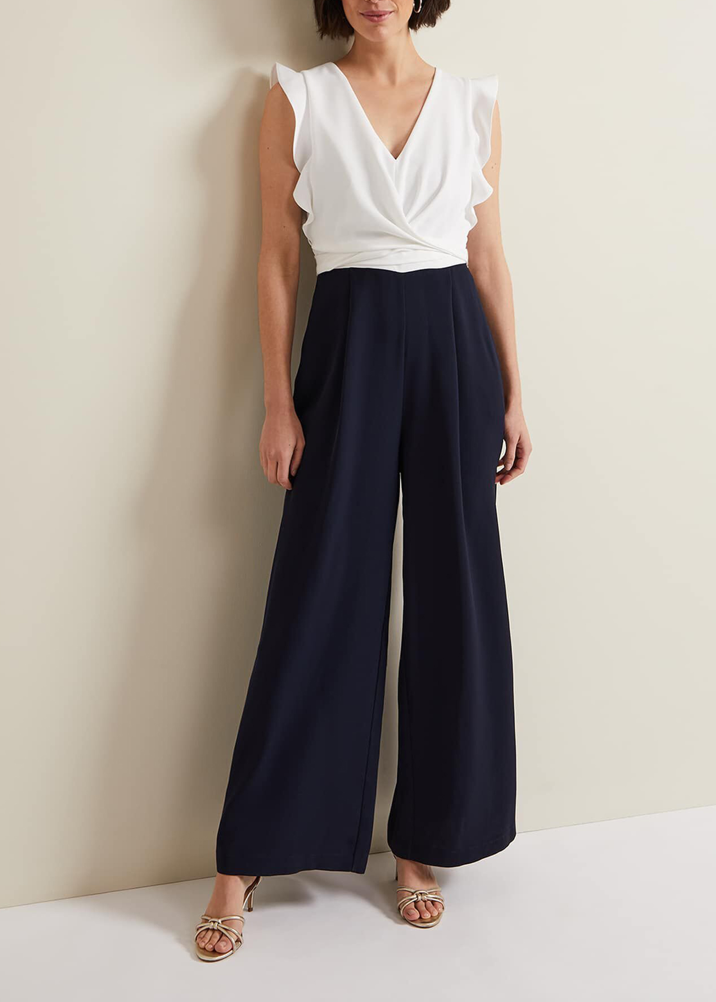 A timeless jumpsuit made for your upcoming events. Designed with a white top that features a feminine V-neckline that's framed by frill detailing and falls to a navy wide leg silhouette. Wear with heels and a matching clutch.