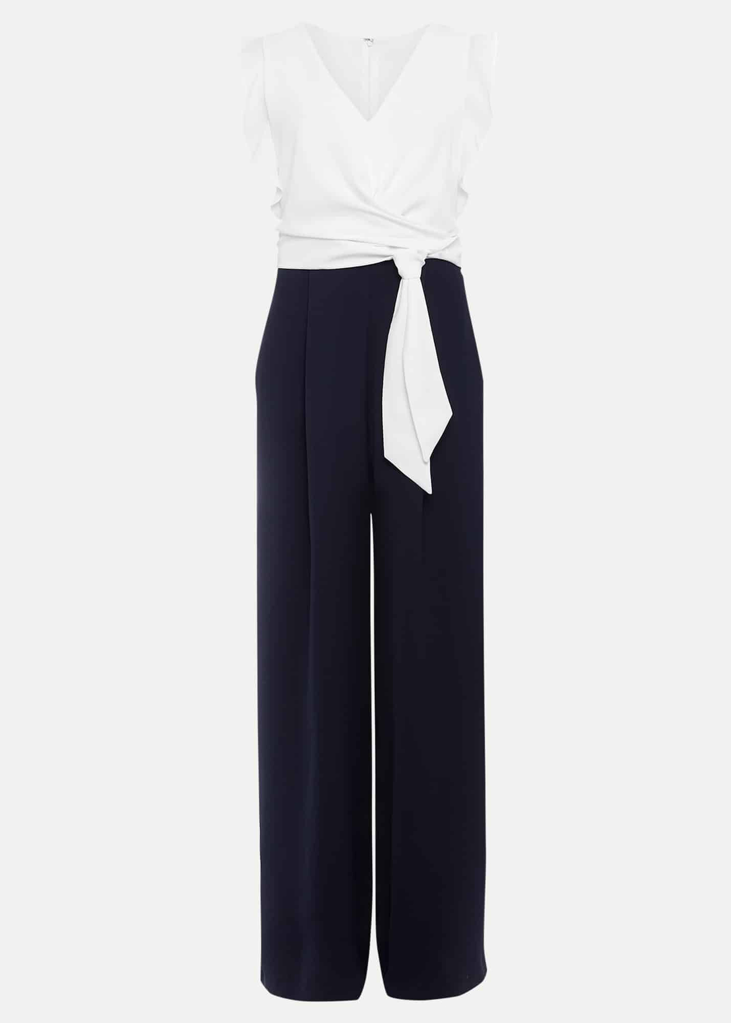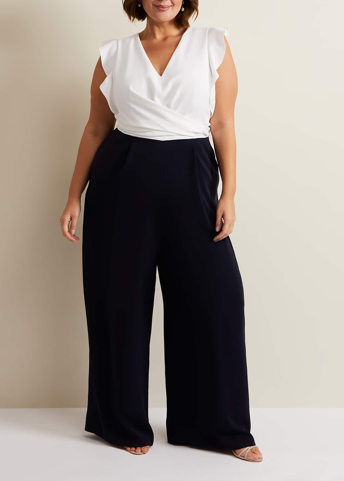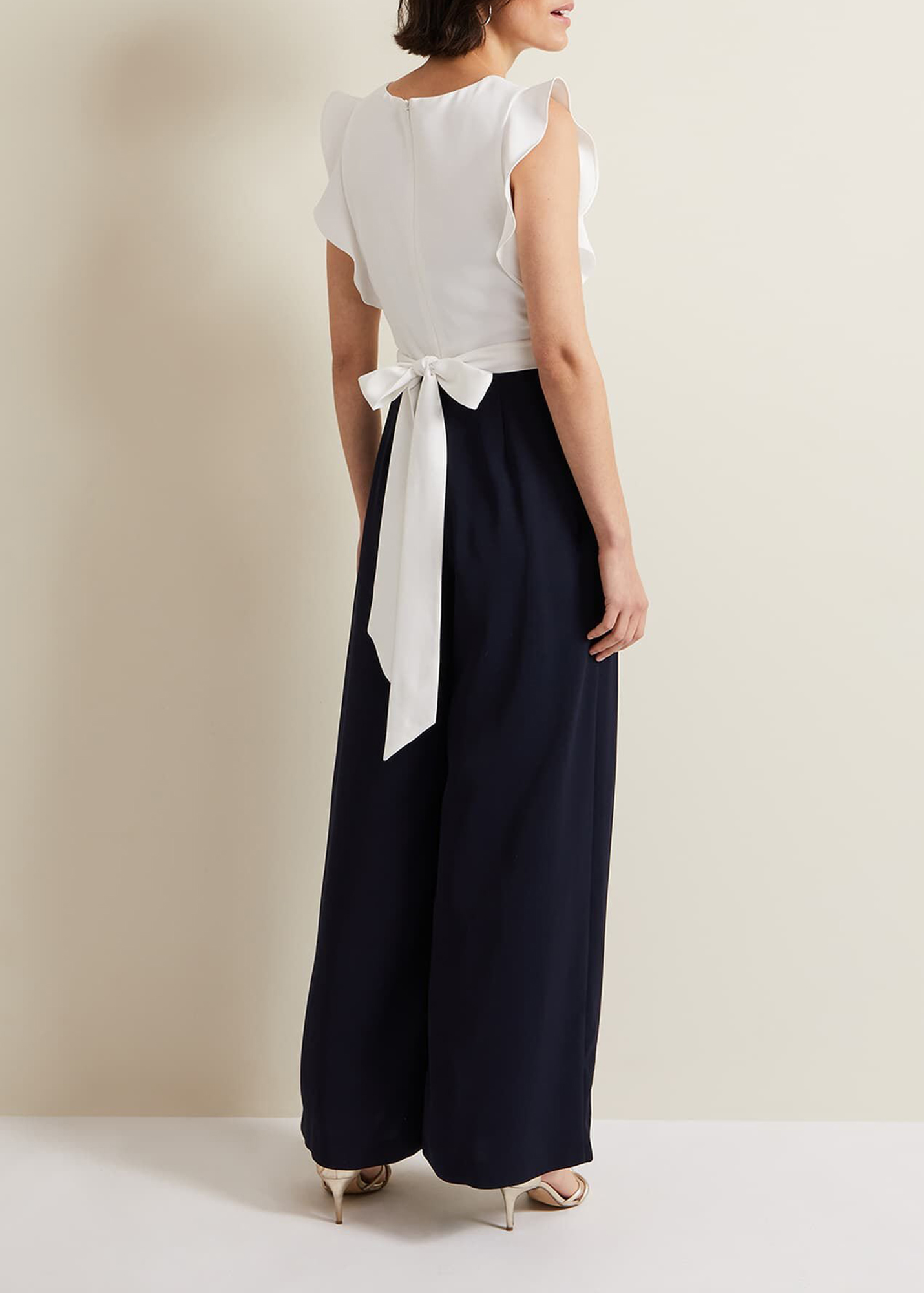 A timeless jumpsuit made for your upcoming events. Designed with a white top that features a feminine V-neckline that's framed by frill detailing and falls to a navy wide leg silhouette. Wear with heels and a matching clutch.