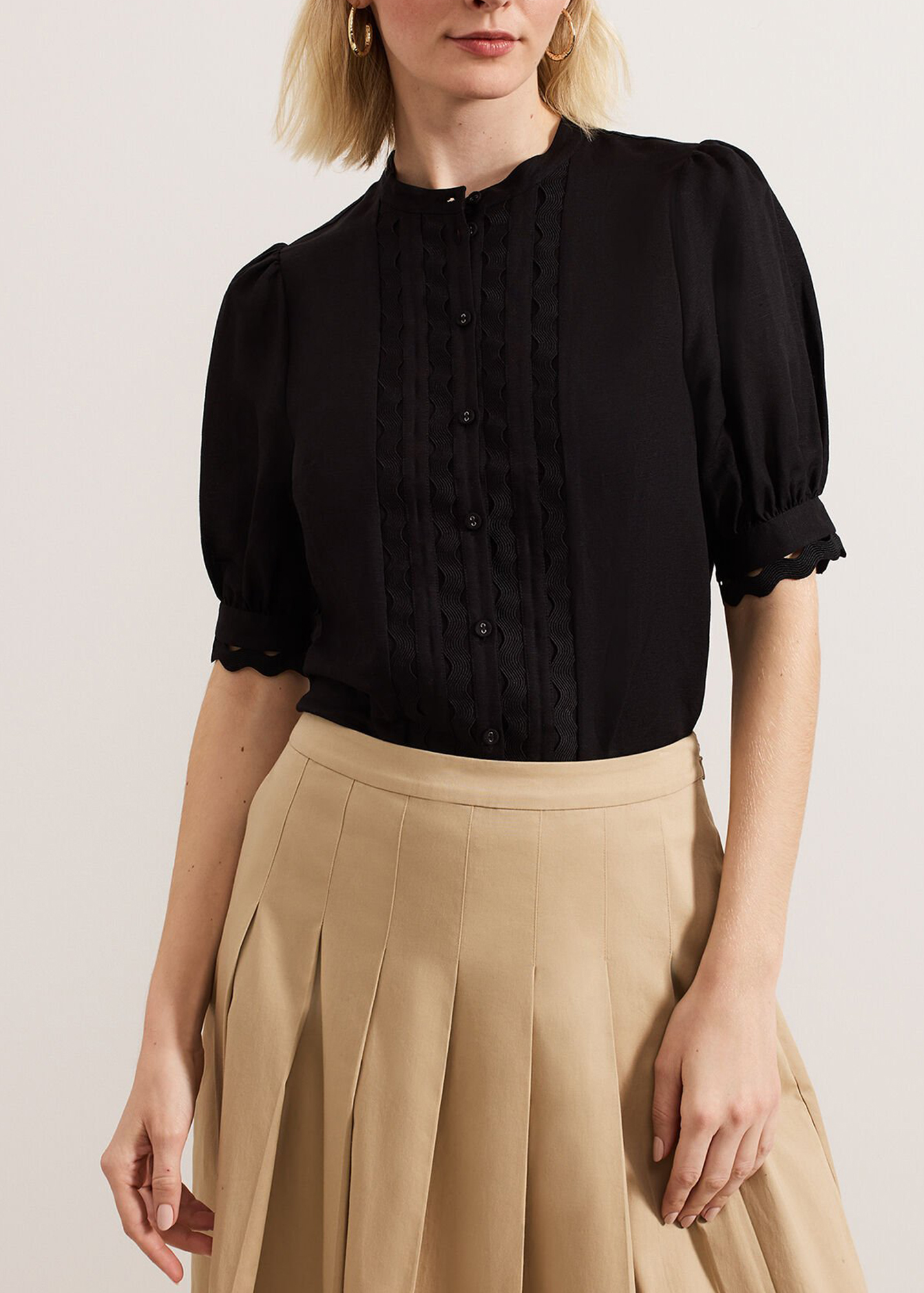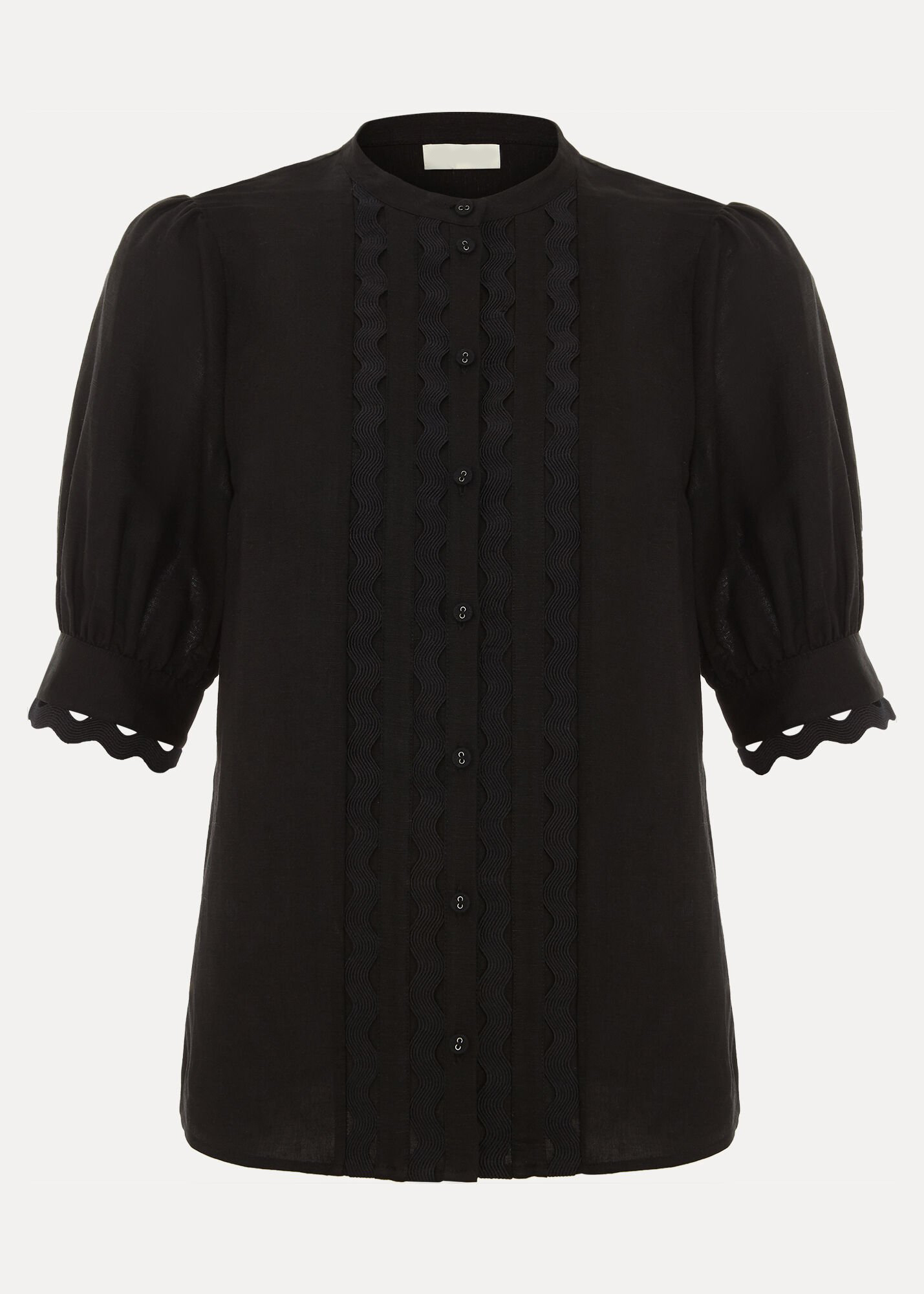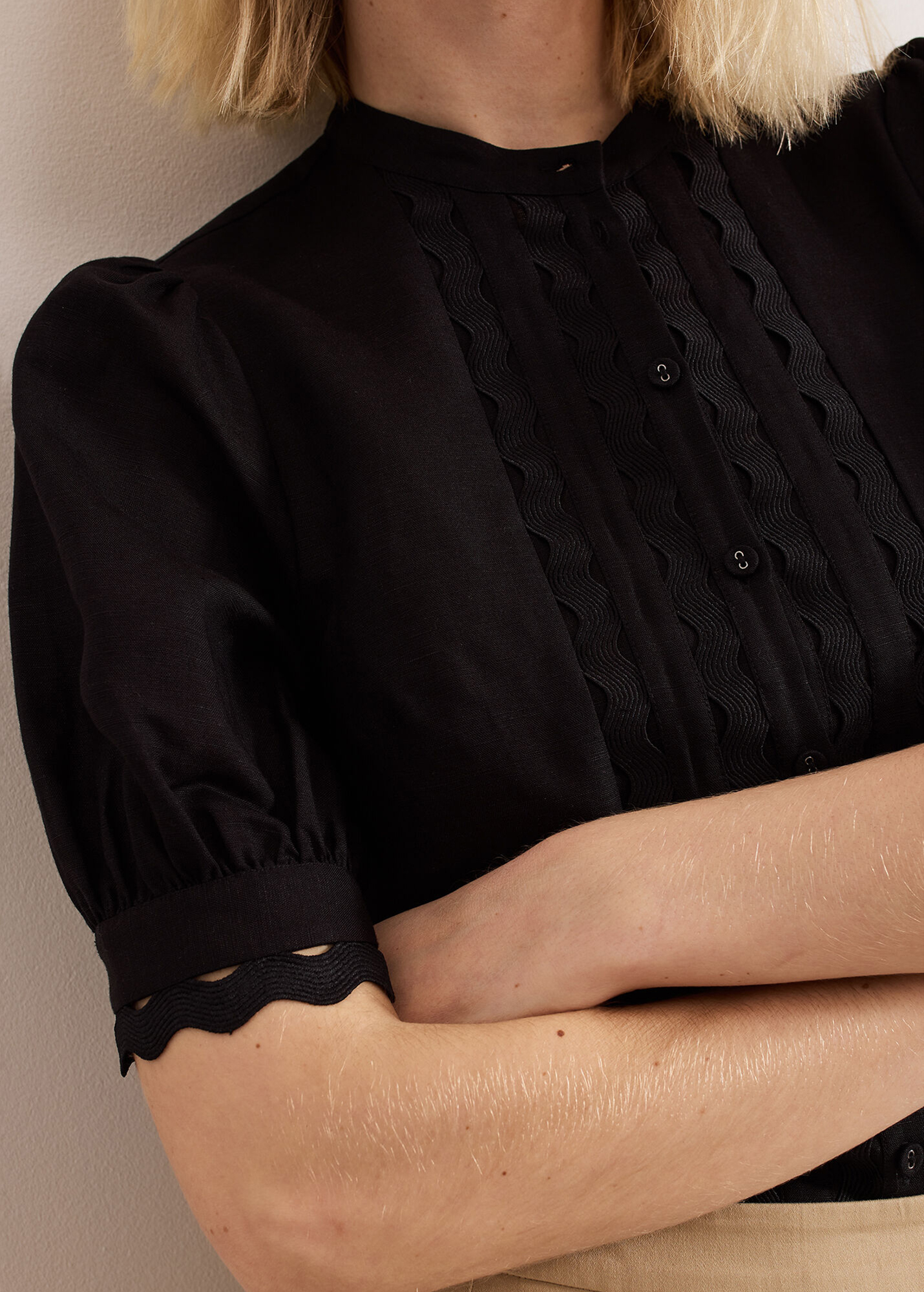 In classic black our top is made from a breathable linen fabric. Woven detailing at the front provides a modern update whilst feminine puff sleeves add subtle dimension to the style. For a look with evening appeal we wear ours with a structured skirt and our favourite heels.