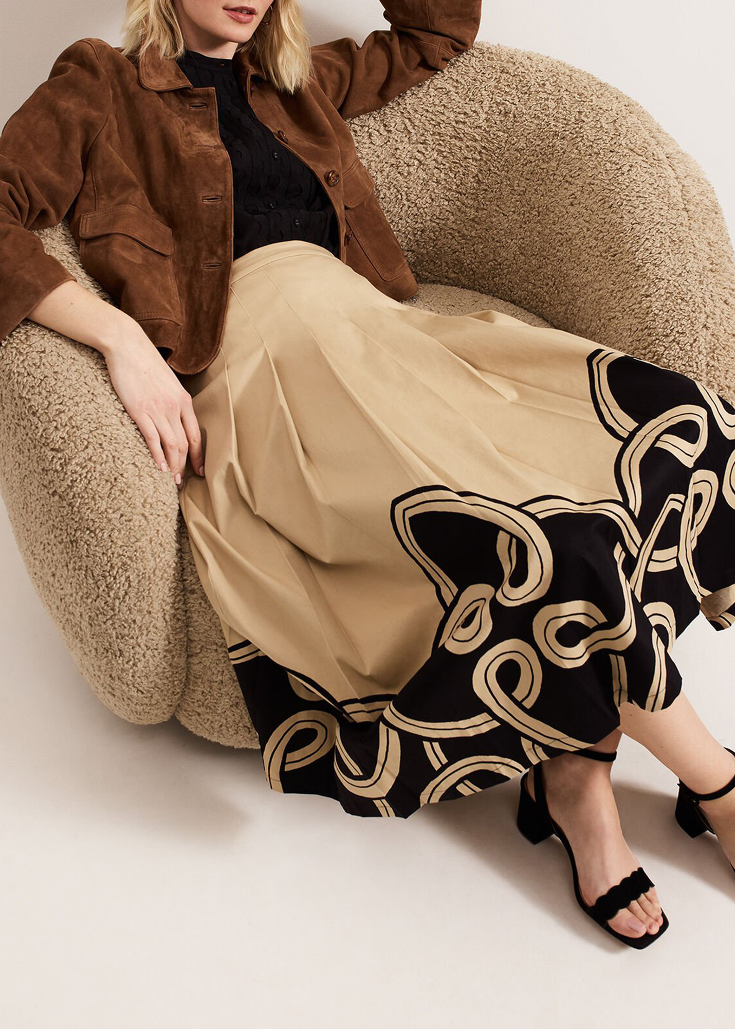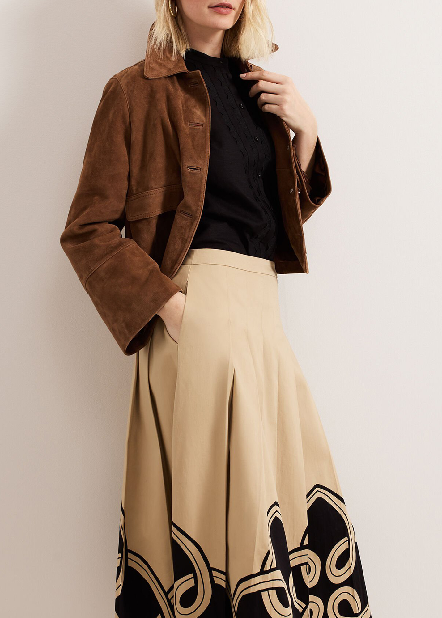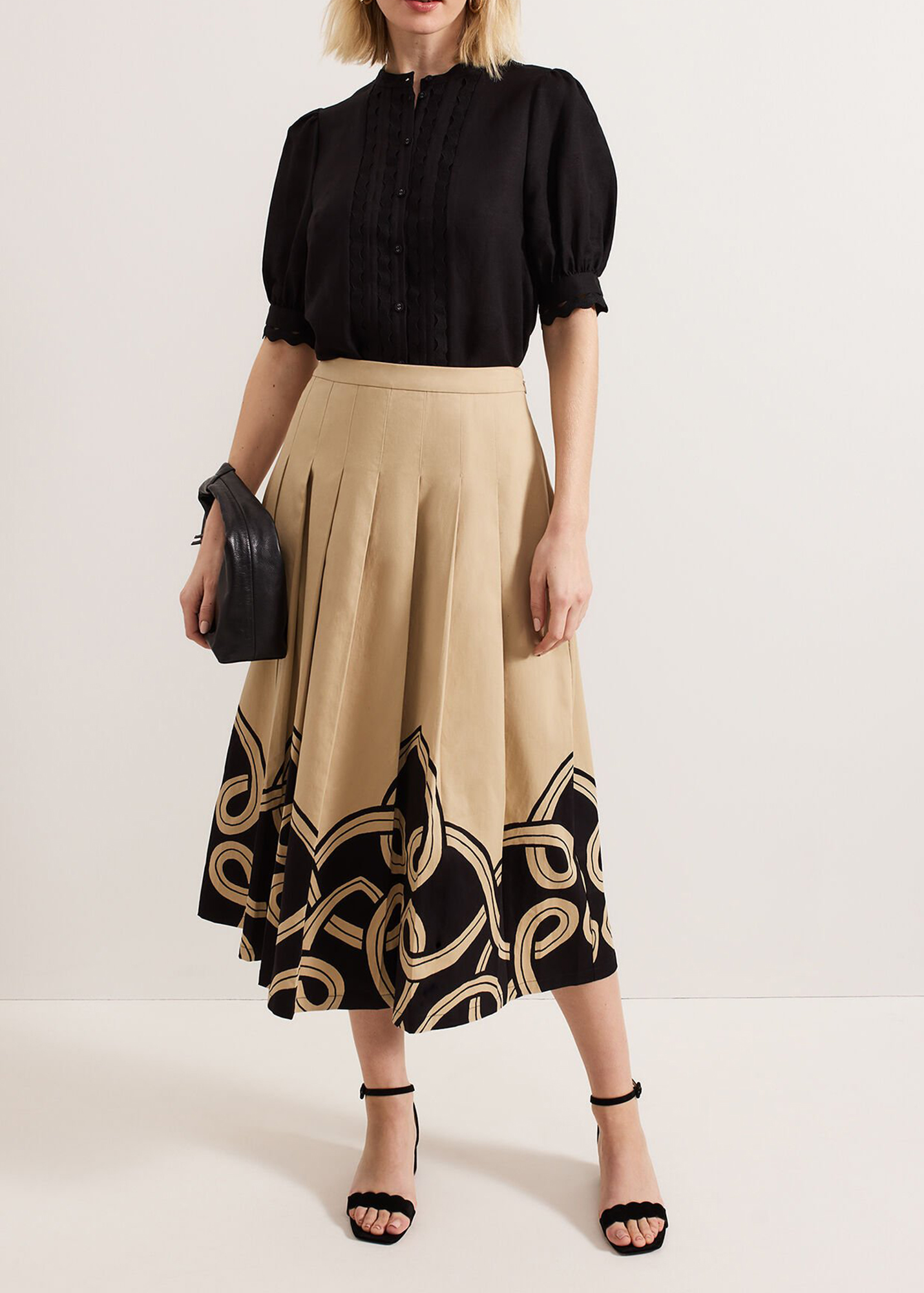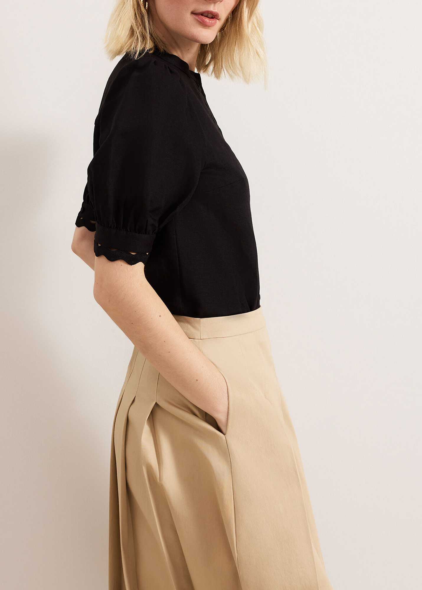 In classic black our top is made from a breathable linen fabric. Woven detailing at the front provides a modern update whilst feminine puff sleeves add subtle dimension to the style. For a look with evening appeal we wear ours with a structured skirt and our favourite heels.