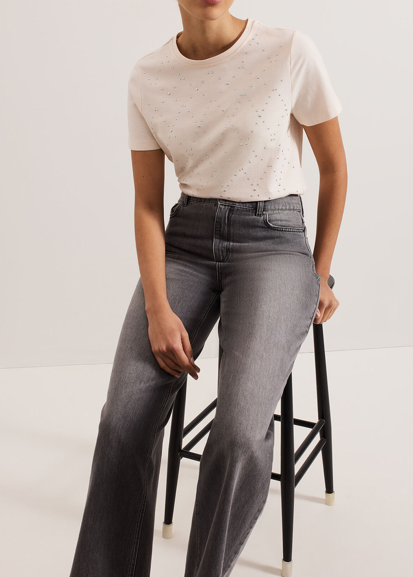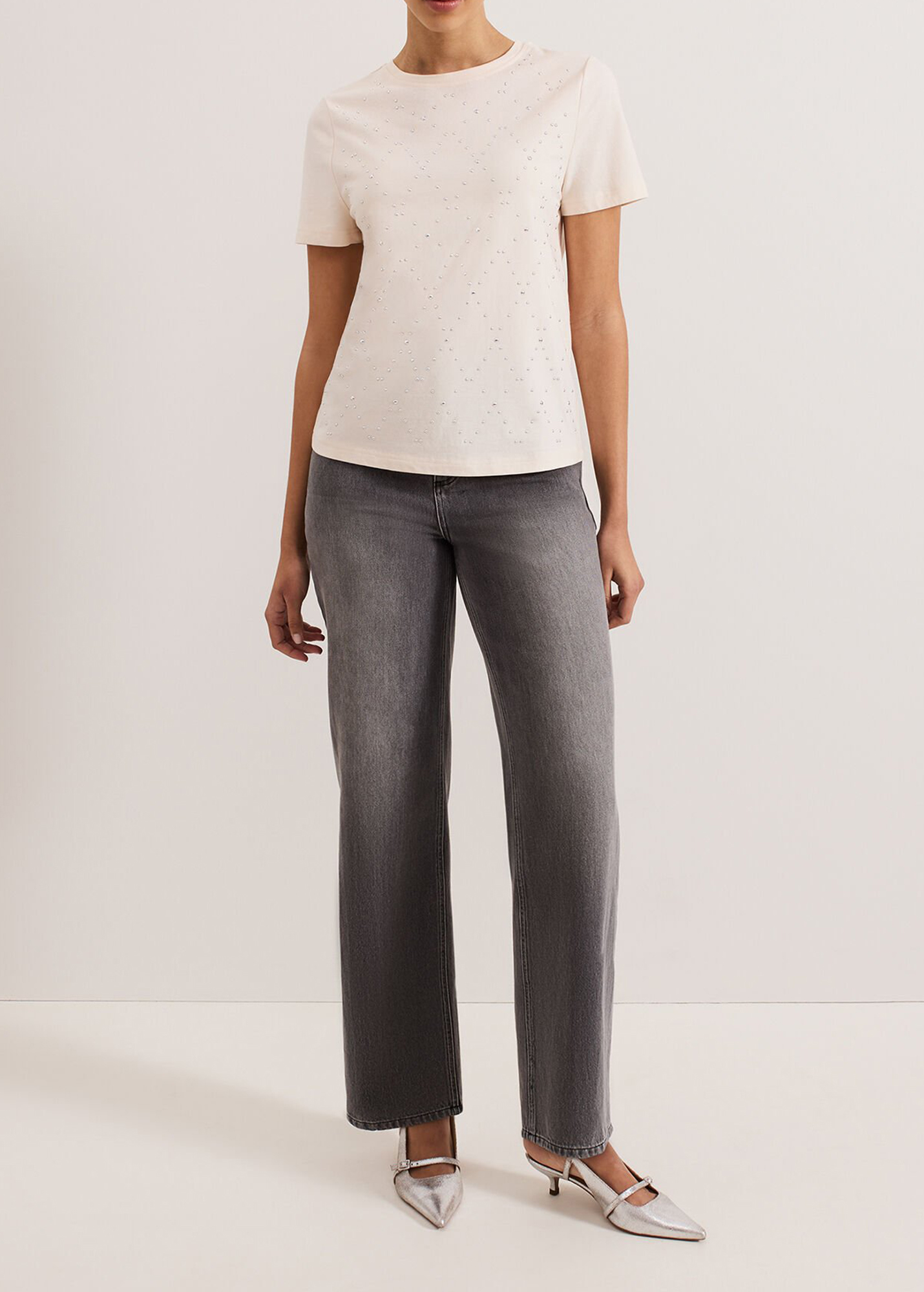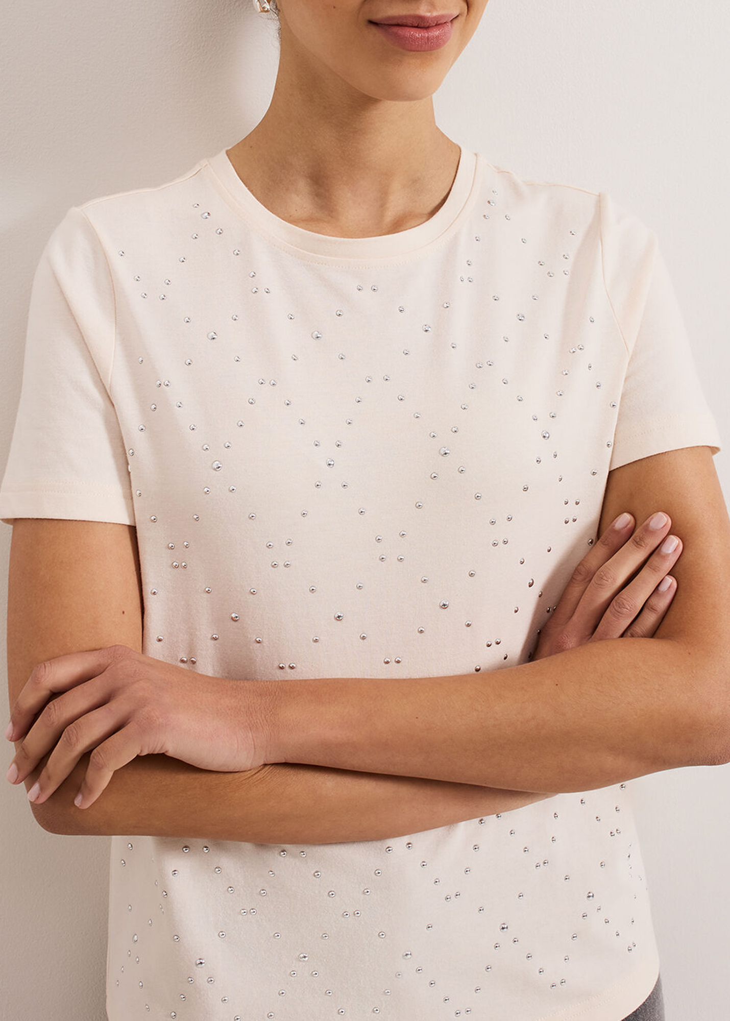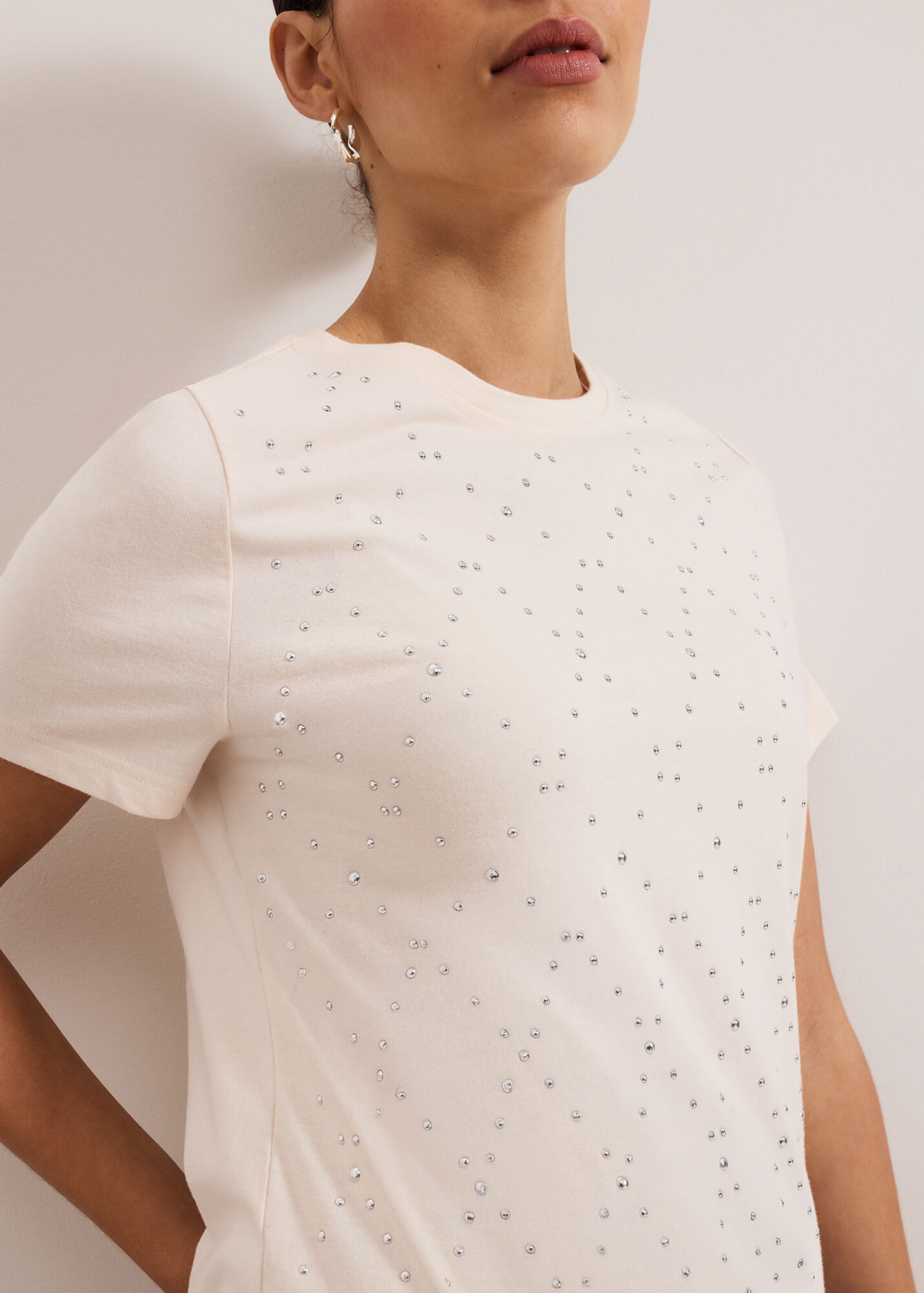 In a timeless cream shade that will pair effortlessly with all your favourite separates our top is embellished with silver stud detailing in a diamond pattern. We style ours with our favourite denim and silver jewellery for a contemporary feminine look.