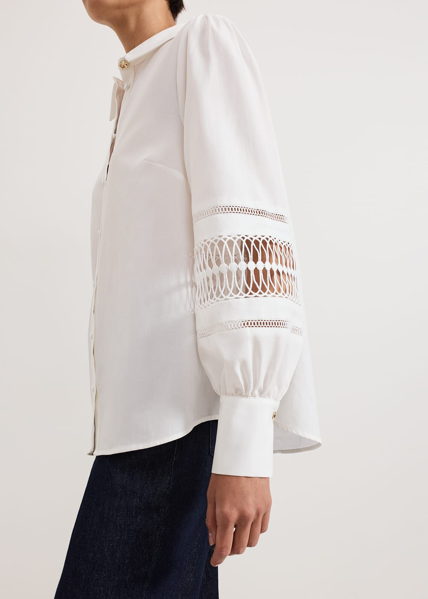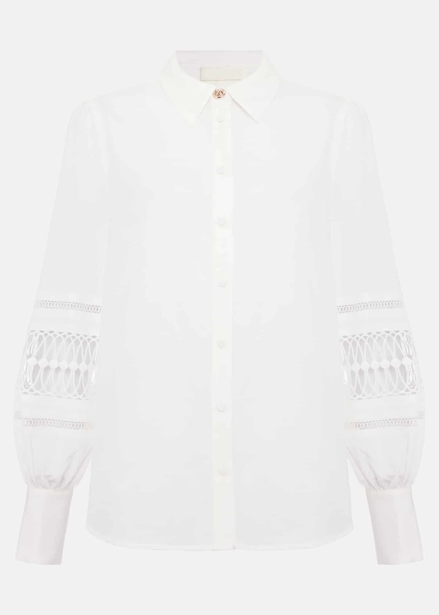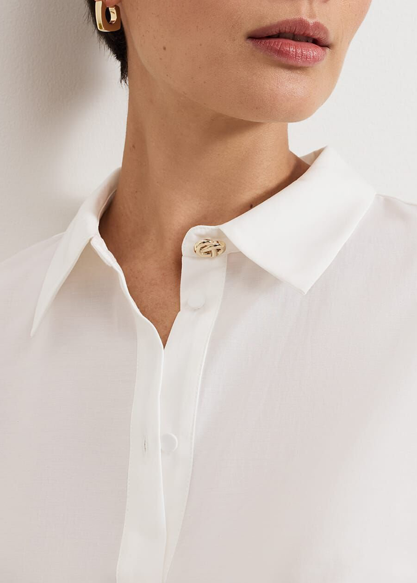A work-to-weekend go-to, this white shirt features a classic neckline with a gold knot detail. Tapered cuffs create a tunic effect, while subtle embroidery details add to the appeal. Wear it with your favorite jeans or trousers and heels for a modern evening look.