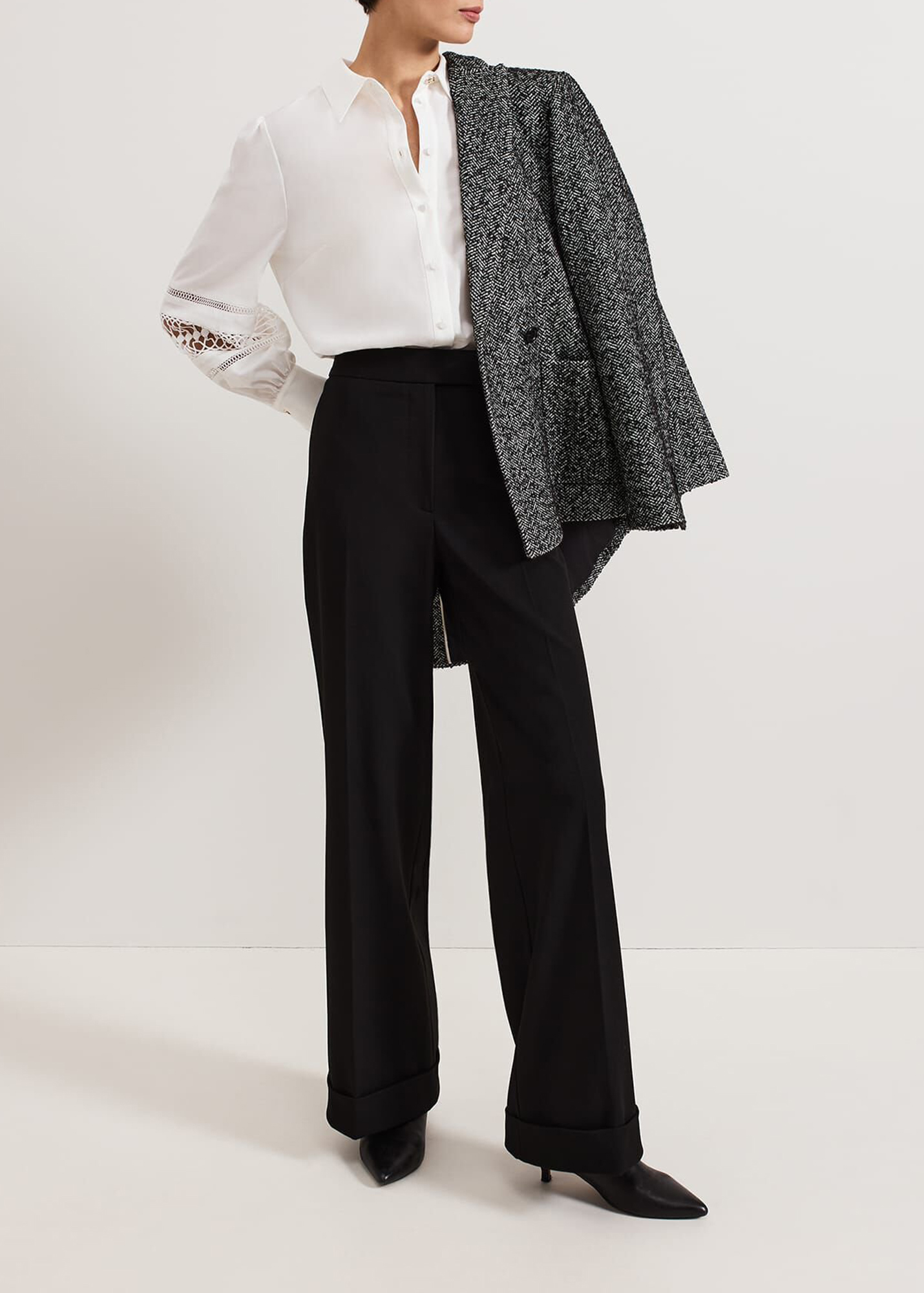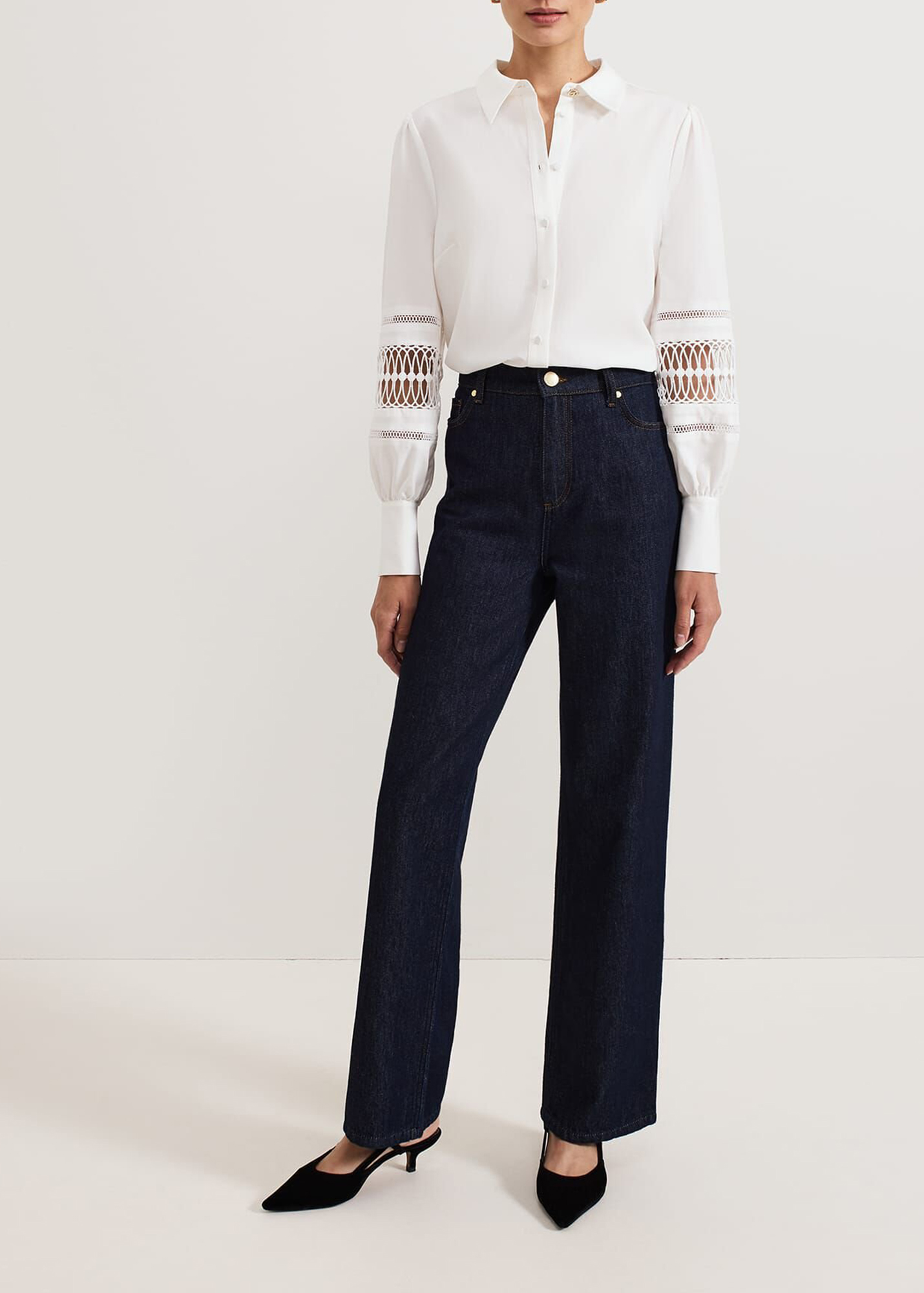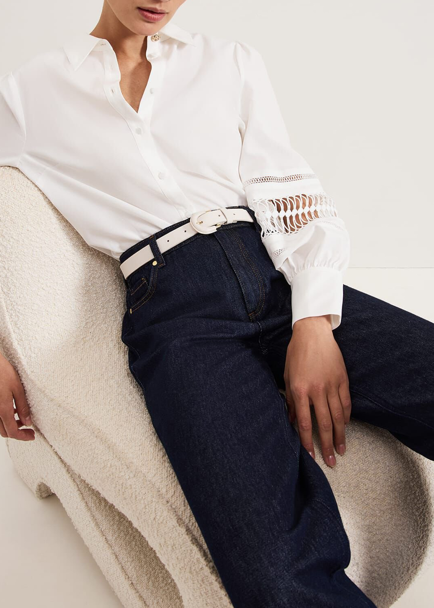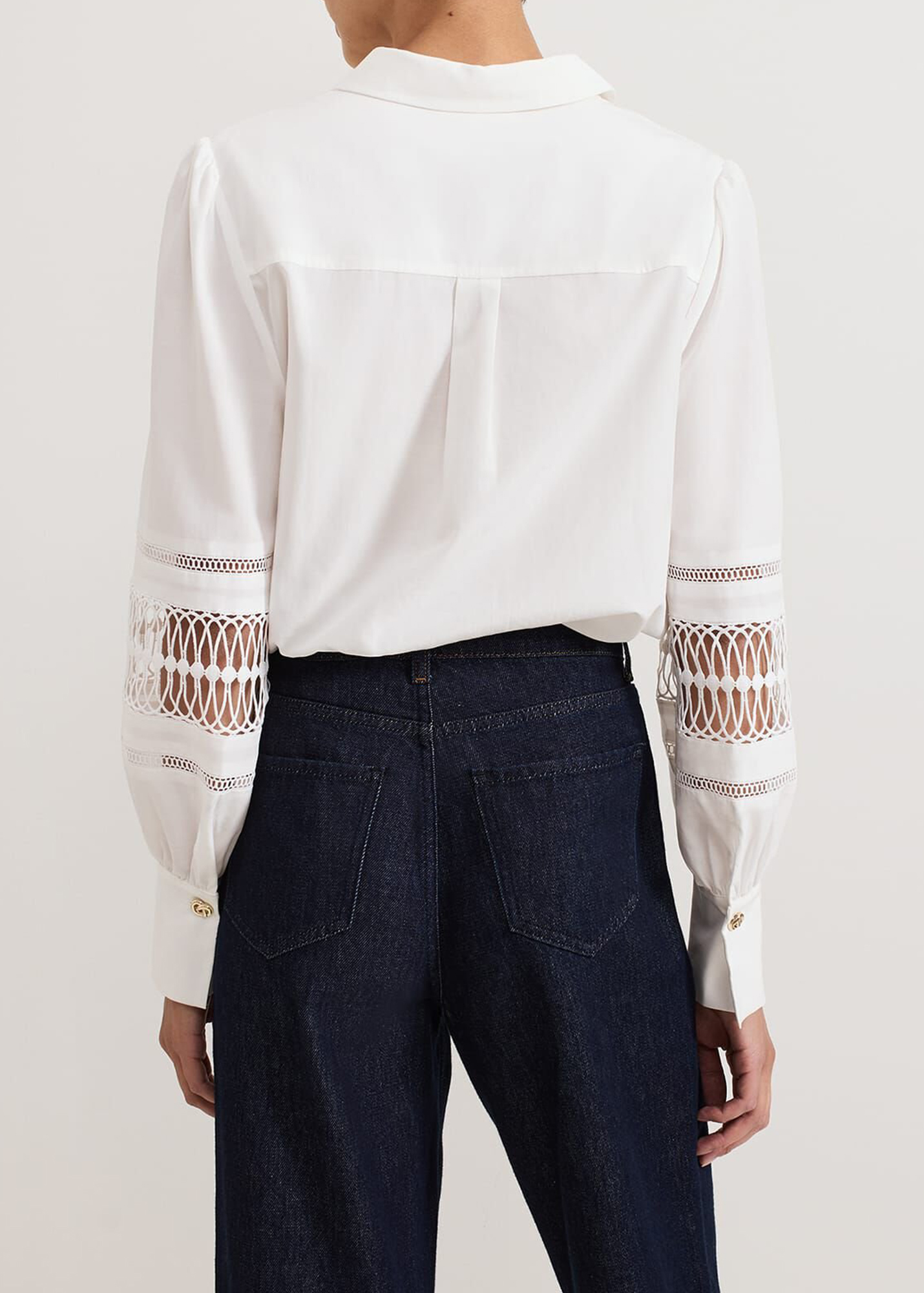 A work-to-weekend go-to, this white shirt features a classic neckline with a gold knot detail. Tapered cuffs create a tunic effect, while subtle embroidery details add to the appeal. Wear it with your favorite jeans or trousers and heels for a modern evening look.