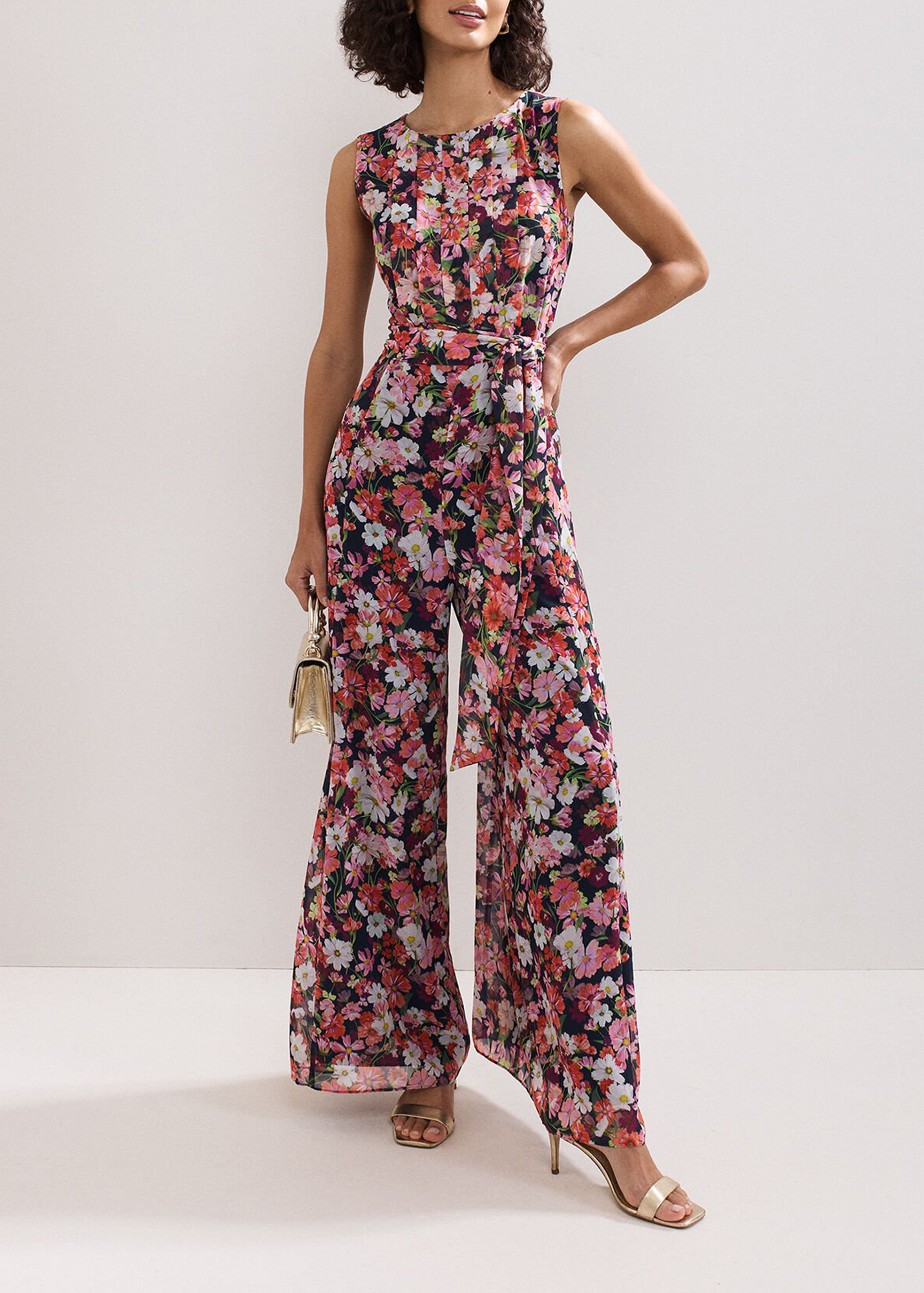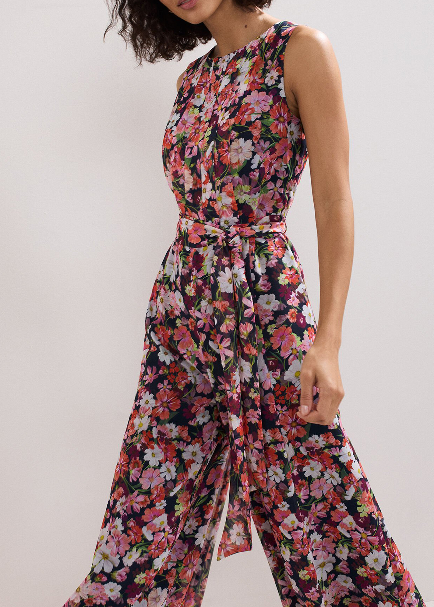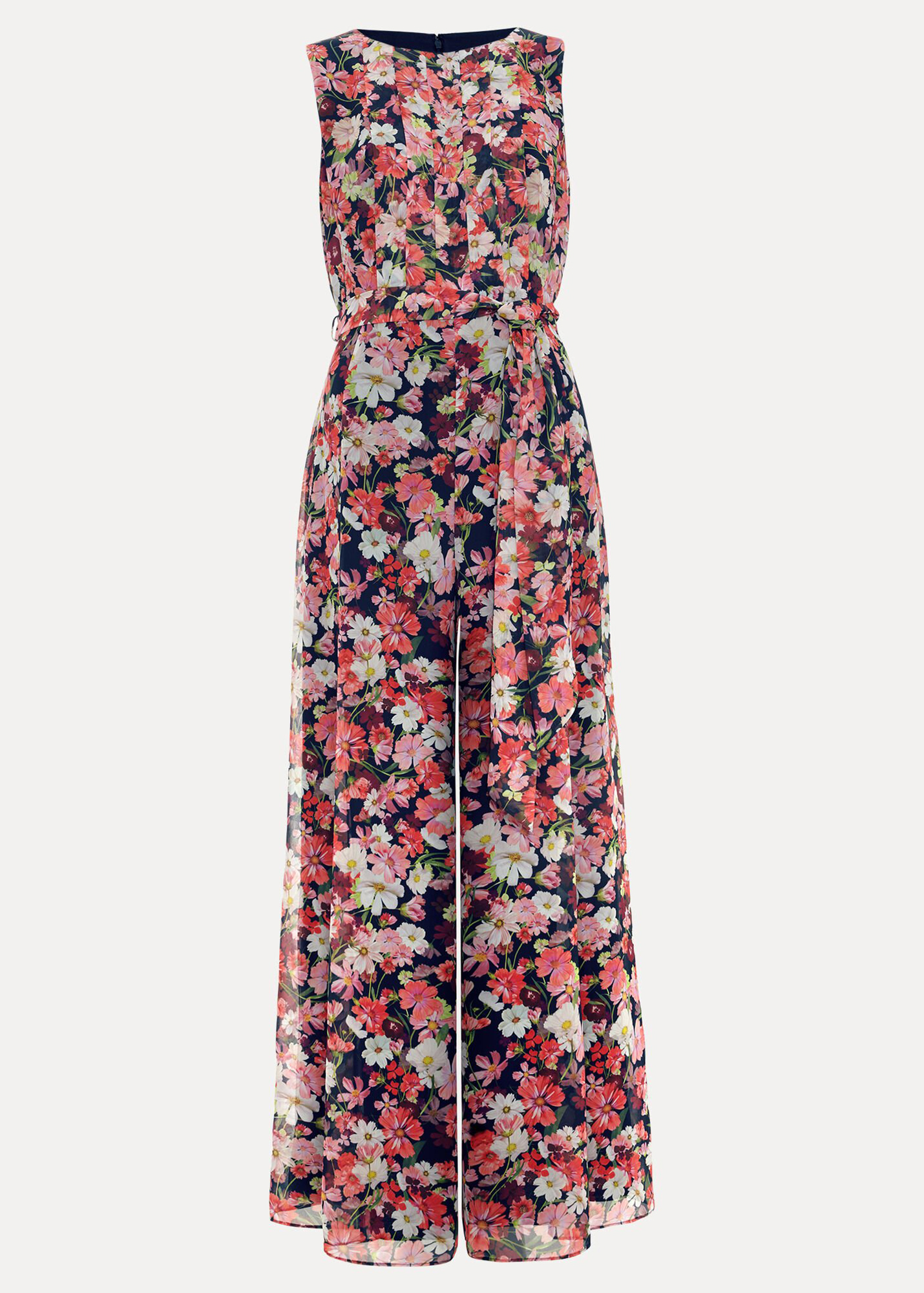 Make a statement in florals. This jumpsuit epitomises the beauty of nature and blooming British meadows, with high impact repeat florals and a contemporary wide leg silhouette. Finishing the look with a stylish tie waist to cinch and sculpt, adding shape and balance.