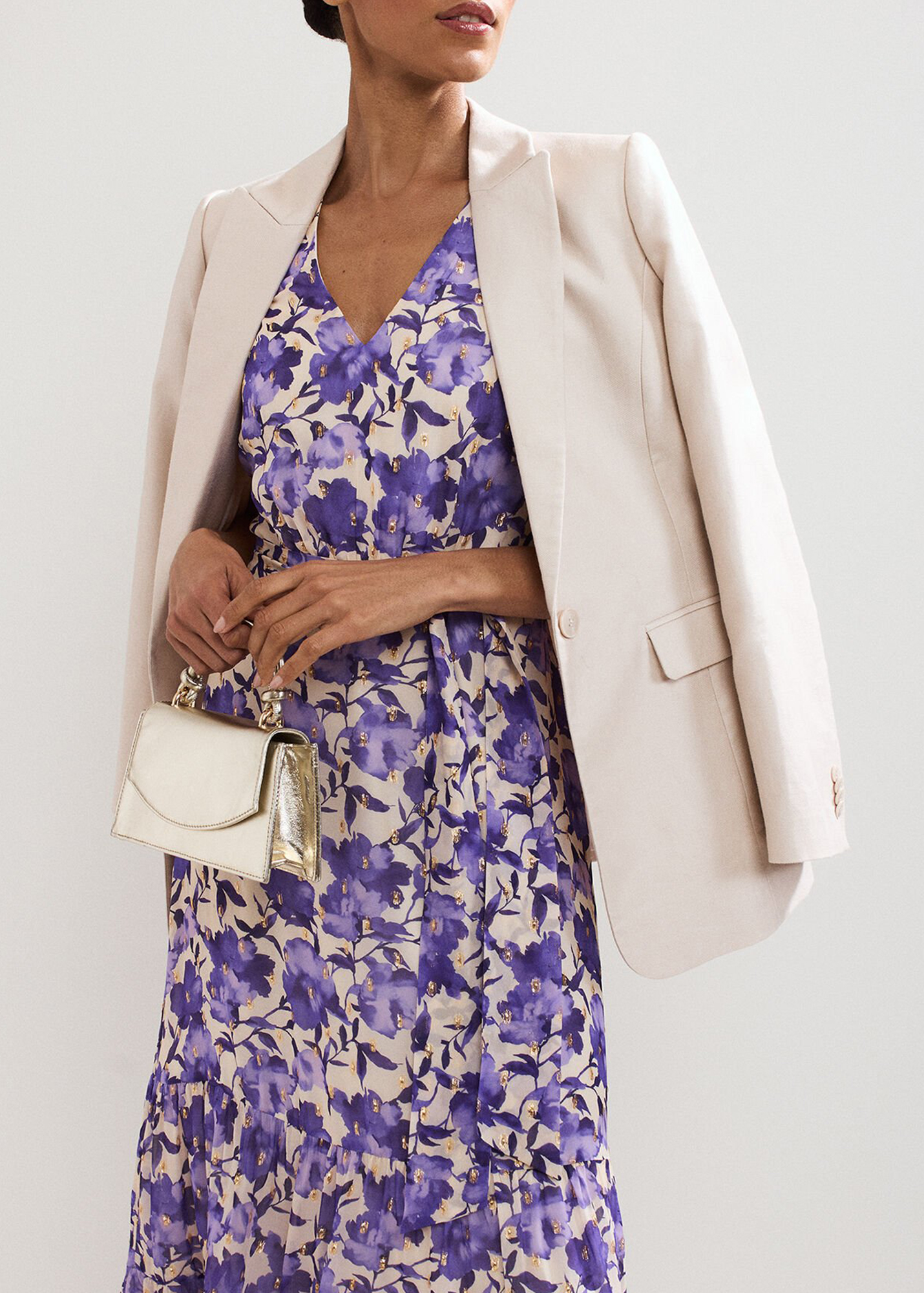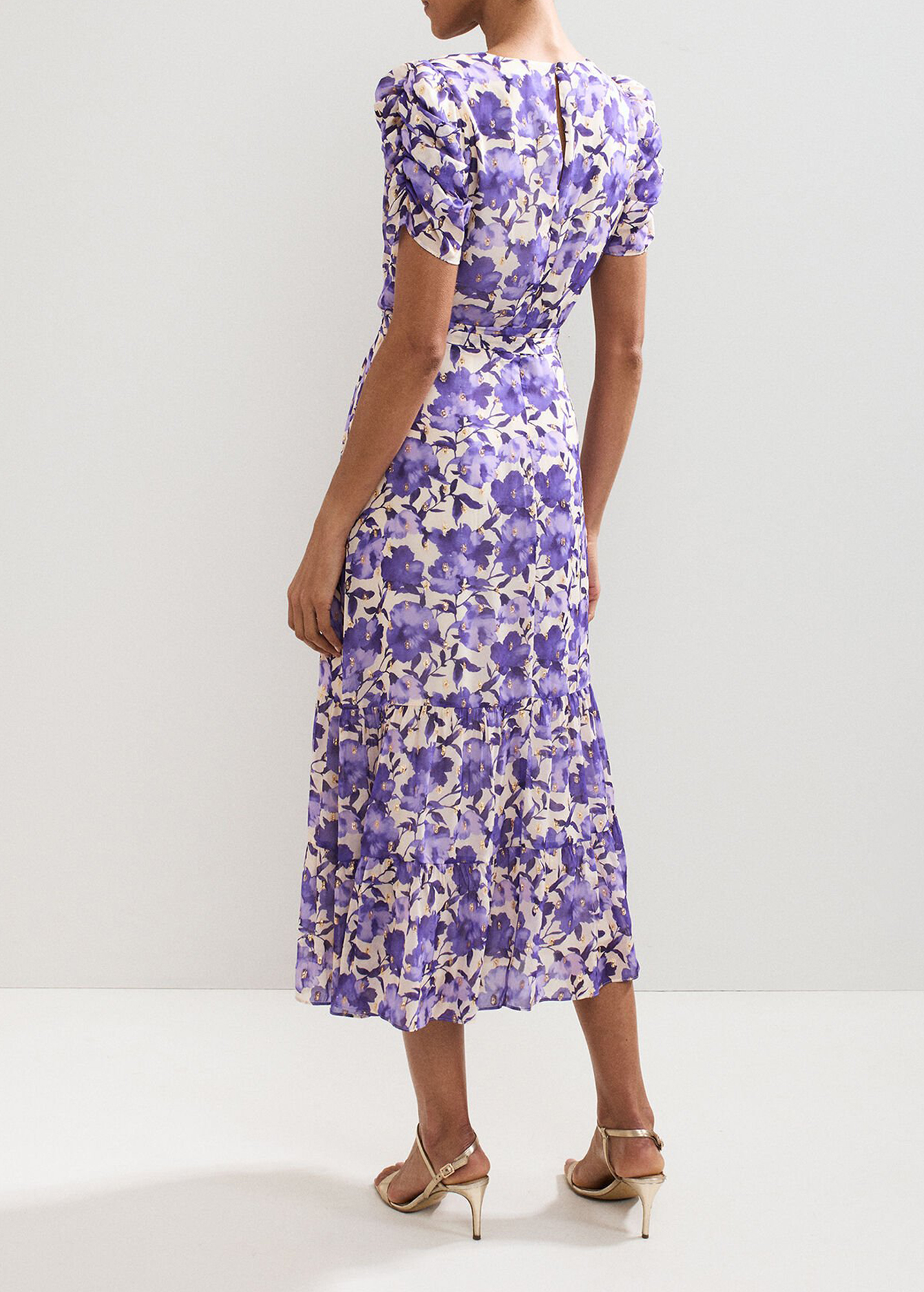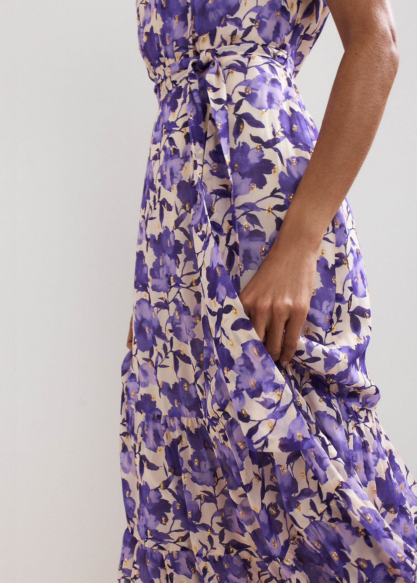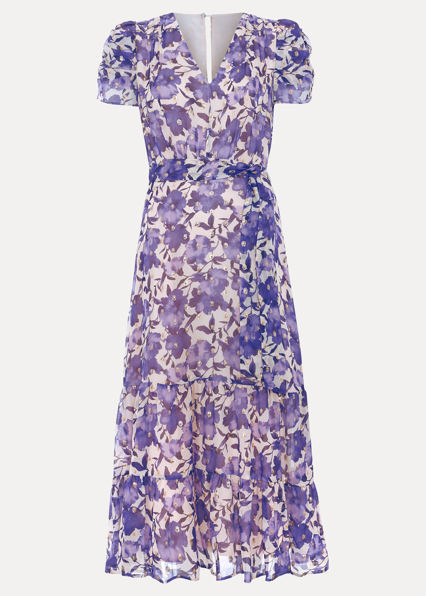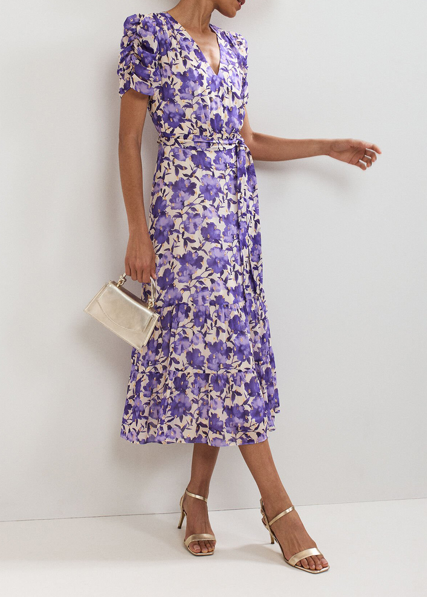 Effortlessly elegant and versatile, this purple, floral midi dress has wear-all-day appeal. With a feminine V neckline, tie belt to enhance your natural shape and a classic skirt, this style is made to transition from office to bar. Just switch out your trainers to heels for a polished evening look.