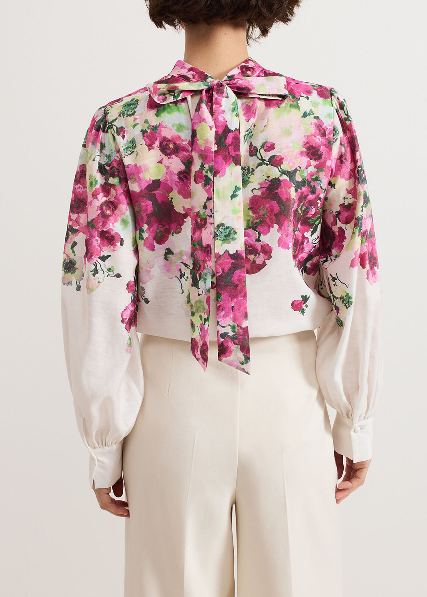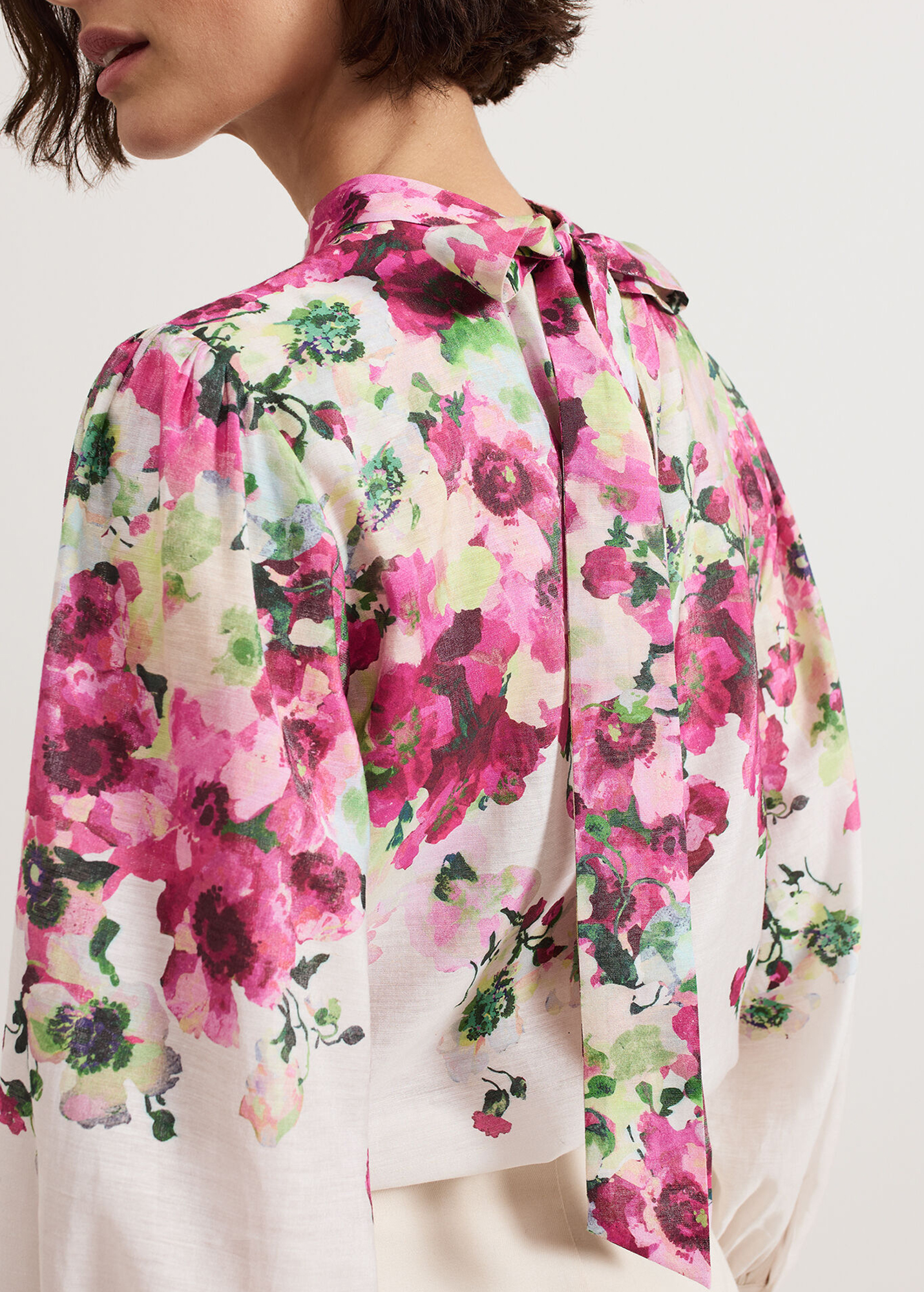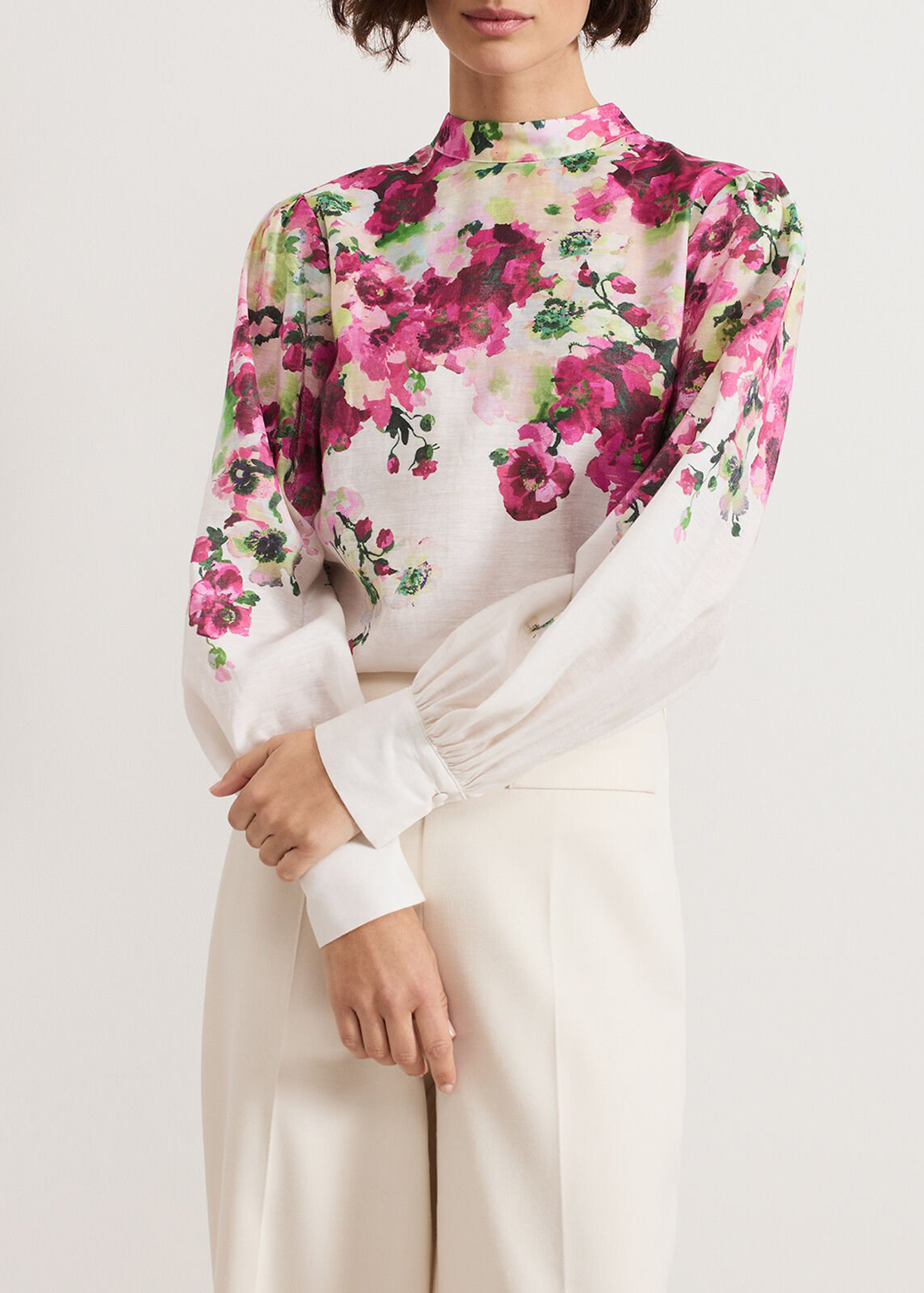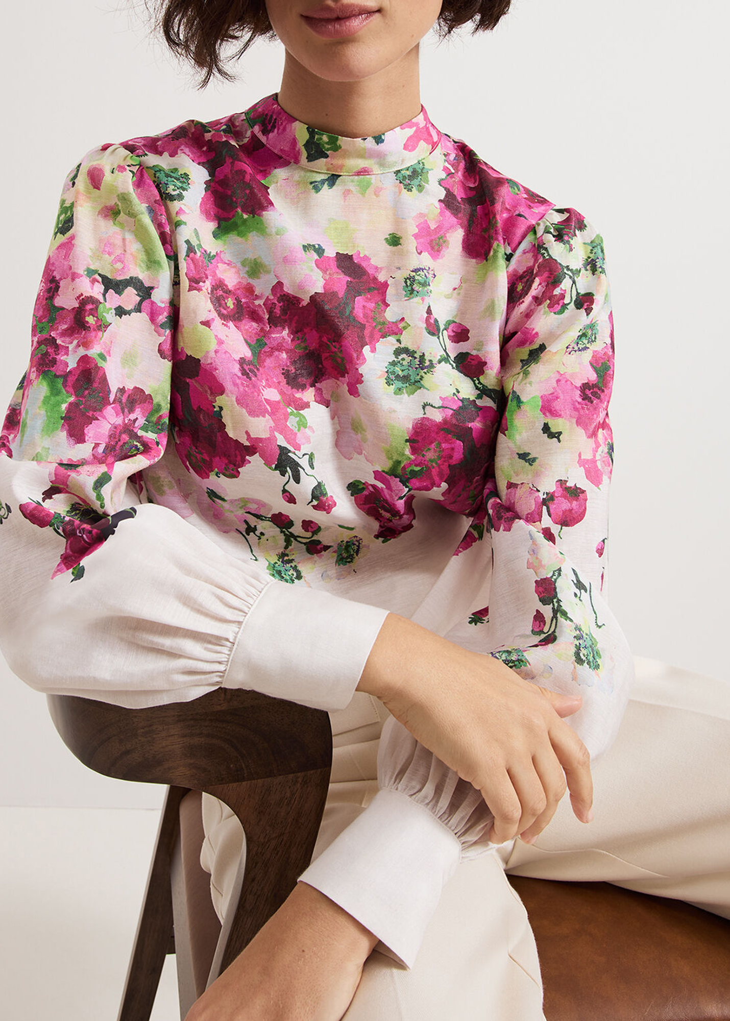 With a stunning new in-house floral print, our top features a feminine high neckline and cinched cuffs that create voluminous blouson sleeves. Dress up with tailored trousers and heels or down with your favourite denim jeans or skirt.
