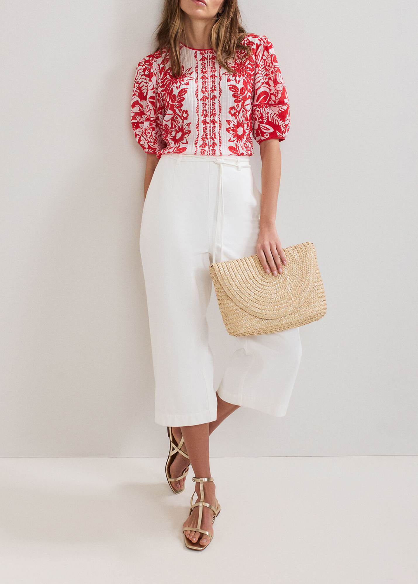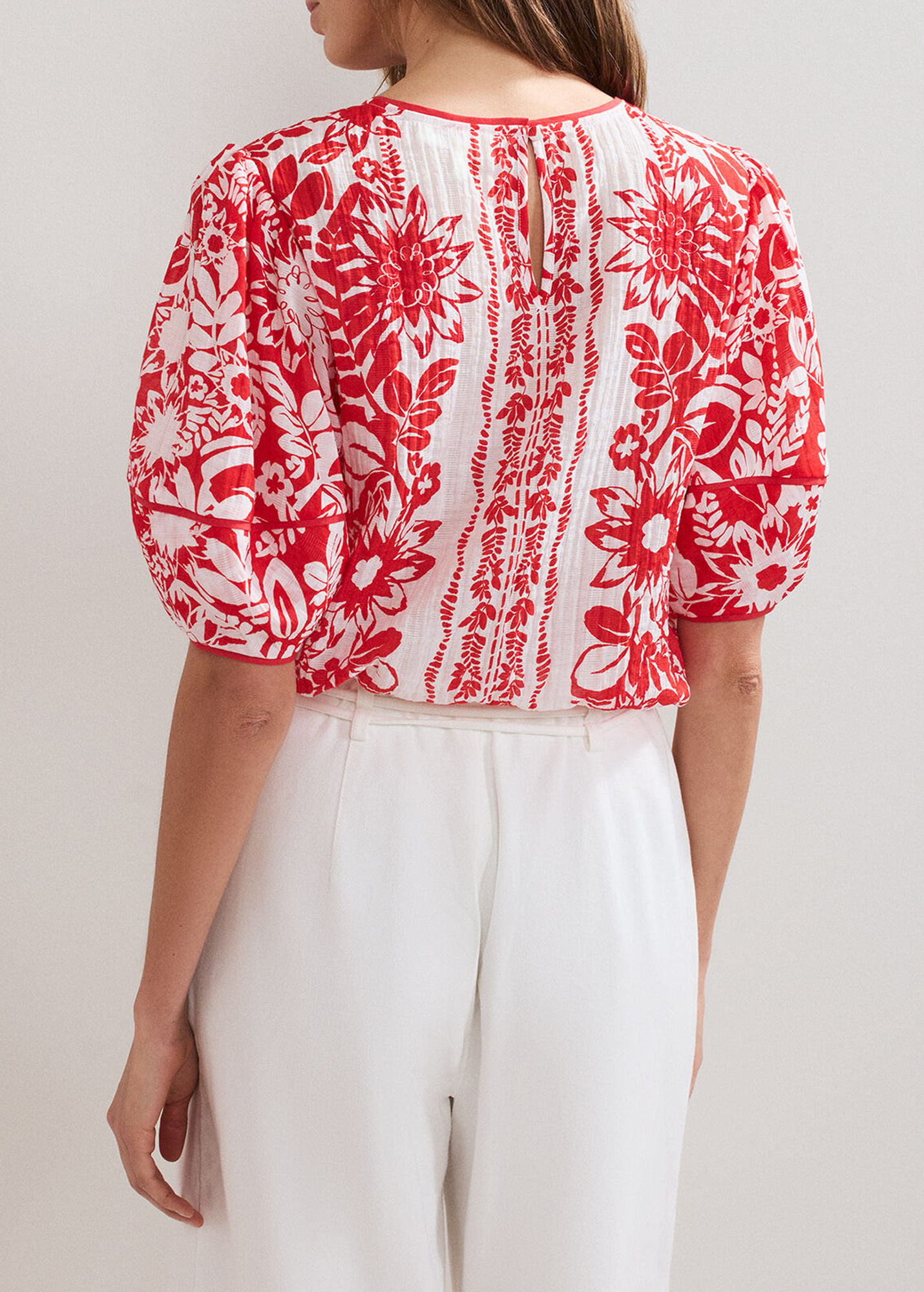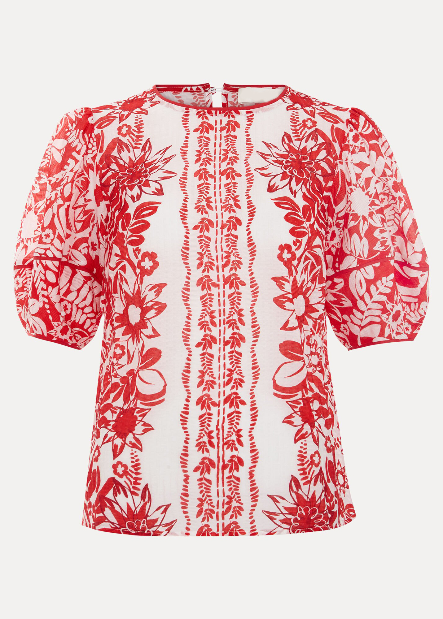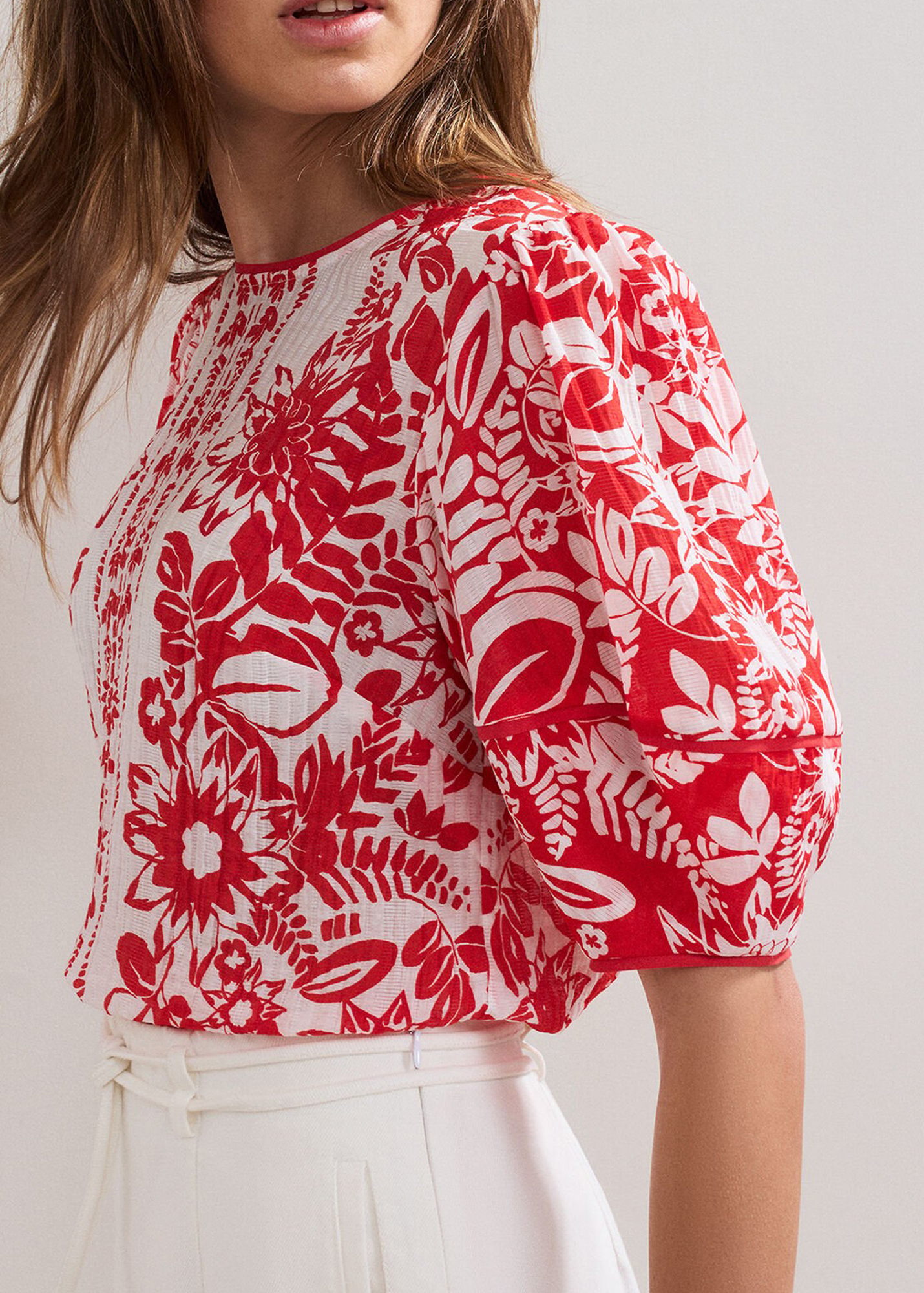 Chic and feminine, this top is perfect for warmer days or casual outfits. The vibrant red color is accented with a soft floral print, while the puff sleeves add a playful fluffy feel to the silhouette. Wear with casual pants and sandals for an easy, everyday look.