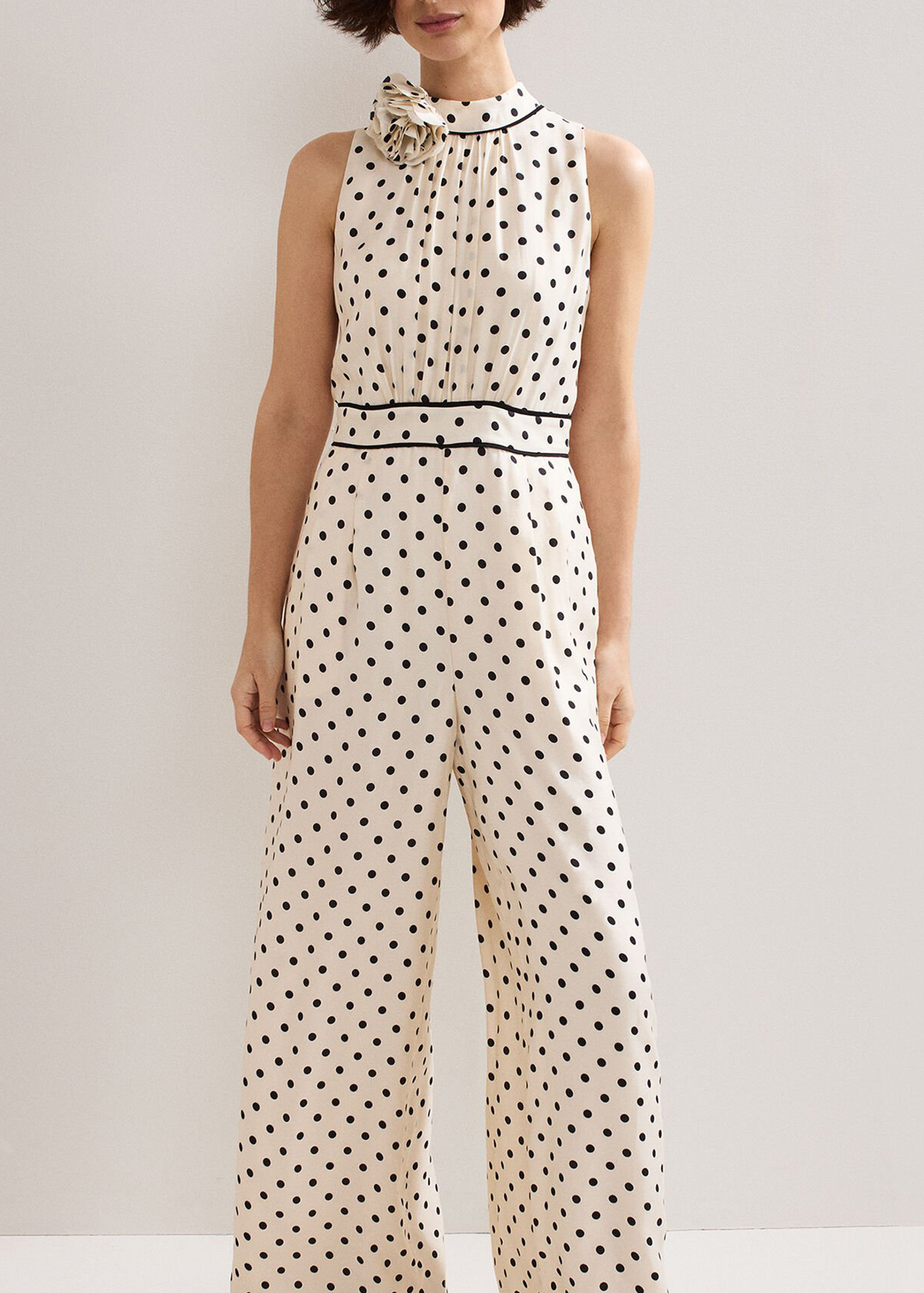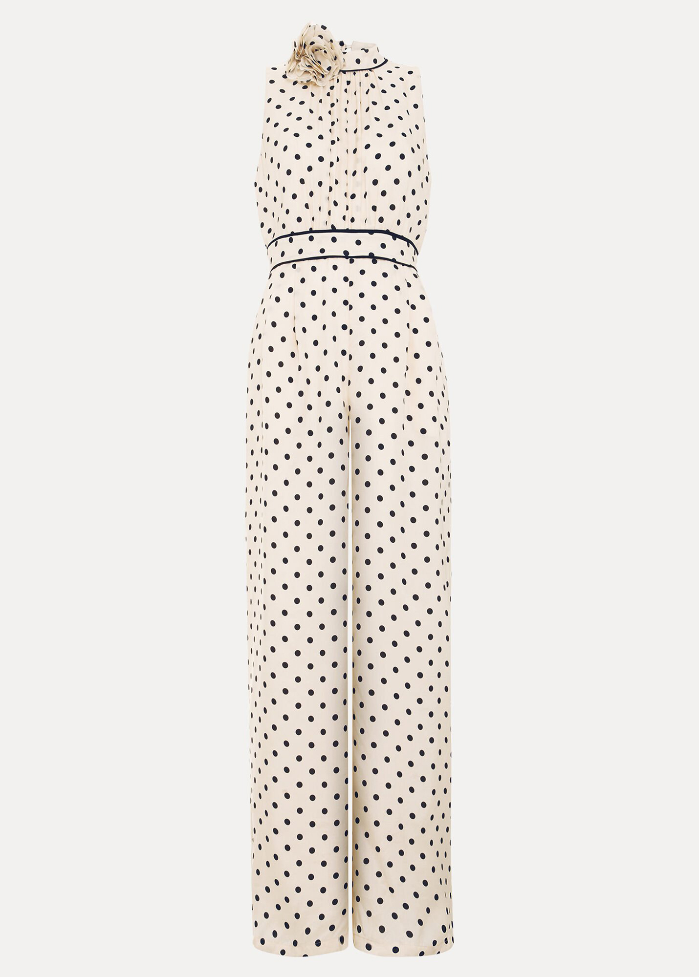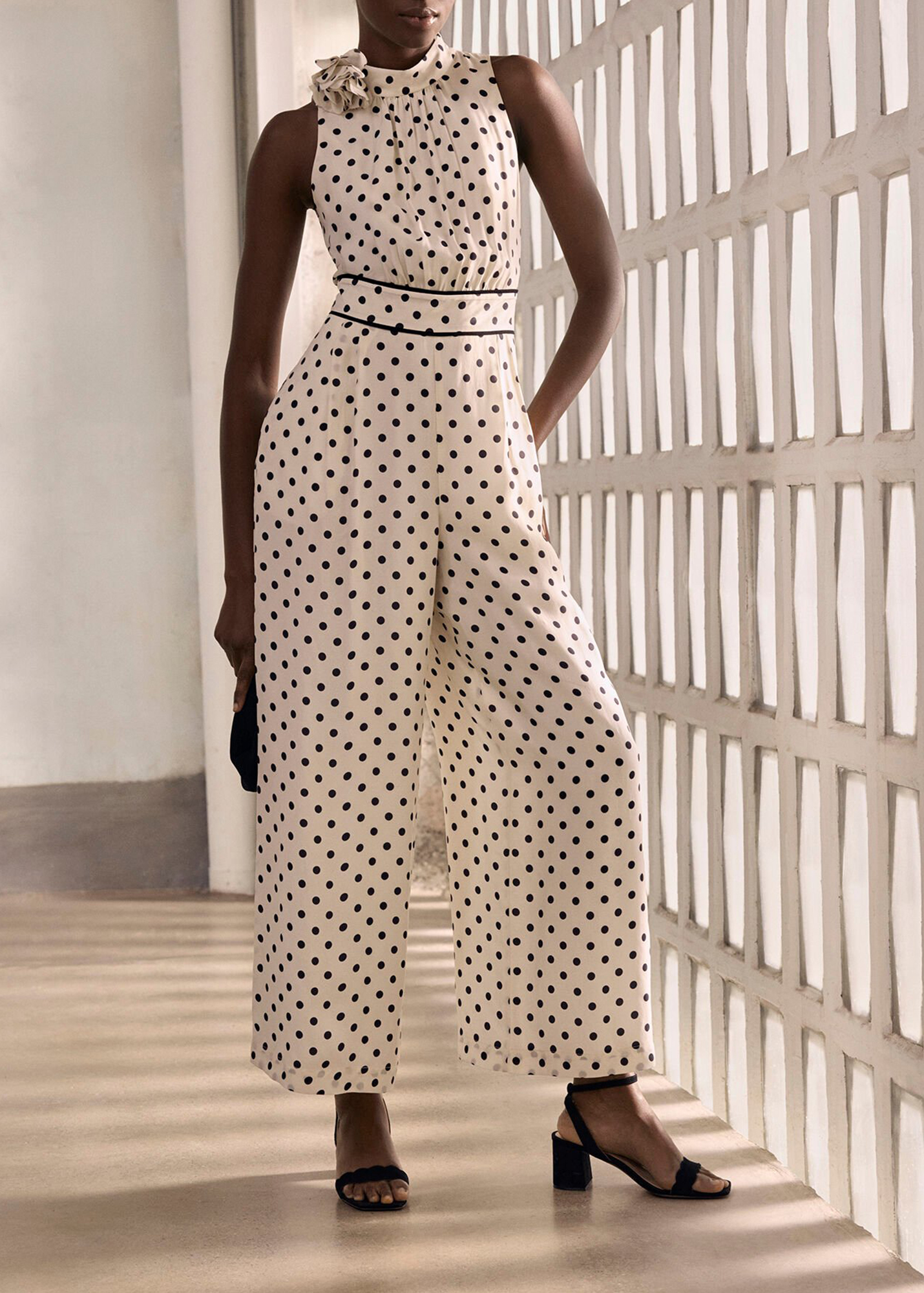 Add a touch of polka dot to your event wardrobe with our wide leg jumpsuit. The waistband detail highlights your figure for a flattering fit, perfect for wearing all day or night. Finished with a romantic floral applique at the neckline this style perfectly combines the classic and contemporary for a standout look.