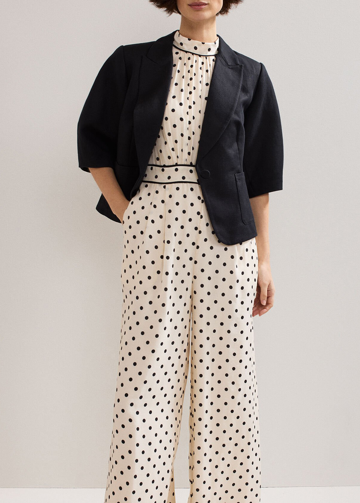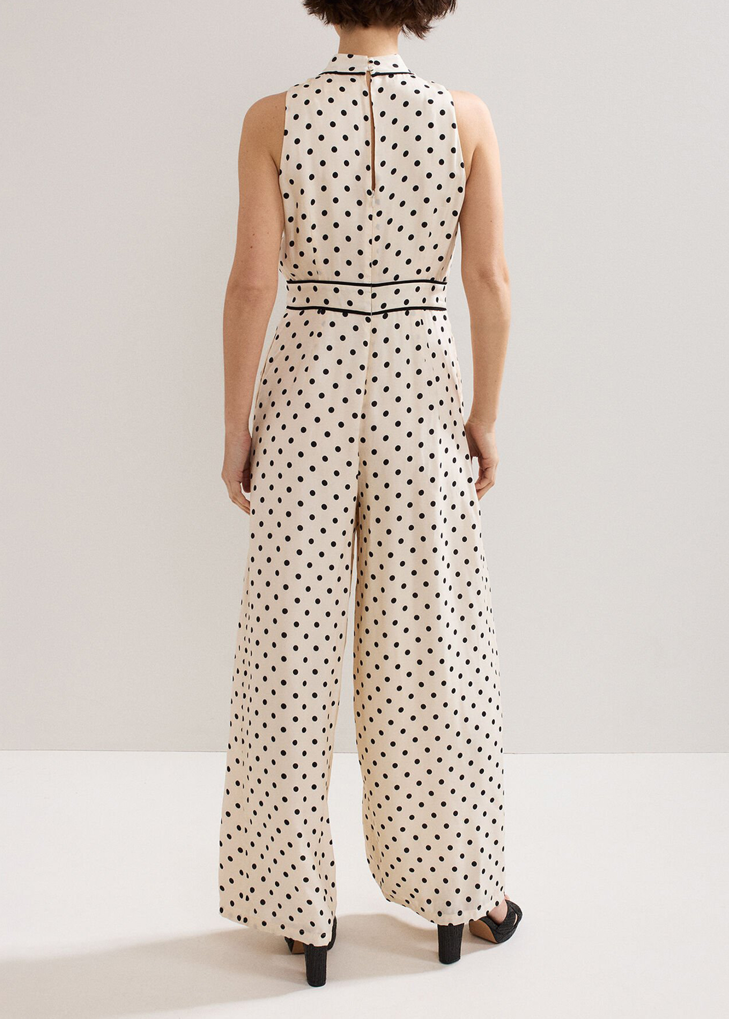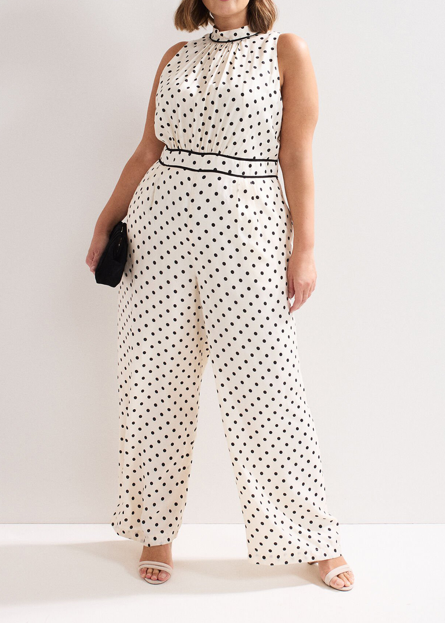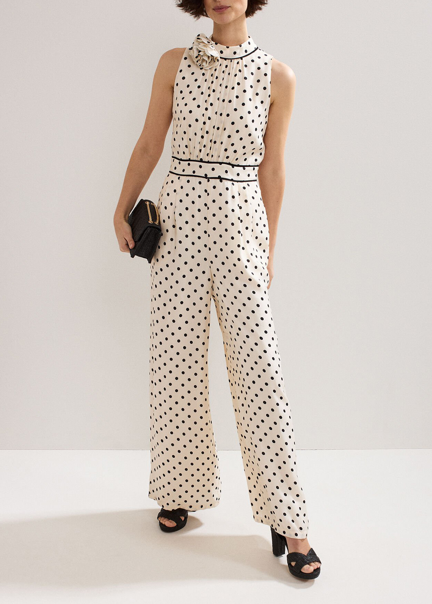 Add a touch of polka dot to your event wardrobe with our wide leg jumpsuit. The waistband detail highlights your figure for a flattering fit, perfect for wearing all day or night. Finished with a romantic floral applique at the neckline this style perfectly combines the classic and contemporary for a standout look.