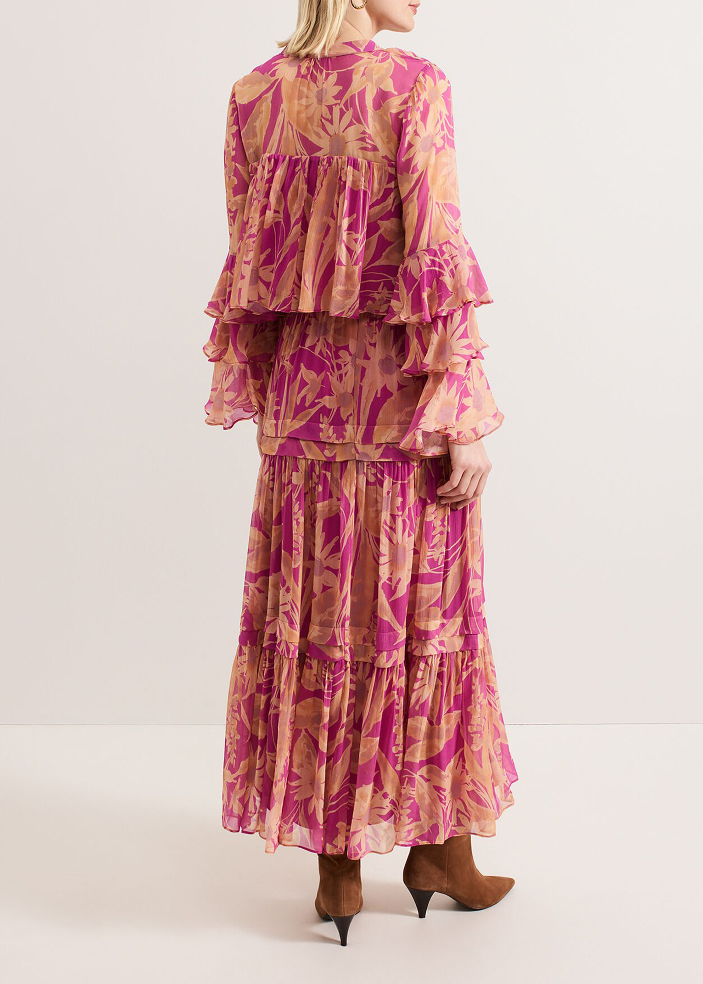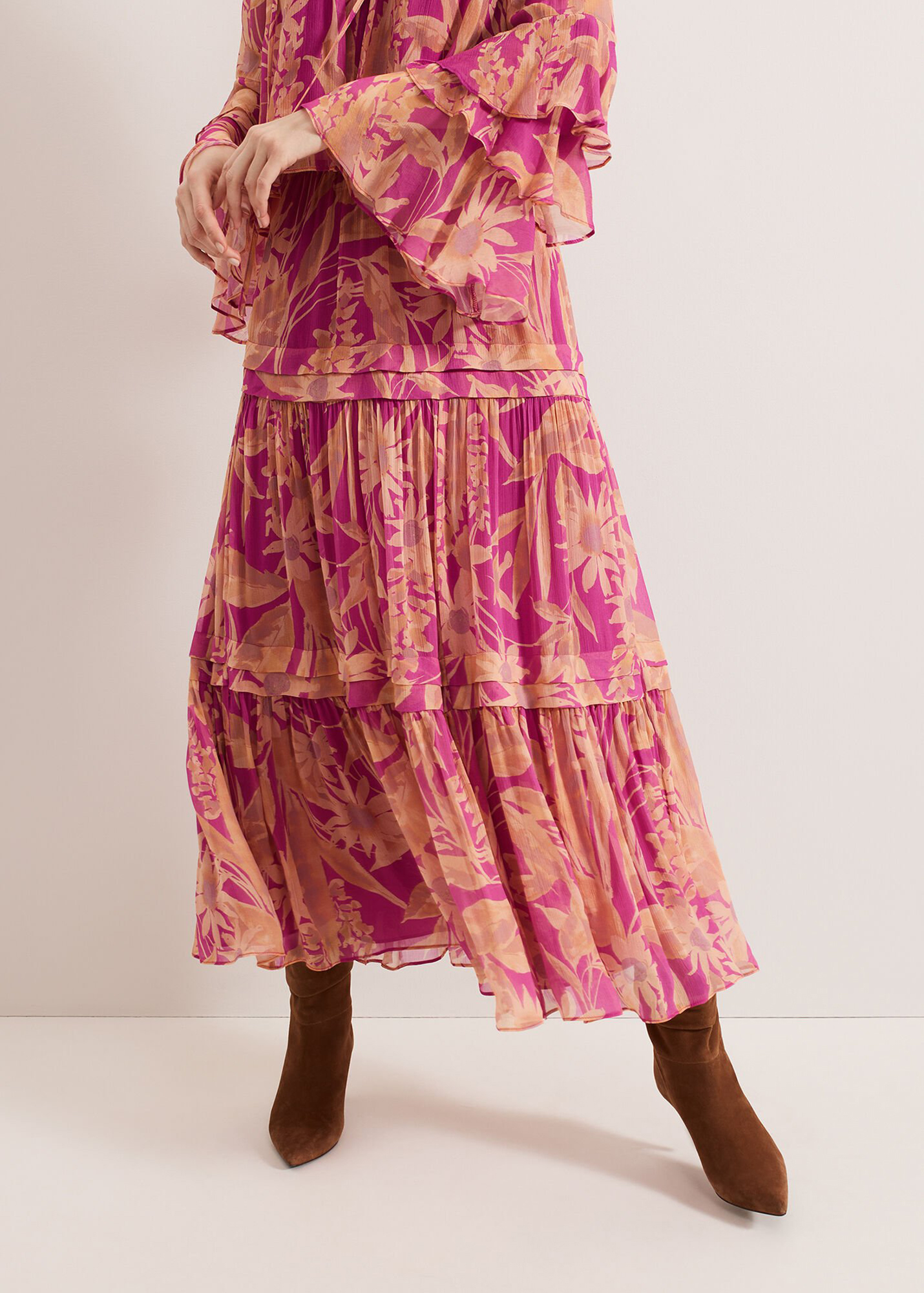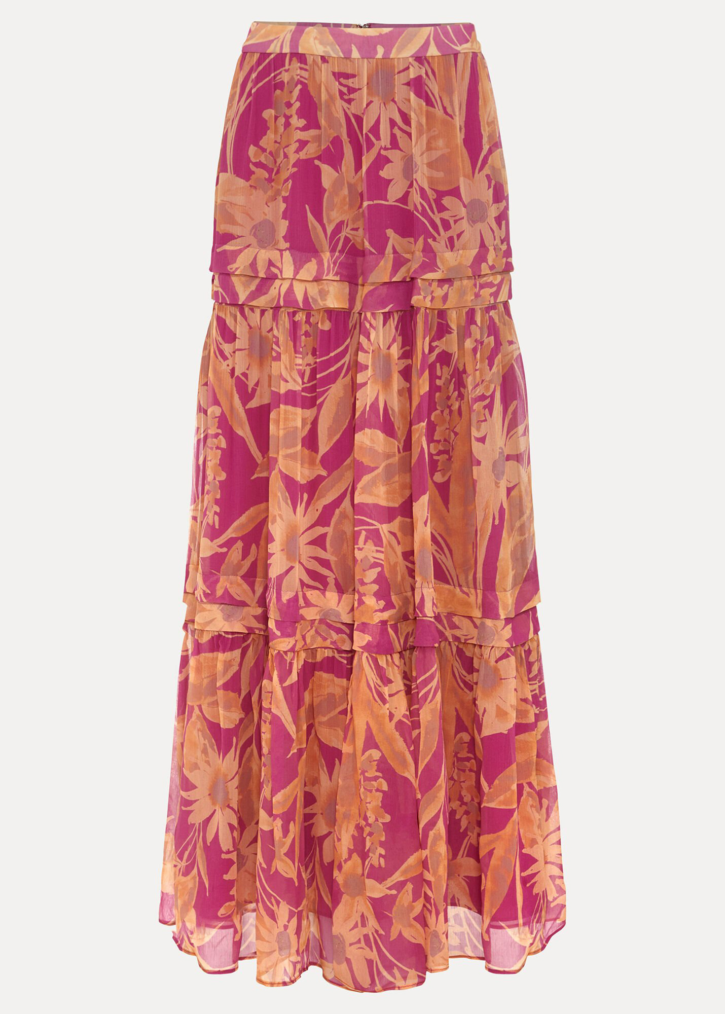 Grounded in pink and orange that will take you through the seasons, our skirt is designed with a new hand-painted sunflower inspired print. Subtly pleated for flowing movement the maxi style is exaggerated by tiered detailing. Style with our matching top for a coordinated feminine style that is sure to turn heads.