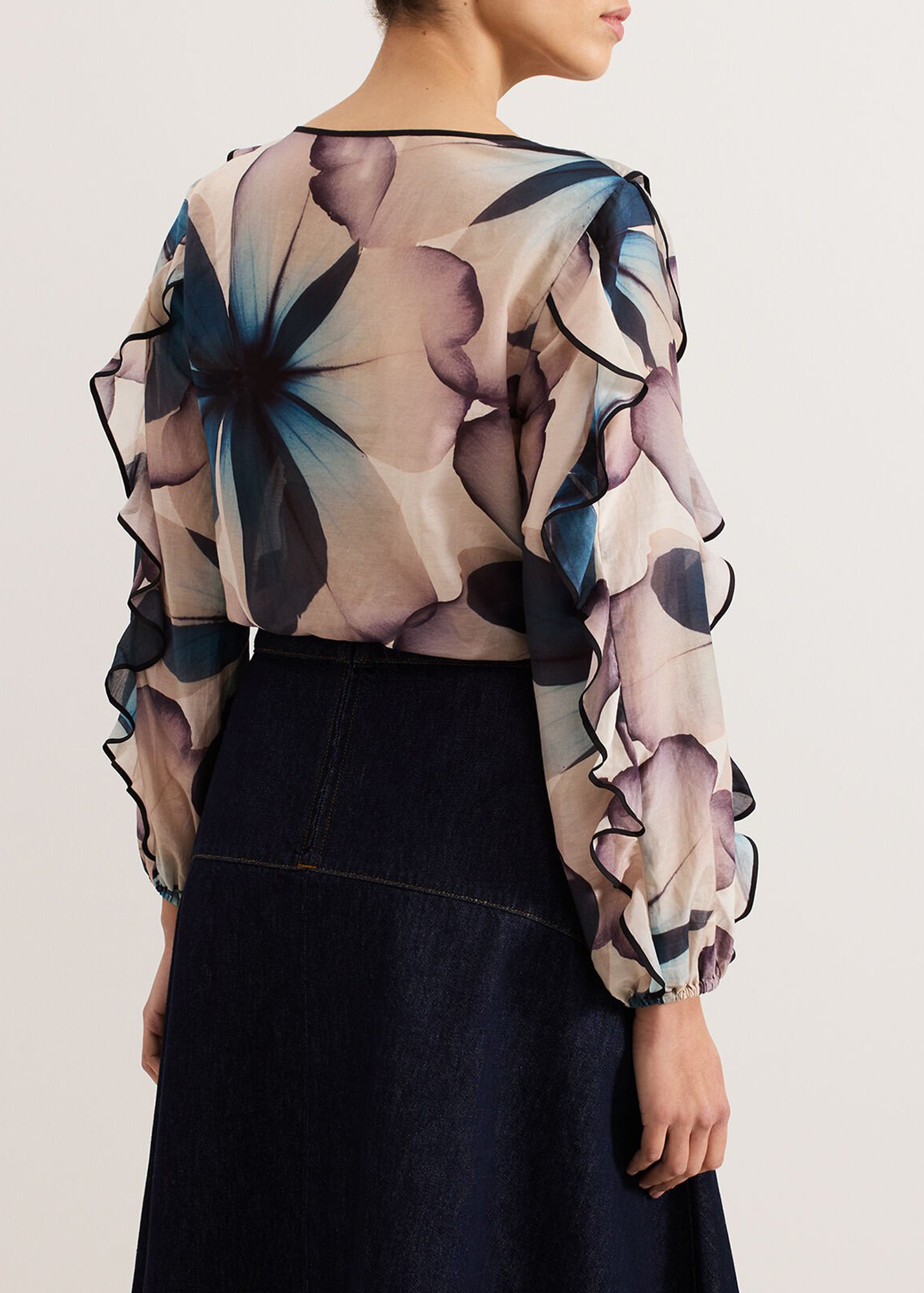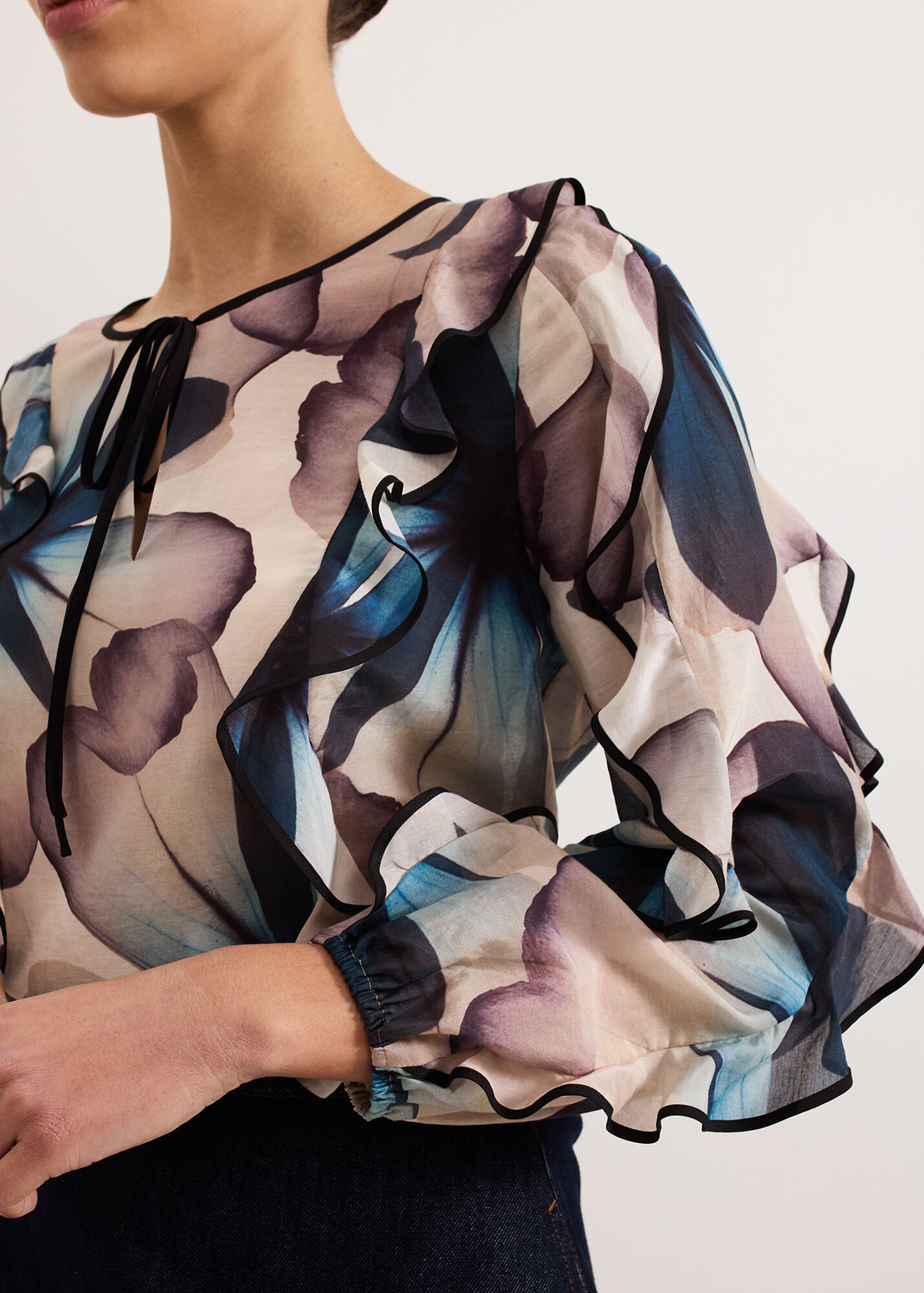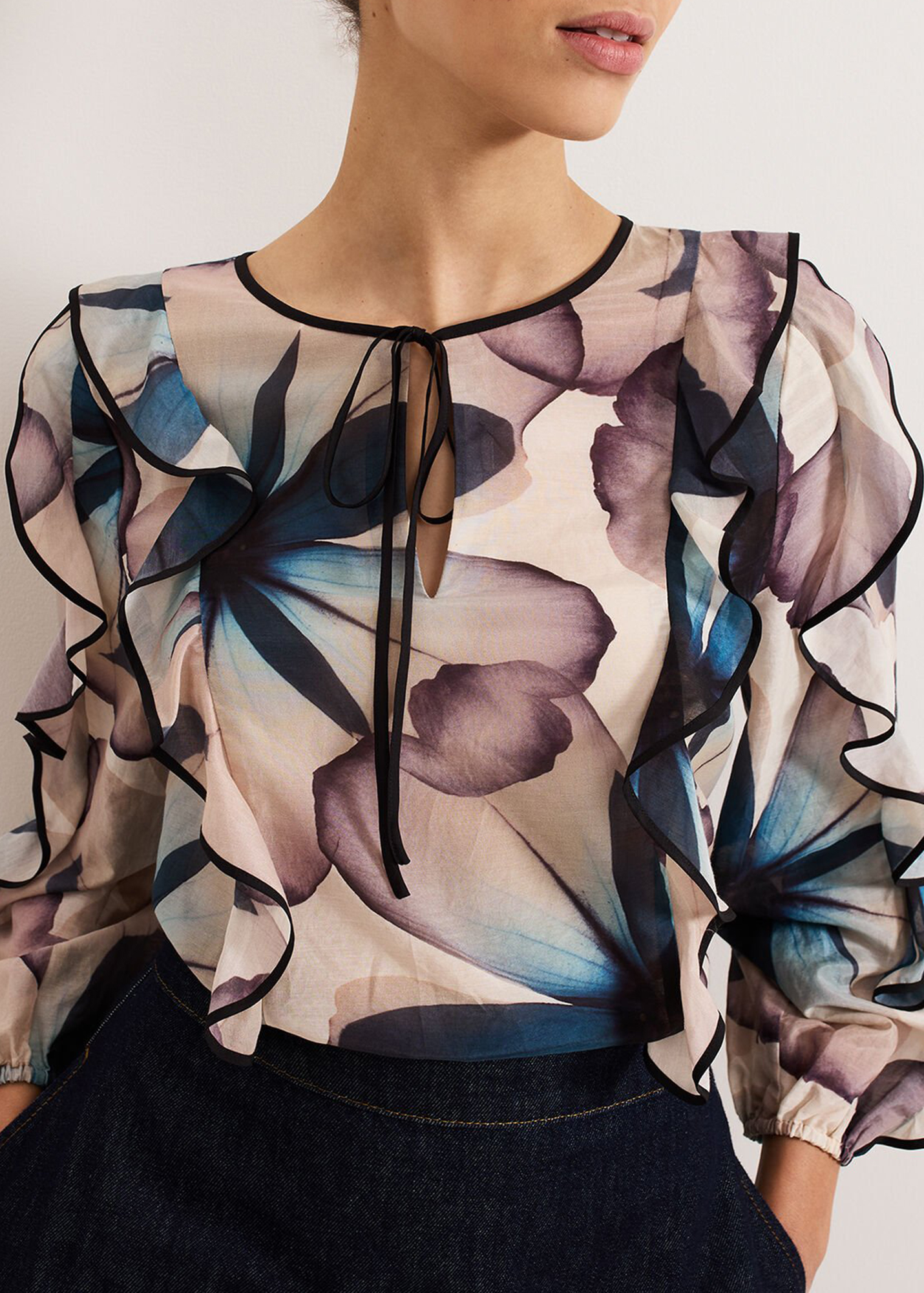 With a luxurious silk blend our Cosmos blouse is the perfect feminine style to add to your wardrobe. With hues of blue and purple the large placement floral print catches the eye, exaggerated by elegant ruffle detailing at the sides and sleeves. Finished with a contemporary tie detail at the neckline it pairs effortlessly with all your favourite separates, ideal for a work to weekend look.