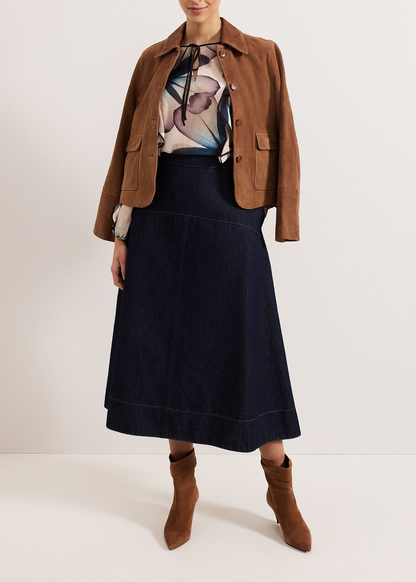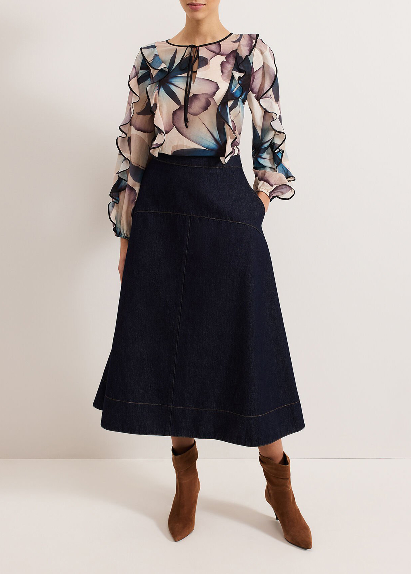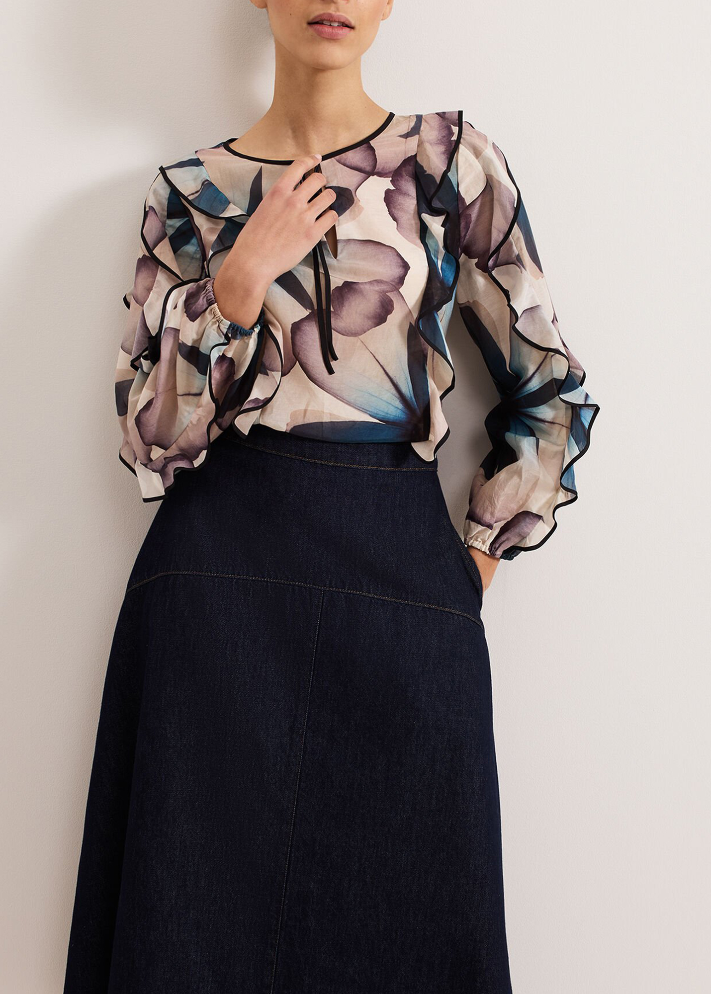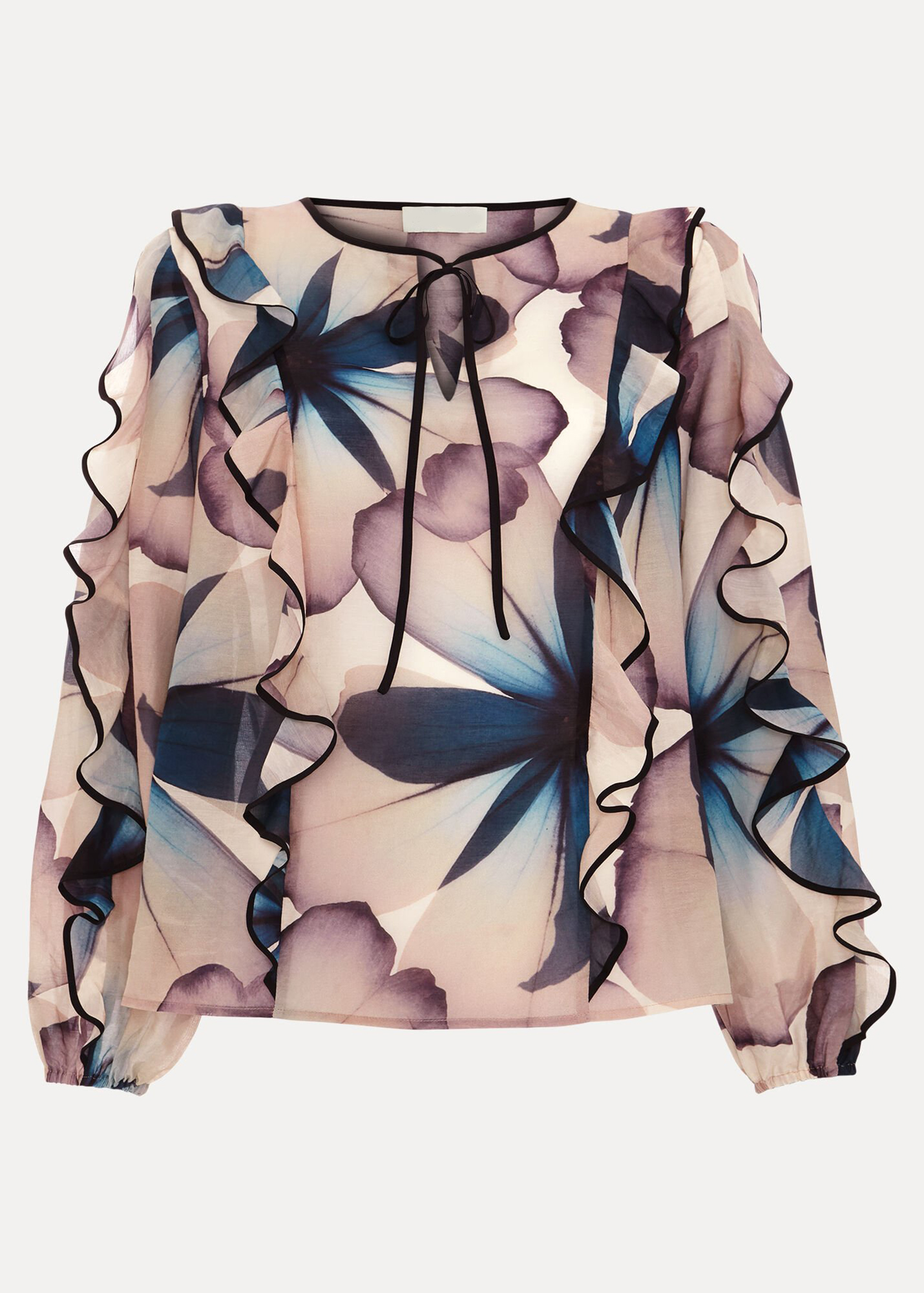 With a luxurious silk blend our Cosmos blouse is the perfect feminine style to add to your wardrobe. With hues of blue and purple the large placement floral print catches the eye, exaggerated by elegant ruffle detailing at the sides and sleeves. Finished with a contemporary tie detail at the neckline it pairs effortlessly with all your favourite separates, ideal for a work to weekend look.