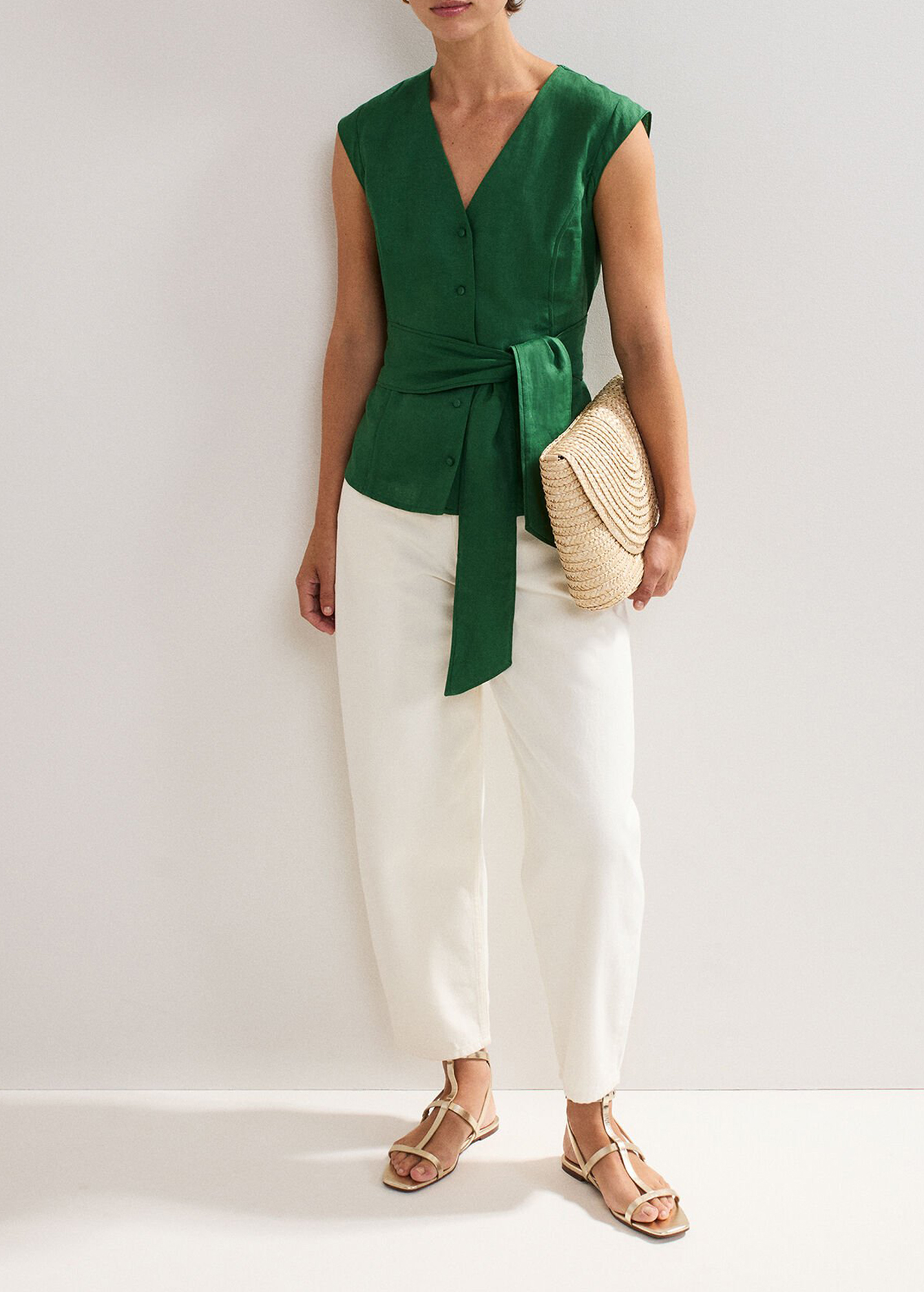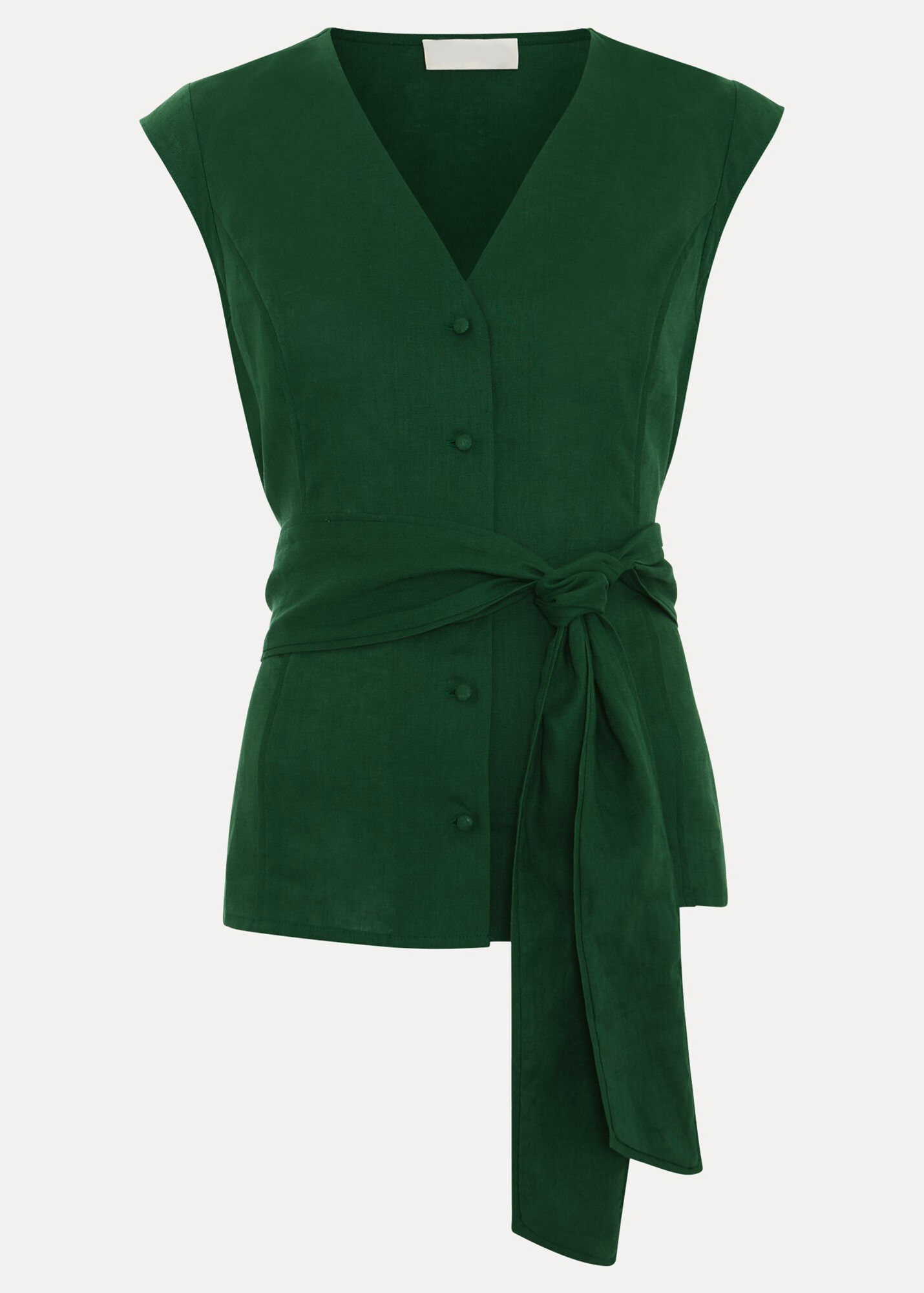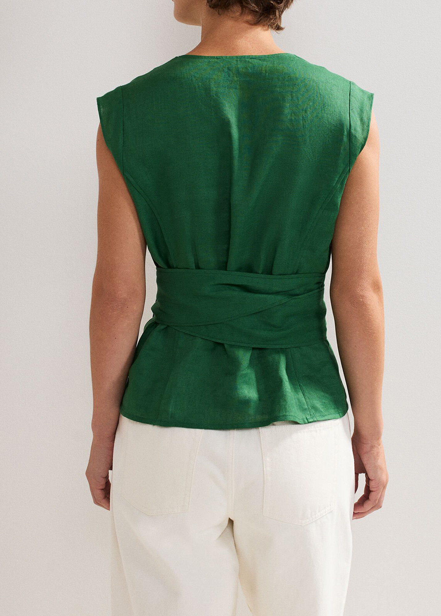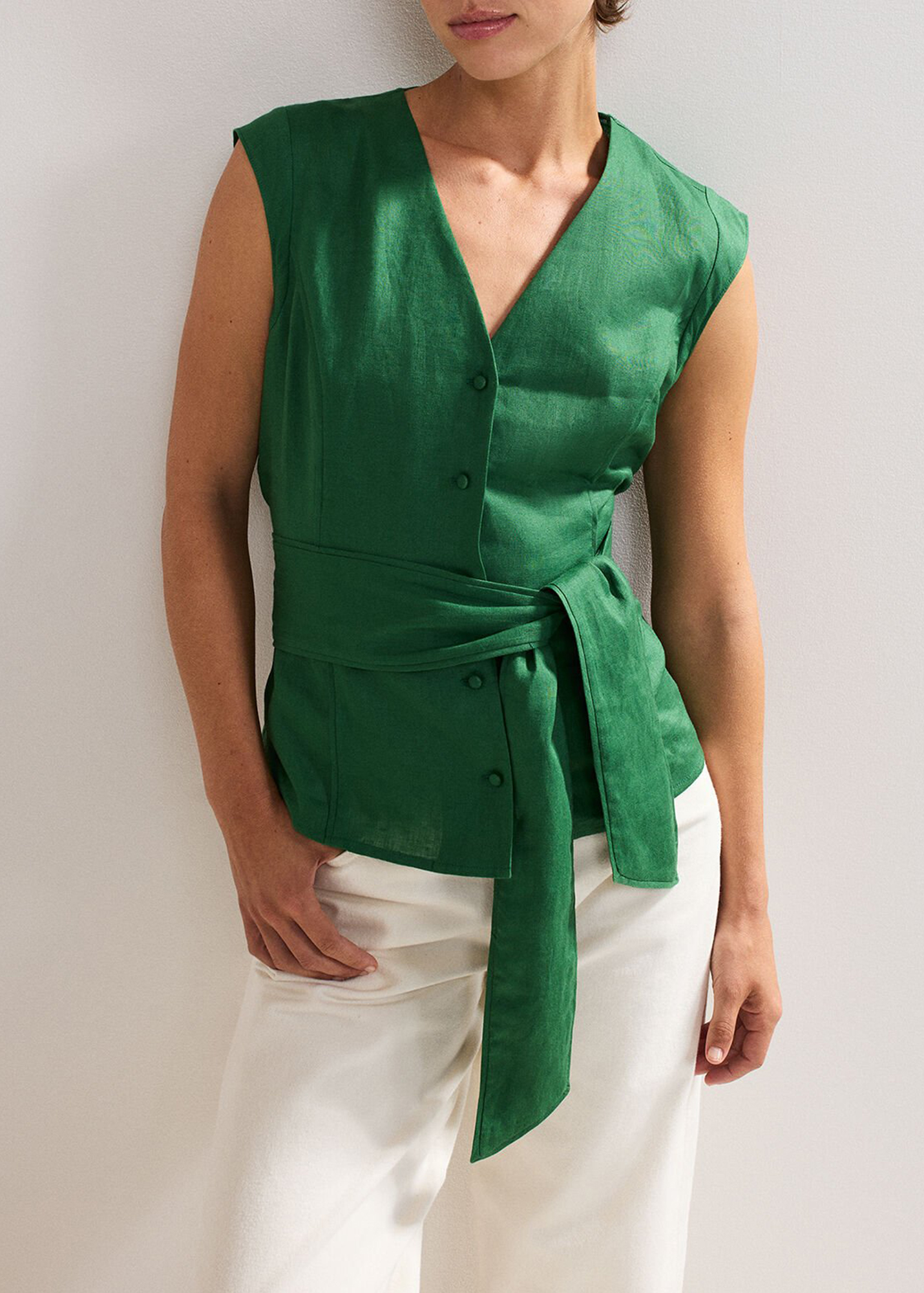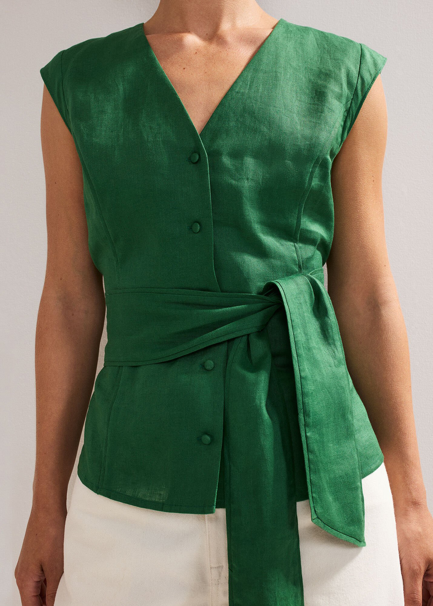 Lightweight and comfortable, this green top is made from 100% linen, making it an ideal choice for warm weather. Subtle seam details streamline the design into a modern corset silhouette and are finished with a stylish tie-belt waist. Pair it with your favorite pants and sandals for an easy, everyday look.
