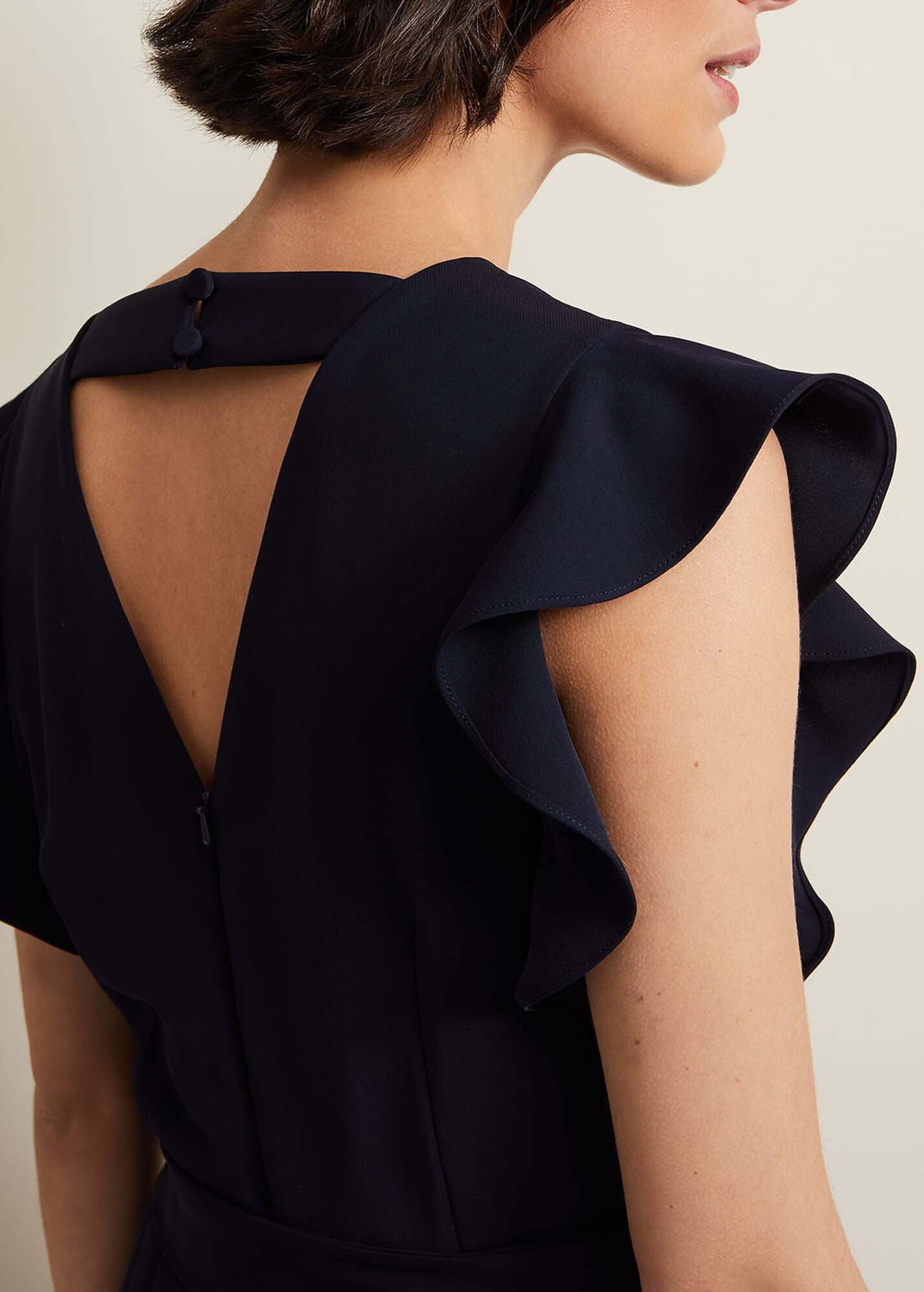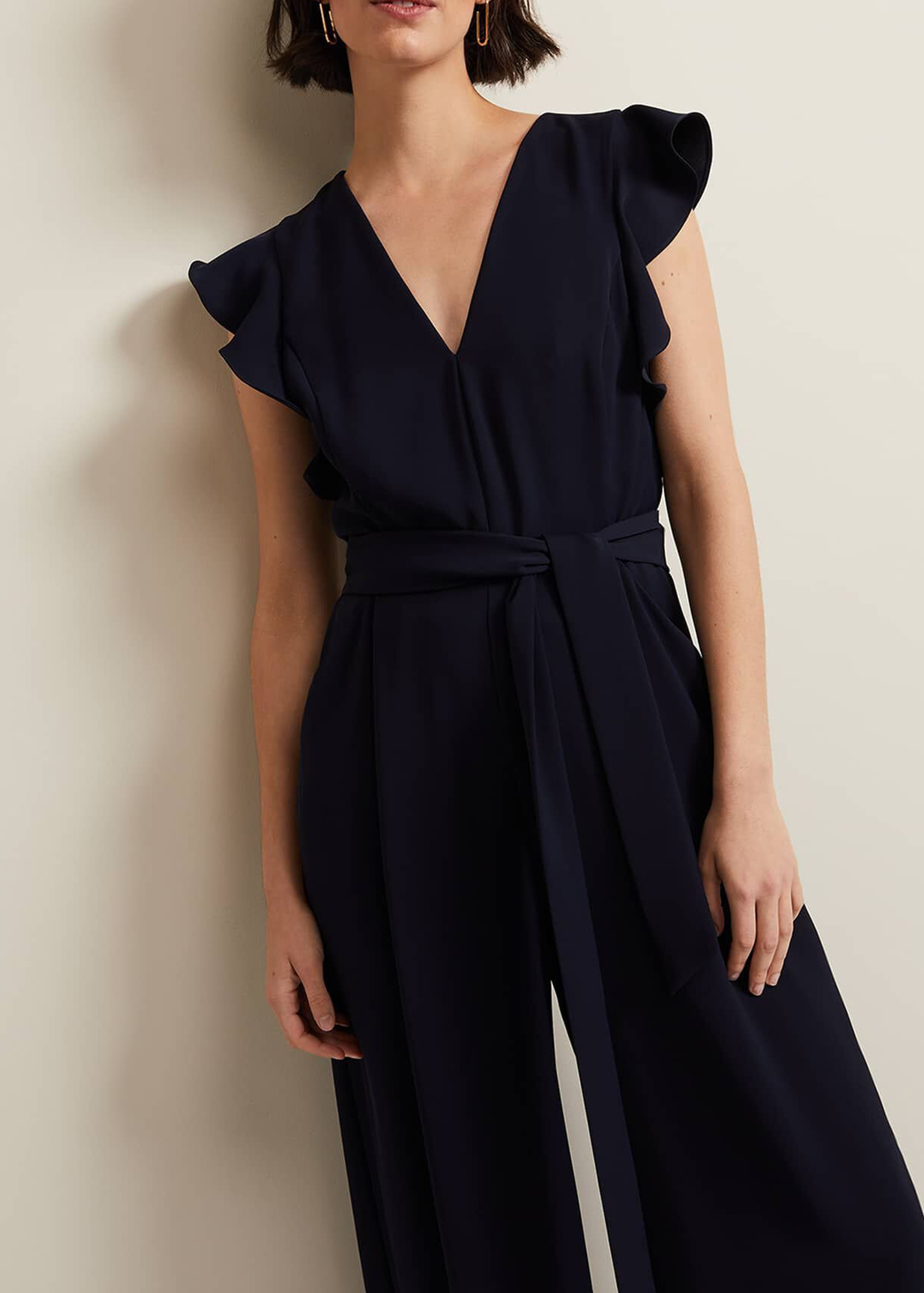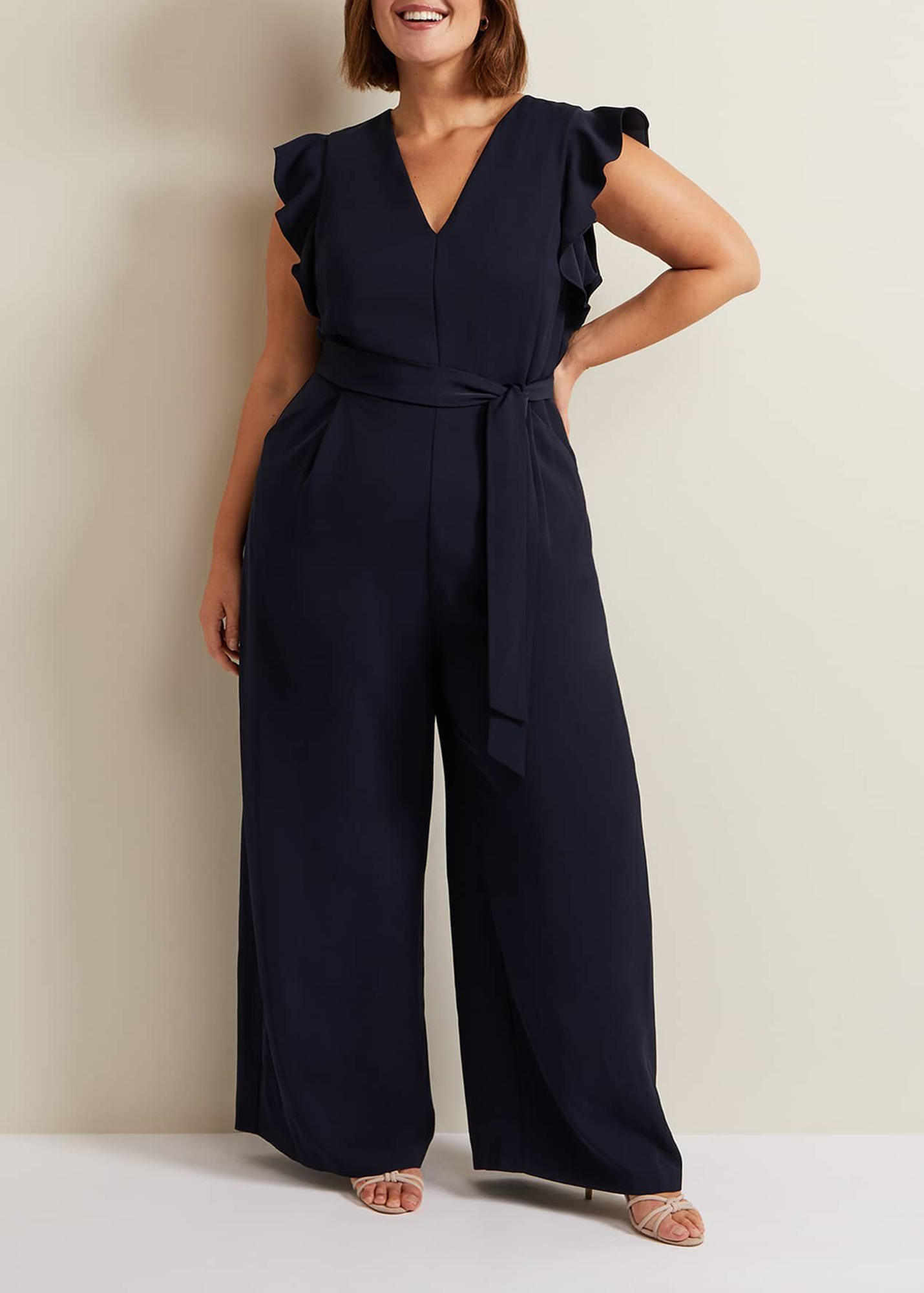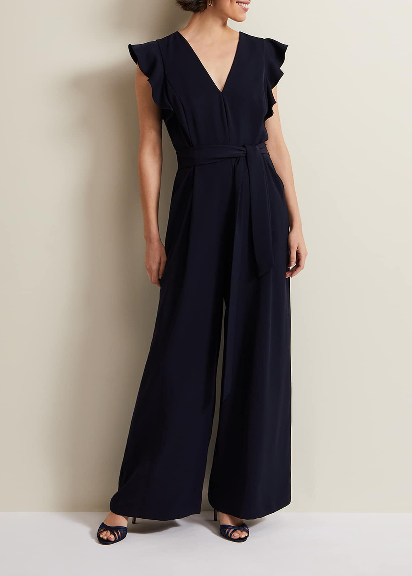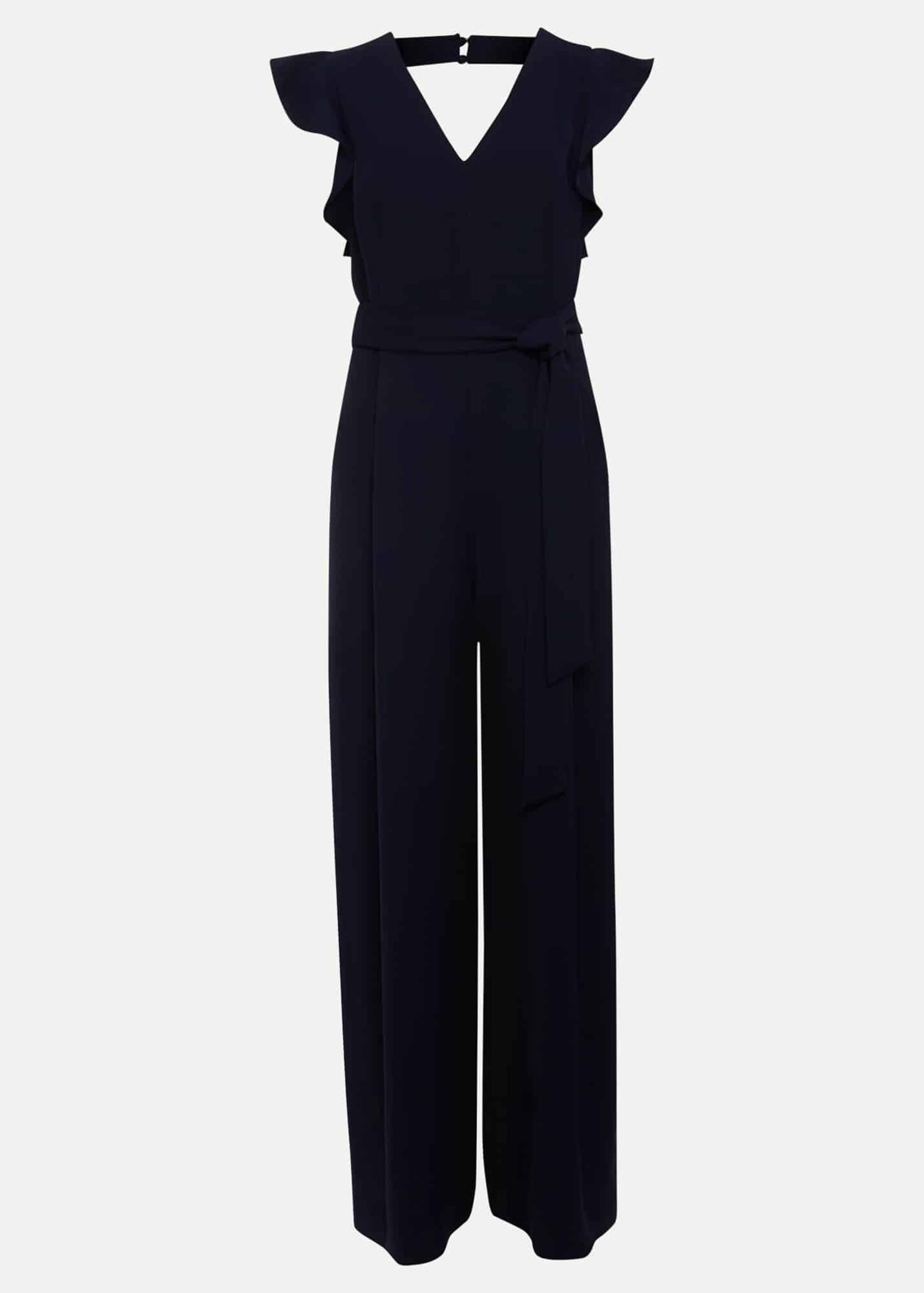 A timeless, contemporary occasion jumpsuit. Designed in a deep navy shade, our jumpsuit features a feminine V-neckline that's framed by frill detailing. It falls to a wide leg silhouette. Wear with heels and a matching clutch to your next special event. Also available in our Petite Collection.