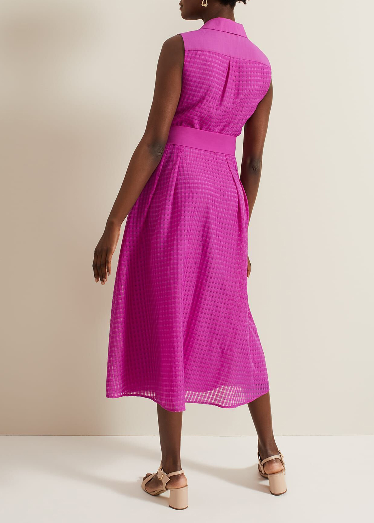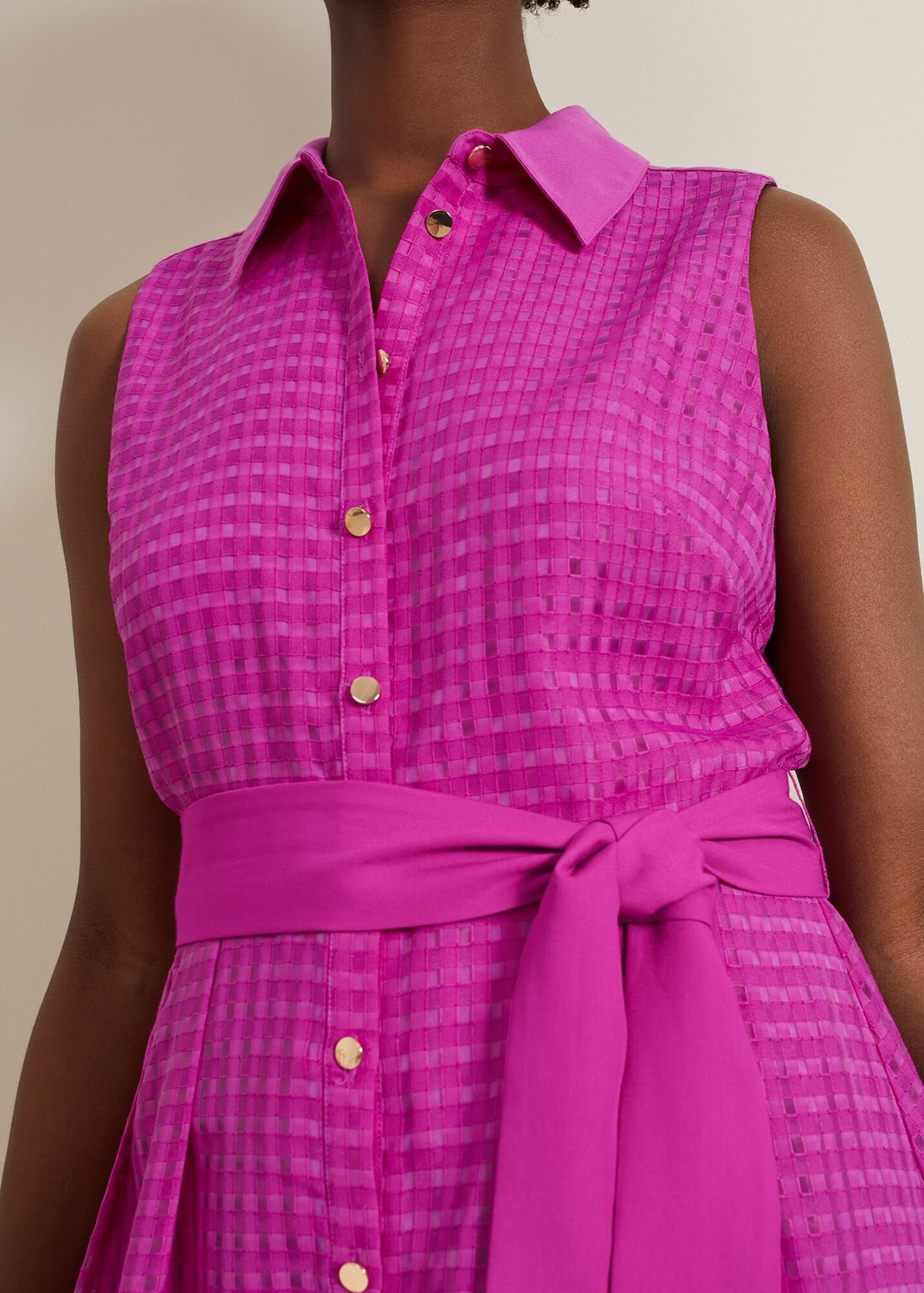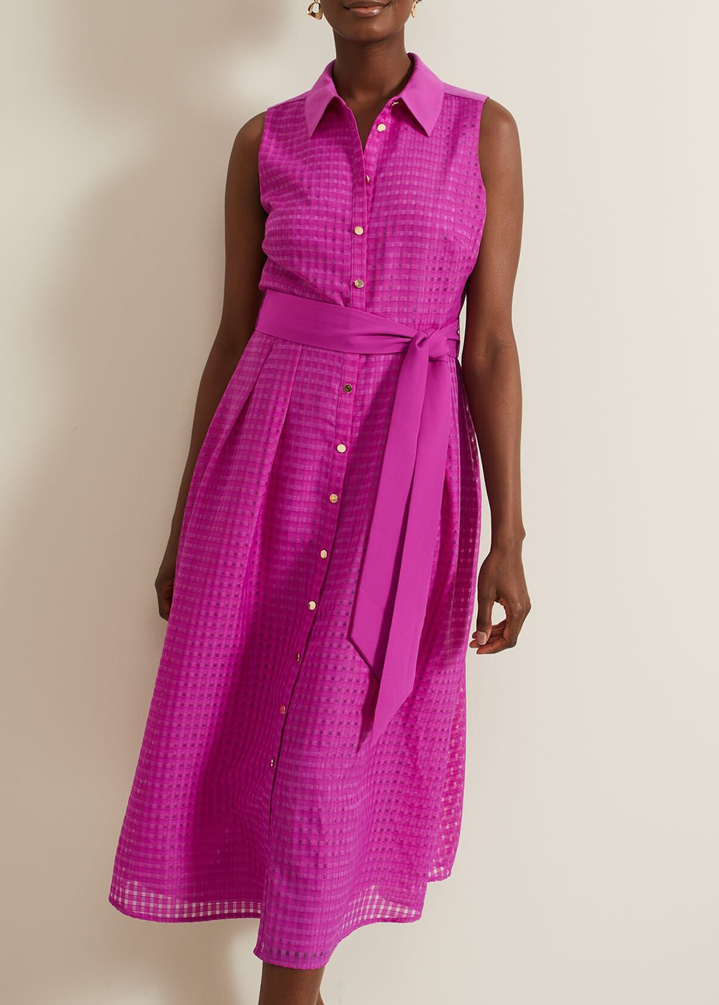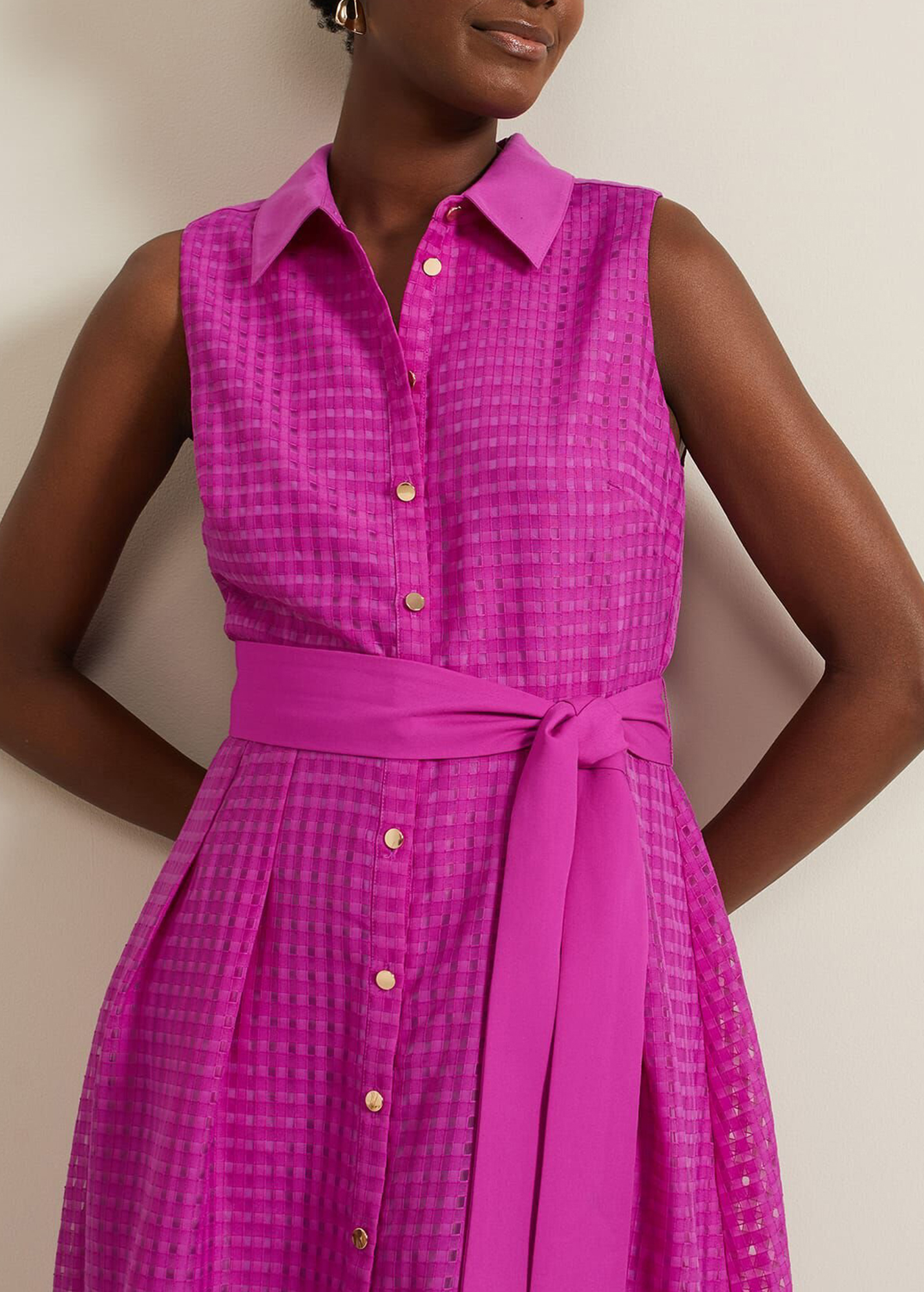 Feel bold in our pink sleeveless midi dress. Our dress is designed in a contemporary textured pattern and features button down detailing with a belt to accentuate your waist.