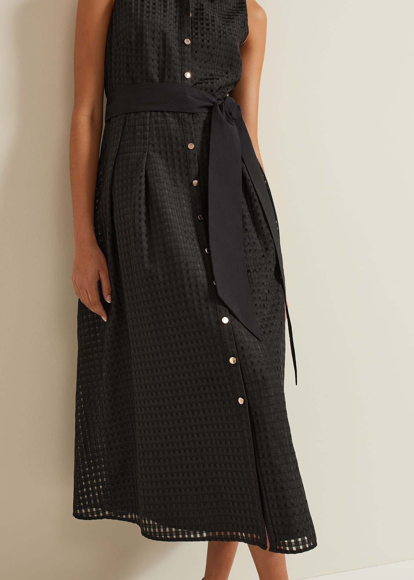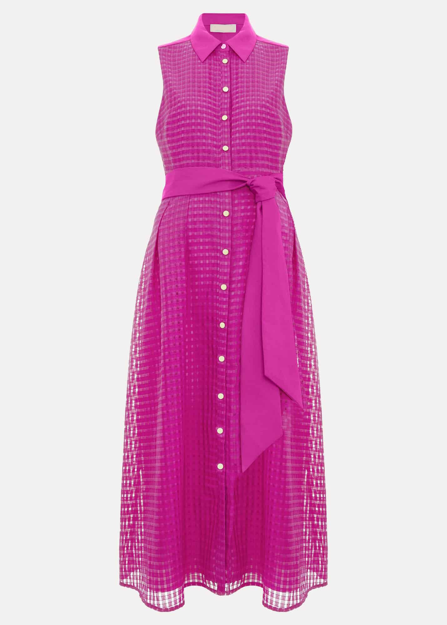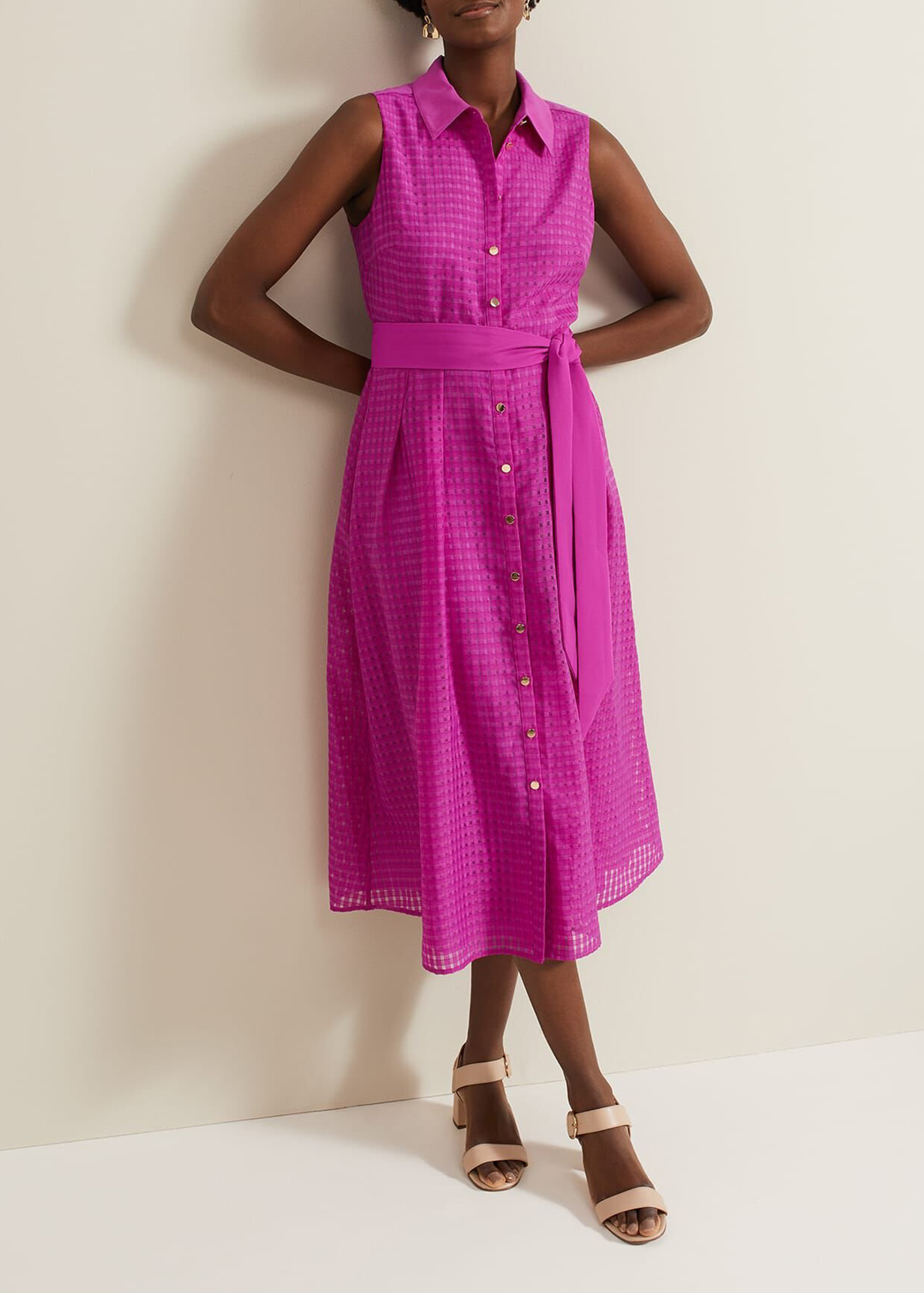 Feel bold in our pink sleeveless midi dress. Our dress is designed in a contemporary textured pattern and features button down detailing with a belt to accentuate your waist.