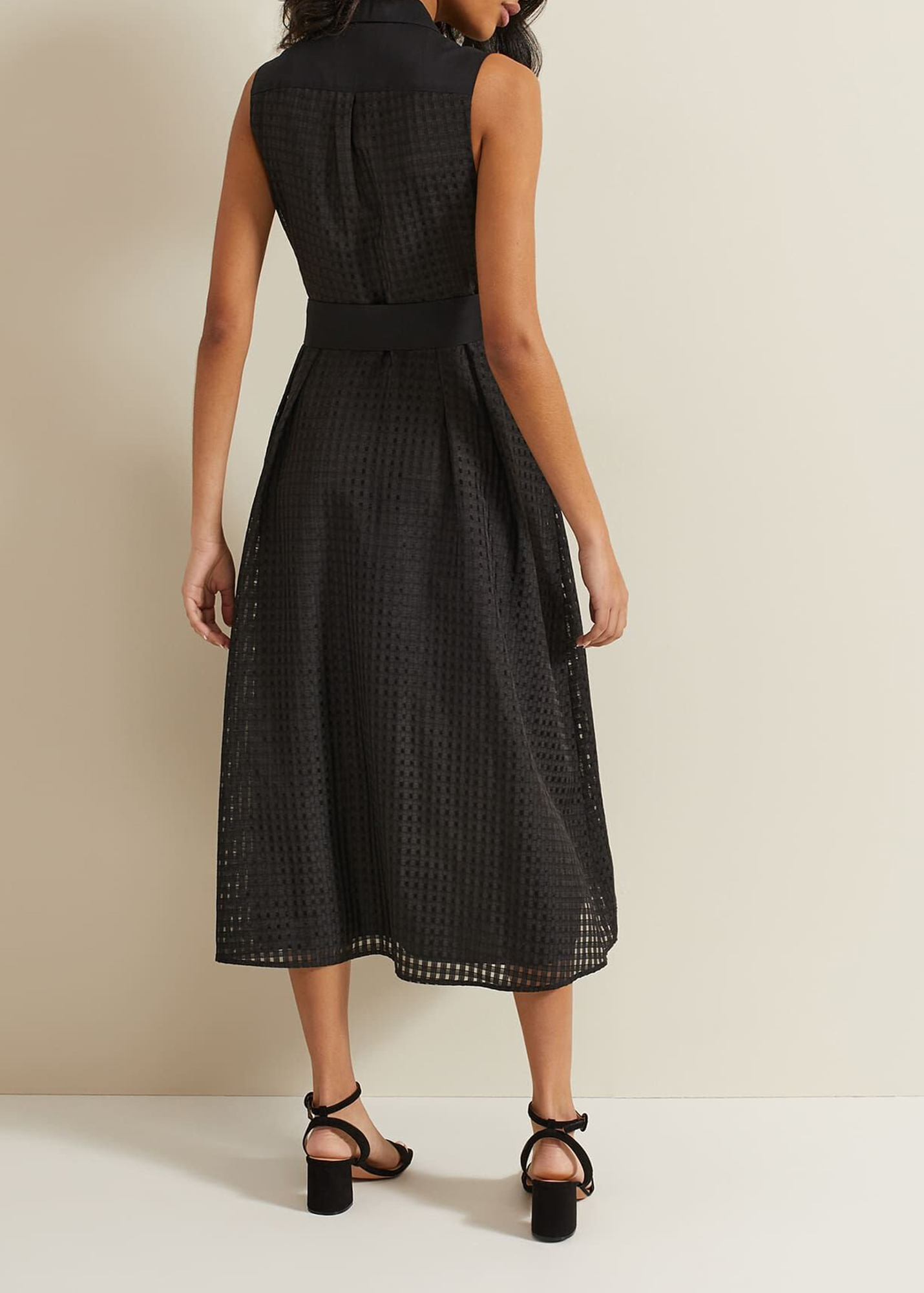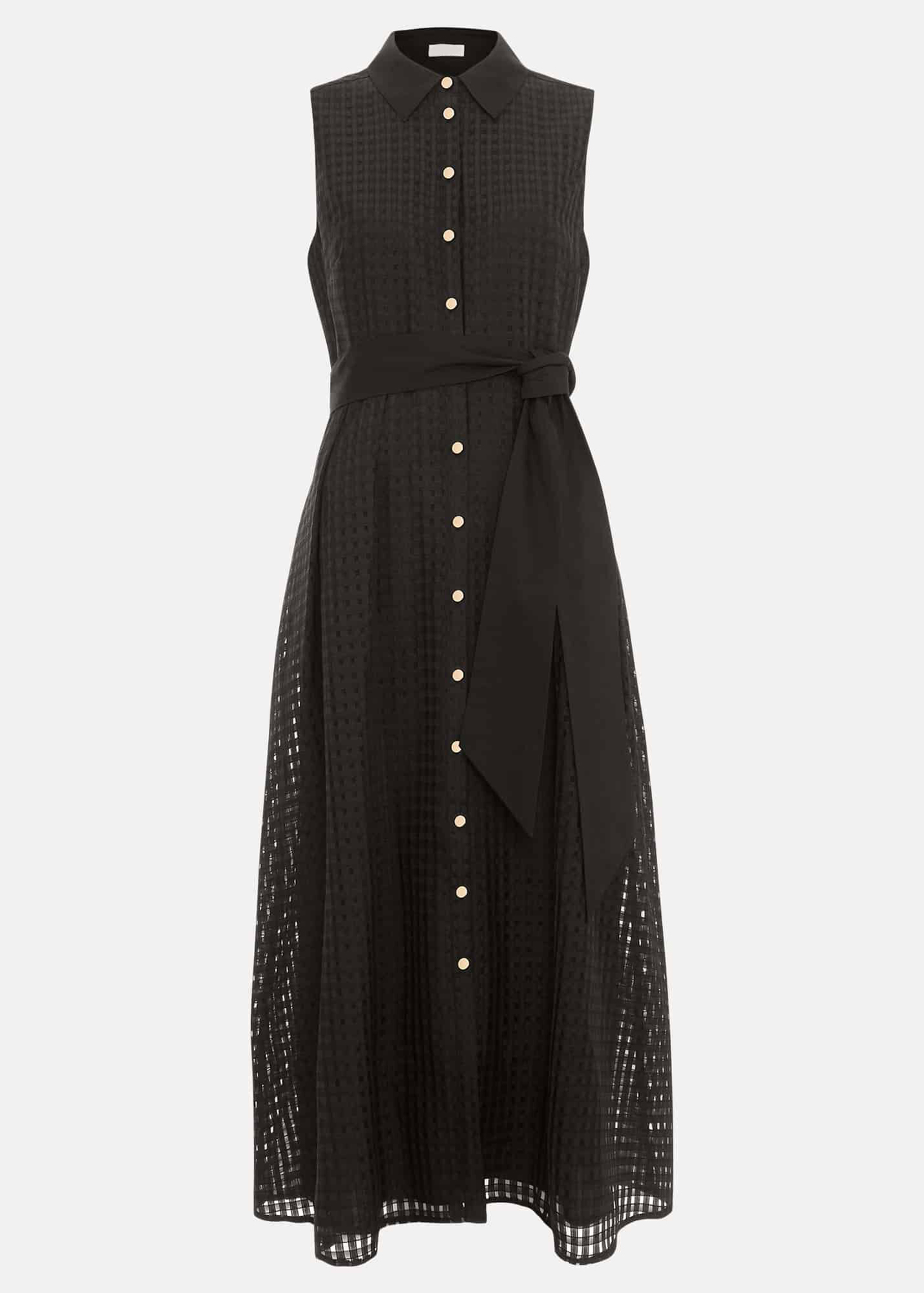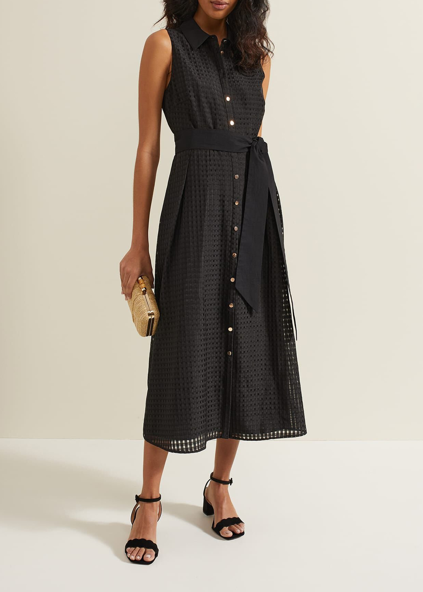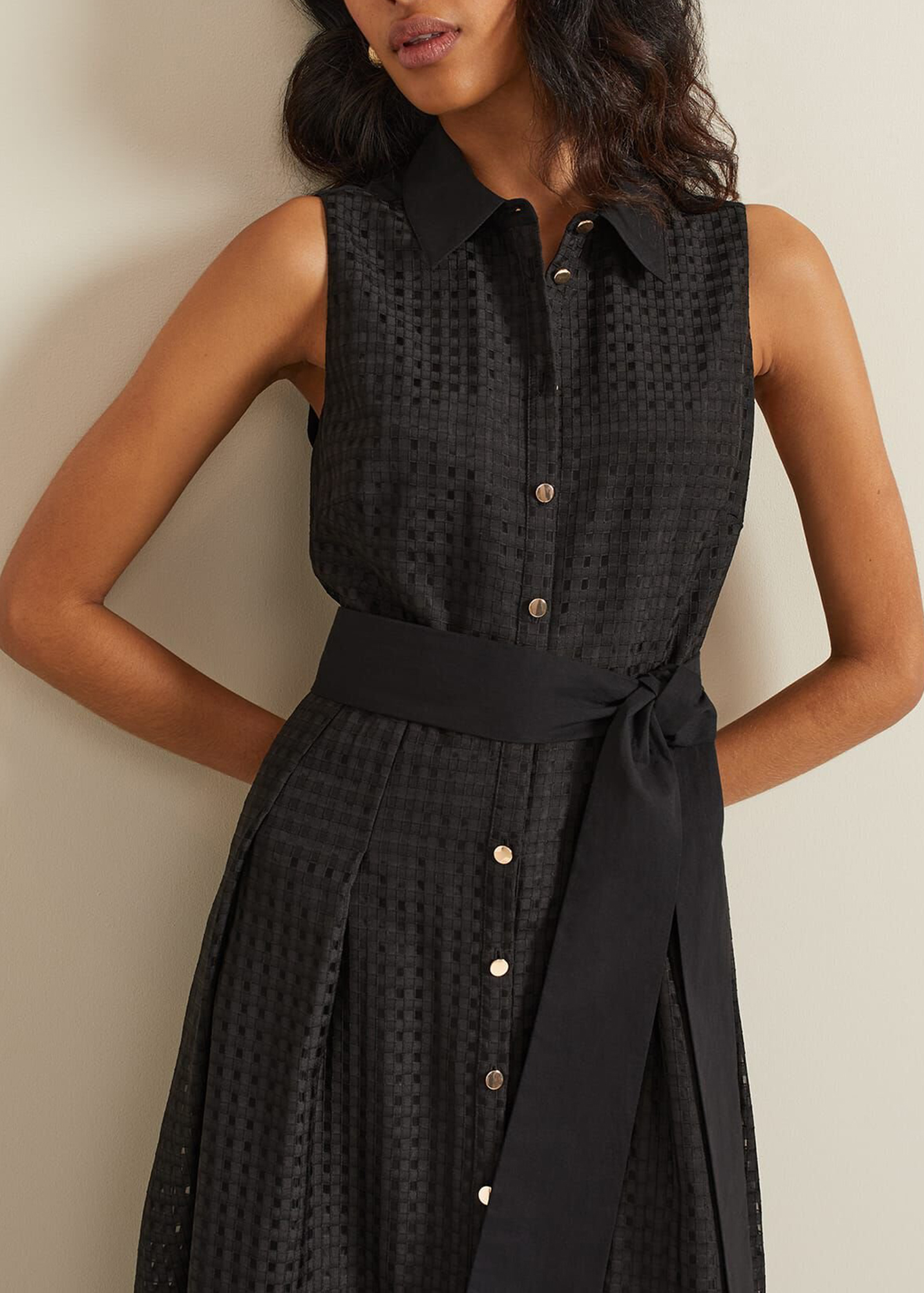 Feel bold in our pink sleeveless midi dress. Our dress is designed in a contemporary textured pattern and features button down detailing with a belt to accentuate your waist.