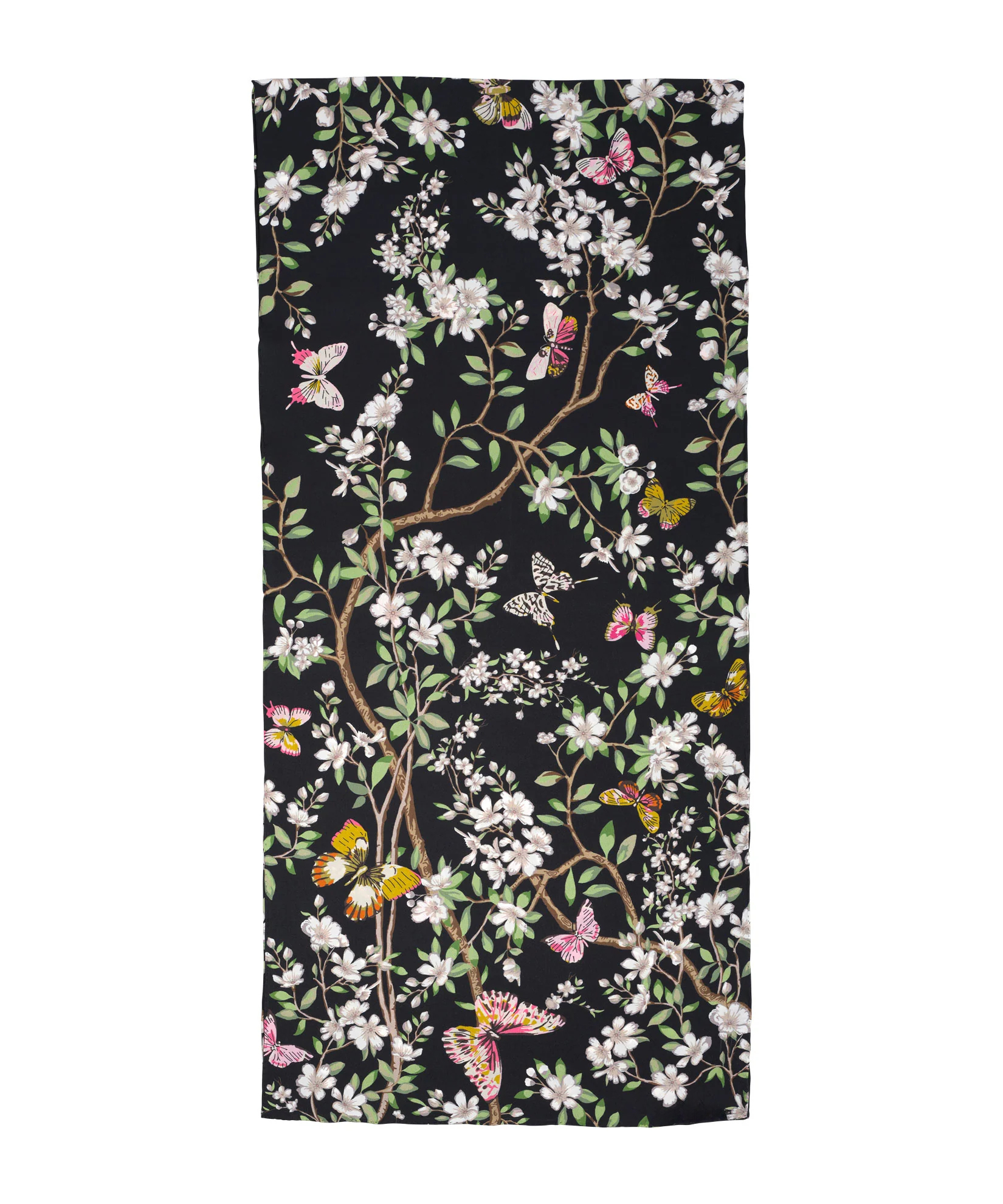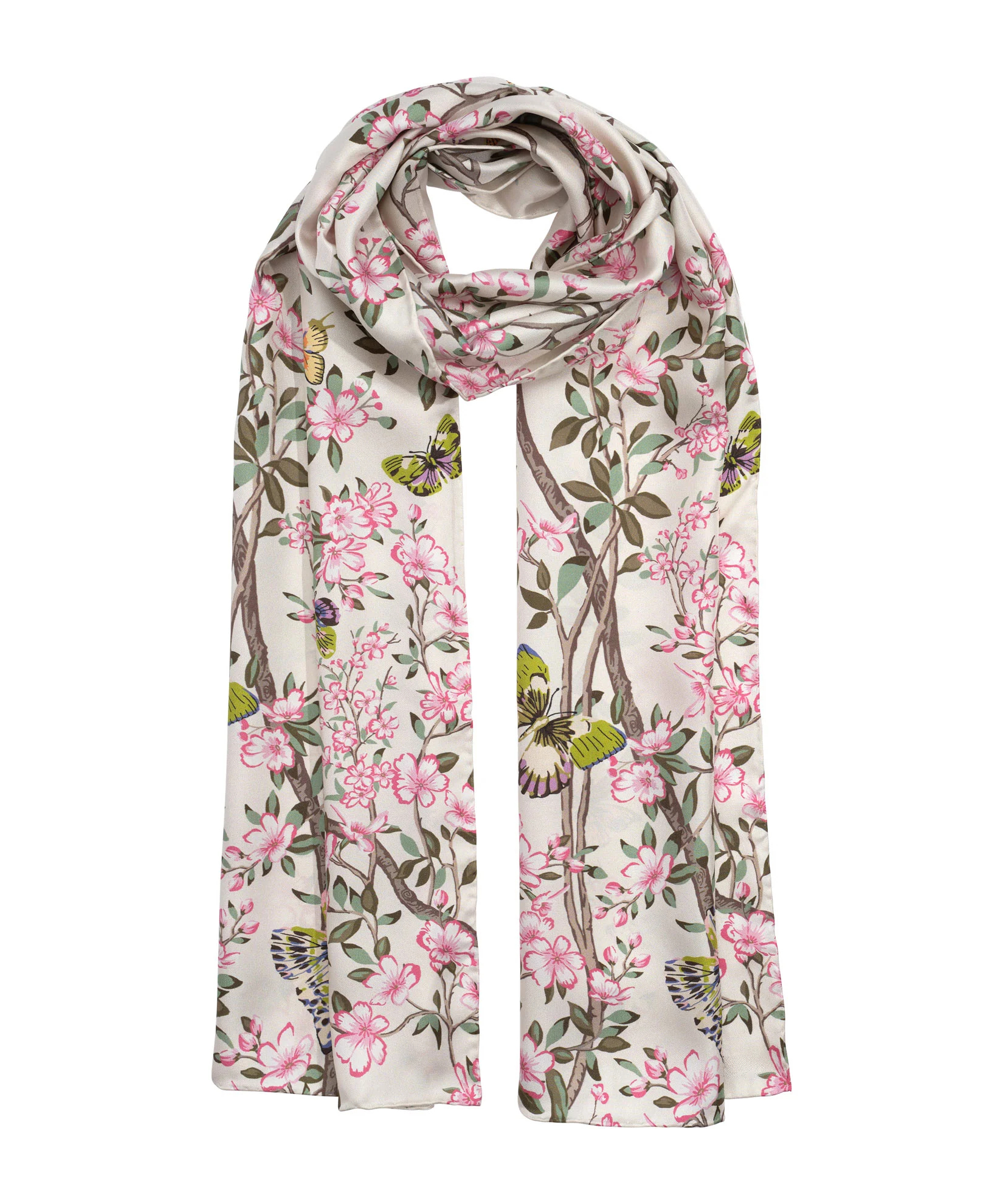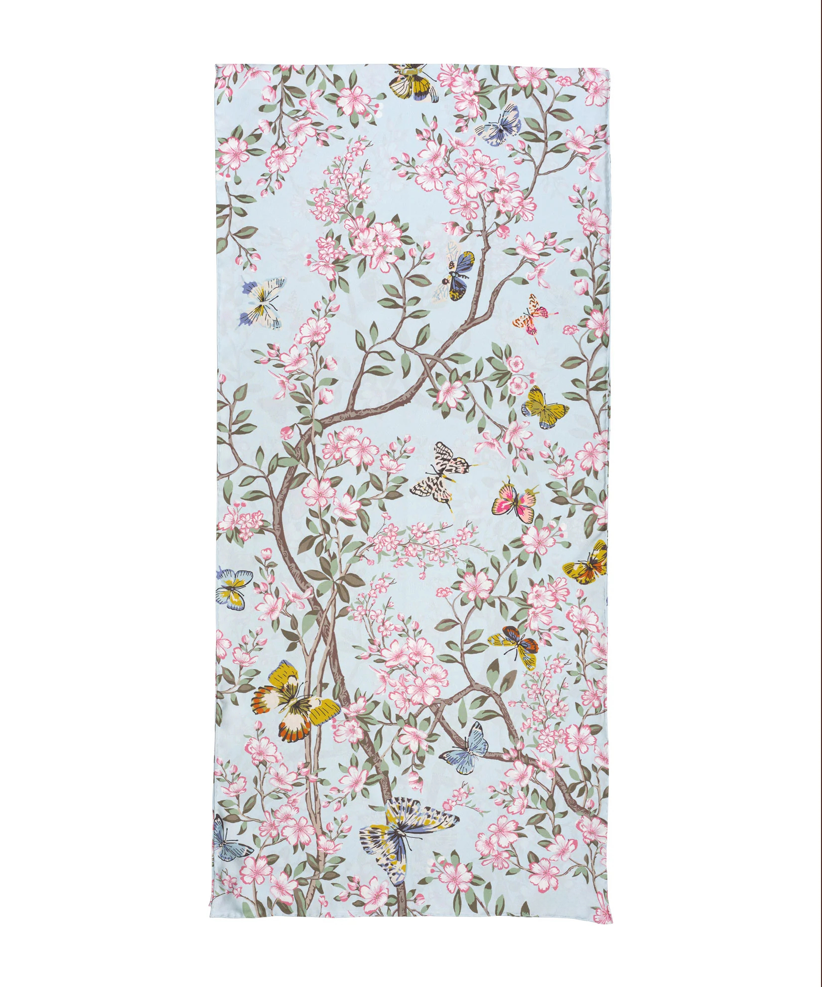 This silk oblong scarf features a cherry blossom scene; a tribute to the concept of fleeting time and living in the present.