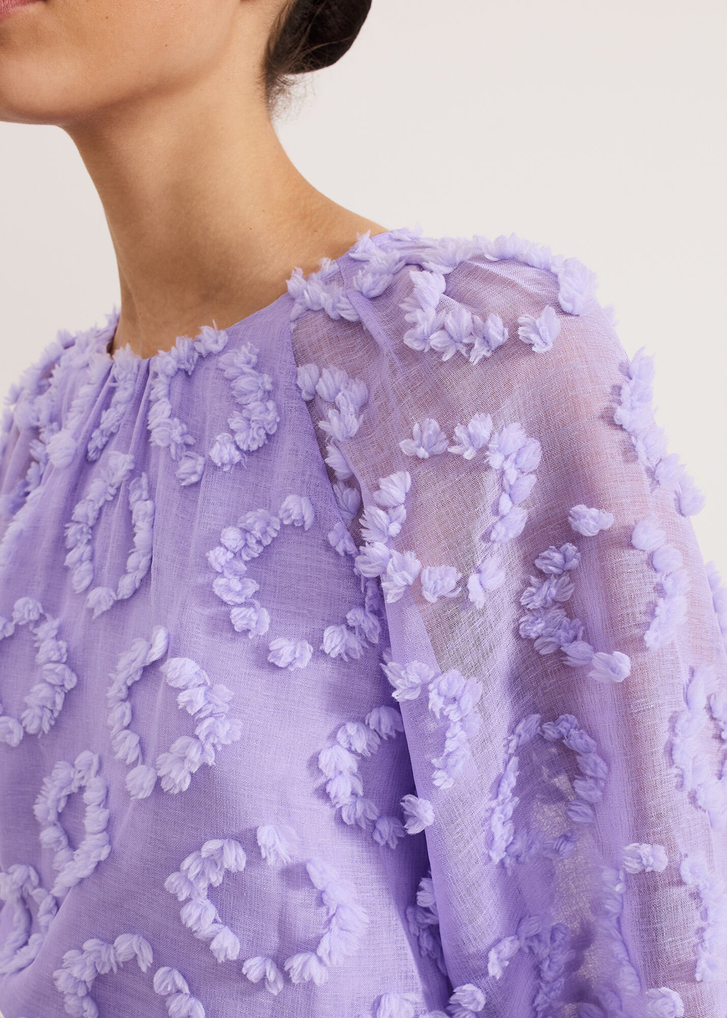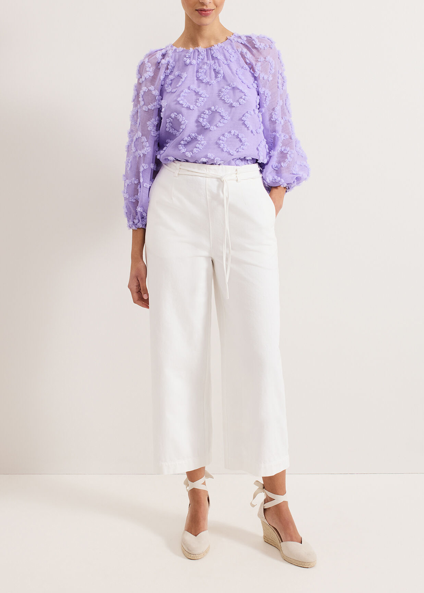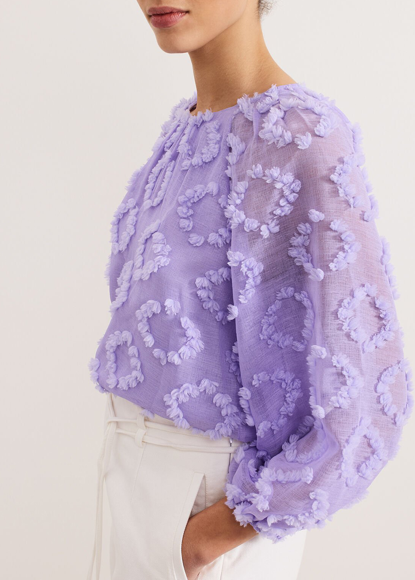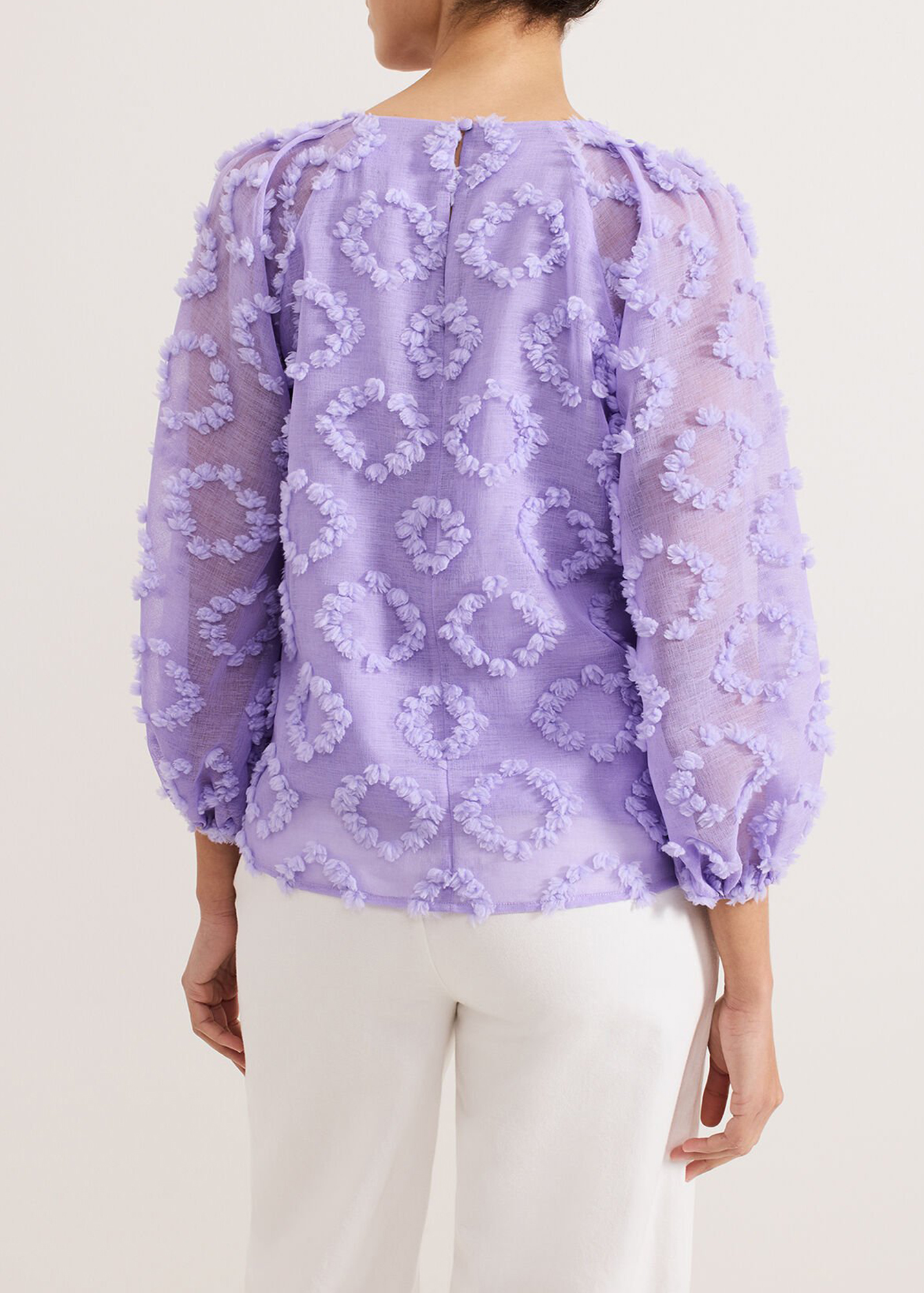 Cinched cuffs add volume to the semi-sheer blouson sleeves for an elevated look whilst a textured diamond design gives this blouse a contemporary edge. Style with your favourite denim and accessorize with flats or heels for a day to night look.